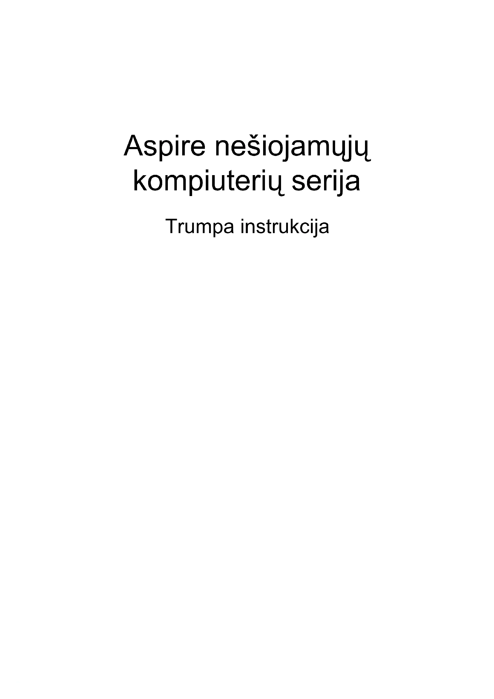 4Aspire nešiojamųjų kompiuterių serija Trumpa instrukcijaModelio numeris: _______________________________ Serijos numeris: ________________________________ Pirkimo data: __________________________________ Pirkimo vieta: __________________________________ © 2010 Visos teisės saugomos. Aspire nešiojamųjų kompiuterių serijos trumpa instrukcija Pirmasis leidimas: 07/20103 Dalykai, kuriuos reikia atlikti pirmiausia Leiskite padėkoti, kad pasirinkote „Acer“ nešiojamąjDž kompiuterDž – tikimės Jūsų nenuvilti ir užtikrinti visus nešiojamojo kompiuterio teikiamus privalumus. Instrukcijos Jums Tam, kad palengvintume Jums naudojimąsi „Acer“ kompiuteriu, parengėme kelias instrukcijas: Pirmoji yra sąrankos plakatas - ši informacija padės pirmosiomis kompiuterio naudojimo minutėmis. „Aspire“ bendrojoje naudojimo instrukcijoje pateikiama naudinga informacija apie visų Aspire gaminių serijos modelių kompiuterius. Jis apima bendruosius klausimus, kaip, pvz. klaviatūros ir audio sistemos naudojimas ir t.t. Prašome atkreipti dėmesDž Dž tai, jog dėl savo pobūdžio Bendrojoje naudojimo instrukcijoje bei AcerSystem User Guide, kuris bus minimas toliau, kartais bus aptariamos funkcijos ar ypatybės, būdingos tik konkretiems šios serijos modeliams ir nebūtinai tam modeliui, kurDž jūs Džsigijote. Tokiais atvejais atitinkamose teksto vietose yra prierašais „tik tam tikruose modeliuose“. Trumpa instrukcija pateikiama informacija apie pagrindines Jūsų Džsigyto kompiuterio savybes ir funkcijas. Išsamesnės informacijos apie tai, kaip padaryti kompiuterDž produktyvesniu, rasite AcerSystem User Guide. Šioje instrukcijoje išsamiai aprašoma tokia informacija, kaip sisteminiai failai, duomenų atstatymas, kompiuterio galimybių praplėtimas ir gedimų diagnostika. Be to, šioje instrukcijoje yra ir garantinė informaciją, bendrieji reikalavimai ir su sauga susiję Džspė jimai. Ši instrukcija yra „Portable Document Format (PDF)“ formate ir ji jau bus kompiuteryje. Jei norite peržiūrėti šią instrukciją: 1 Spauskite Start (pradėti) > All Programs (visos programos) > AcerSystem. 2 Spauskite AcerSystem User Guide. Pastaba: Failo peržiūrai reikės „Adobe Reader“. Jei kompiuteryje nėra „Adobe Reader“, paspaudus ant AcerSystem User Guide bus pirmiausiai paleistas „Adobe Reader“ Dždiegimas. Vadovaukitės ekrane esančiomis instrukcijomis Dždiegimo užbaigimui. Instrukcijų dėl „Adobe Reader“ naudojimosi ieškokite „Help and Support“ (Žinynas ir pagalba) meniu.4 Lietuviškai Ekskursija po jūsų Acer nešiojamąjDž kompiuterDž Atlikus kompiuterio sąranką kaip parodyta sąrankos plakate, leiskite jus supažindinti su jūsų naujuoju „Acer“ nešiojamuoju kompiuteriu. Vaizdas iš viršaus