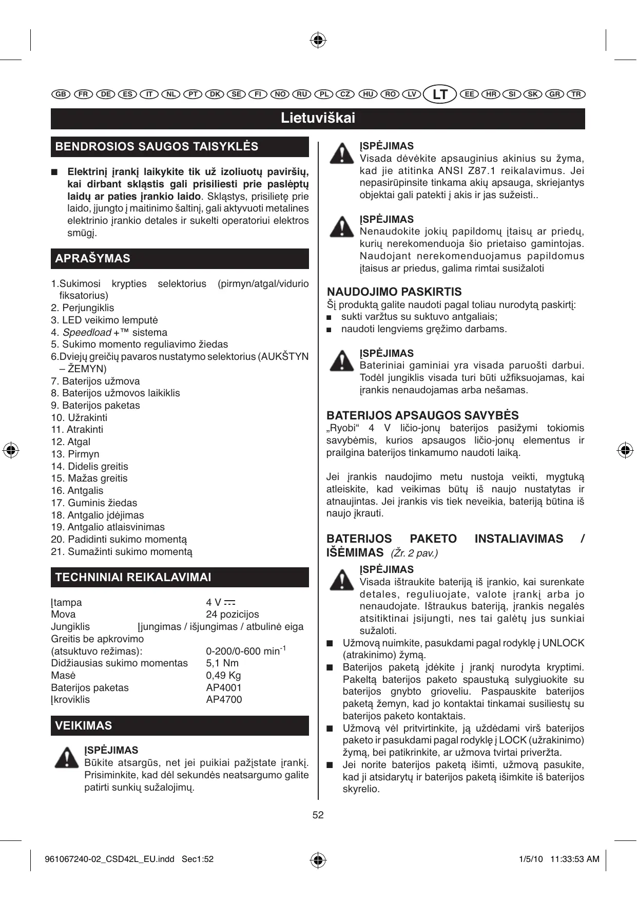 NAUDOJIMO INSTRUKCIJA CSD 40 LI, CSD42L RYOBI