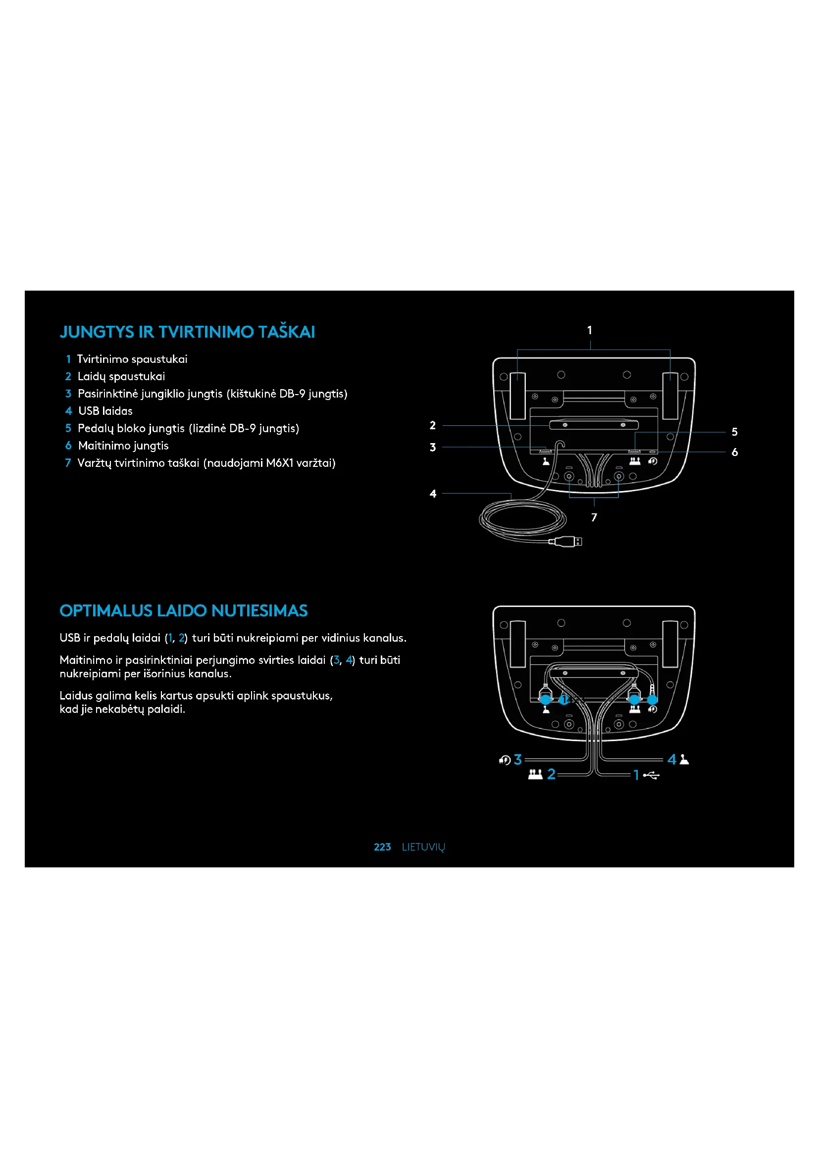 1 Tvirtinimo spaustukai 2 Laidų spaustukai 3 Pasirinktinė jungiklio jungtis (kištukinė DB-9 jungtis) 4 USB laidas 5 Pedalų bloko jungtis (lizdinė DB-9 jungtis) 6 Maitinimo jungtis 7 Varžtų tvirtinimo taškai (naudojami M6X1 varžtai)
