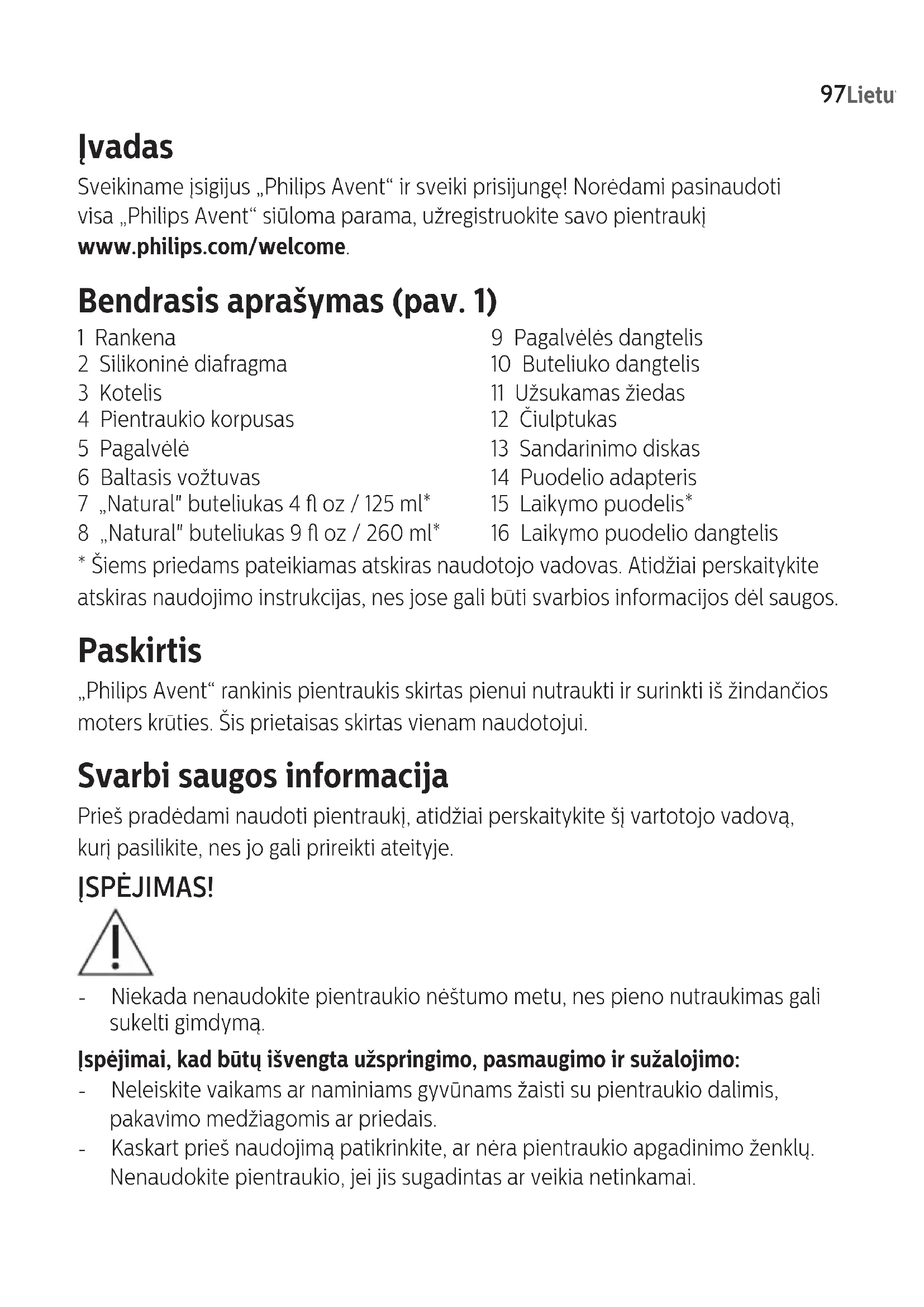 - Šiems priedams pateikiamas atskiras naudotojo vadovas. Atidžiai perskaitykite atskiras naudojimo instrukcijas, nes jose gali būti svarbios informacijos dėl saugos. Paskirtis „Philips Avent“ rankinis pientraukis skirtas pienui nutraukti ir surinkti iš žindančios moters krūties. Šis prietaisas skirtas vienam naudotojui. Svarbi saugos informacija Prieš pradėdami naudoti pientraukį, atidžiai perskaitykite šį vartotojo vadovą, kurį pasilikite, nes jo gali prireikti ateityje. ĮSPĖJIMAS! - Niekada nenaudokite pientraukio nėštumo metu, nes pieno nutraukimas gali sukelti gimdymą. Įspėjimai, kad būtų išvengta užspringimo, pasmaugimo ir sužalojimo: - Neleiskite vaikams ar naminiams gyvūnams žaisti su pientraukio dalimis, pakavimo medžiagomis ar priedais. - Kaskart prieš naudojimą patikrinkite, ar nėra pientraukio apgadinimo ženklų. Nenaudokite pientraukio, jei jis sugadintas ar veikia netinkamai. 97LietuviškaiĮspėjimai, kad būtų išvengta užteršimo ir užtikrinta higiena: - Higienos tikslais pientraukis yra skirtas daugkartiniam vieno asmens naudojimui. - Prieš pirmą naudojimą ir po kiekvieno kito naudojimo valykite ir dezinfekuokite visas dalis. - Pientraukio dalių valymui nenaudokite antibakterinių ar abrazyvinių valiklių, nes galite jas sugadinti. - Prieš liečiant pientraukio dalis ir krūtis muilu ir vandeniu kruopščiai nusiplaukite rankas, kad išvengtumėte užteršimo. Stenkitės neliesti talpyklų vidaus ar dangtelių. Įspėjimai, skirti išvengti krūtų ir spenelių problemų, įskaitant skausmą: - Visada paleiskite rankenėlę prieš pientraukio korpuso nuėmimą nuo krūties, kad būtų pašalintas vakuumas. - Jeigu vakuumas sukelia nepatogumą ar skausmą, nebetraukite, išjunkite ir nuimkite pientraukį nuo krūties. - Jei pienas nebėga, jokiu būdu netraukite pieno ilgiau kaip penkias minutes. Bandykite kitą kartą tą pačią dieną. - Jei procesas tampa labai nekomfortiškas arba skausmingas, nustokite naudoti pientraukį ir pasitarkite su sveikatos priežiūros specialistu. - Naudokite tik „Philips Avent“ rekomenduojamus priedus ir dalis. - Neleidžiamas joks pientraukio modikavimas. Įspėjimas. Jei esate apsikrėtusi žmogaus imunodecito virusu (ŽIV) ar hepatitu B arba C, naudojant rankinį pientraukį nesumažės ar nebus pašalinta rizika perduoti virusą per pieną jūsų kūdikiui. Atsargiai! - Laikykite dalis atokiau nuo įkaitusių paviršių, kad išvengtumėte šių dalių deformacijos. Paruošimas naudoti Prieš pirmą kartą naudodami ir kaskart panaudoję pientraukį išrinkite, išvalykite ir dezinfekuokite visas jo dalis. Atsargiai! Būkite atsargūs, kai nuimate ir valote baltą vožtuvą. Nekiškite daiktų į baltą vožtuvą, nes taip galite jį sugadinti. 98 LietuviškaiValymas ir dezinfekcija 1 veiksmas: Išardymas Visiškai išrinkite pientraukį ir buteliuką. Taip pat išimkite baltą vožtuvą iš pientraukio. 2 veiksmas: Valymas Dalis galima plauti rankomis ar indaplovėje. Įspėjimas. Pientraukio dalių valymui nenaudokite antibakterinių ar abrazyvinių valiklių, nes galite jas sugadinti. 2A veiksmas: Rankinis valymas 1 Išskalaukite visas dalis drungnu tekančiu vandeniu iš čiaupo. 2 Mirkykite visas dalis 5 minutes šiltame vandenyje su šiek tiek švelnaus indų plovimo skysčio. 3 Išvalykite visas dalis minkštu valymo šepetėliu. 4 Kruopščiai išskalaukite visas dalis šaltu švariu tekančiu vandeniu iš čiaupo. 5 Palikite visas dalis natūraliai išdžiūti ant švaraus virtuvinio rankšluosčio arba džiovinimo laikiklio. 2B veiksmas: Plovimas indaplovėje Pastaba. Maistiniai dažai gali pakeisti dalių spalvą. 1 Sudėkite visas dalis viršutinėje indaplovės lentynoje. 2 Į indaplovę įpilkite indų plovimo skysčio ar įdėkite tabletę ir vykdykite standartinę programą. 3 Palikite visas dalis natūraliai išdžiūti ant švaraus virtuvinio rankšluosčio arba džiovinimo laikiklio. 3 veiksmas: Dezinfekcija Atsargiai! Dezinfekuojant verdančiu vandeniu būtina užtikrinti, kad buteliukas ar kitos dalys nesiliestų su prikaistuvio kraštais. Tai gali lemti nepataisomą produkto deformaciją ar apgadinimą; už tai „Philips“ atsakomybės neprisiima.