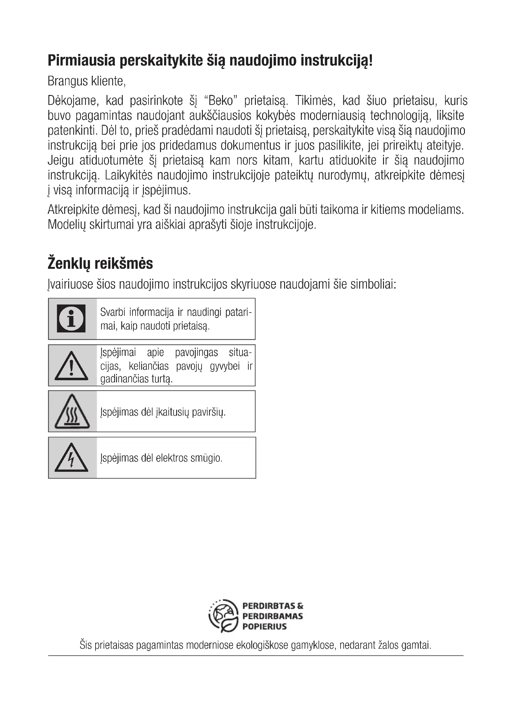 - “Beko” mikrobangų krosnelė ati- tinka galiojančius saugos standar- tus, todėl, jeigu prietaisas arba jo maitinimo laidas būtų pažeistas, jį privalo paleisti platintojas, aptarna- vimo centras ar specialistas arba bet kuris kitas įgaliotasis atstovas, kad būtų išvengta bet kokių pavojų. Klaidingi arba netinkami remonto darbai gali kelti pavojų ir riziką var- totojui.