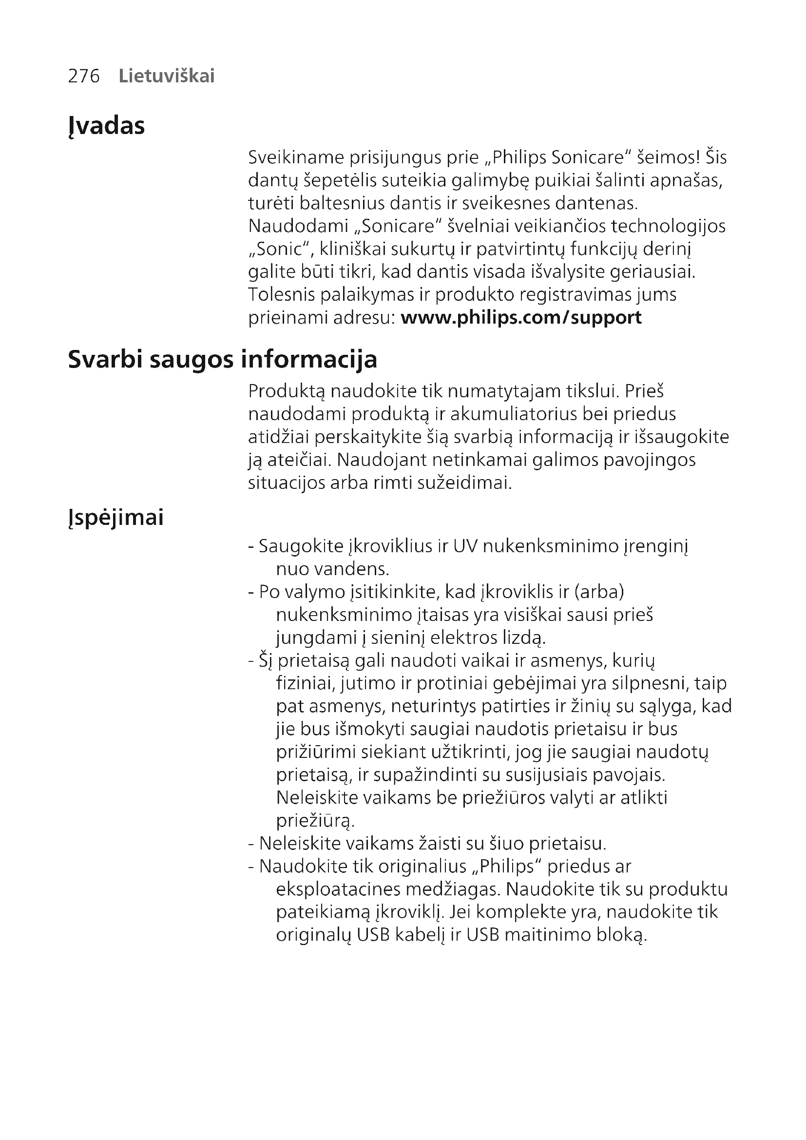 Lietuviškai Įvadas Sveikiname prisijungus prie „Philips Sonicare“ šeimos! Šis dantų šepetėlis suteikia galimybę puikiai šalinti apnašas, turėti baltesnius dantis ir sveikesnes dantenas. Naudodami „Sonicare“ švelniai veikiančios technologijos „Sonic“, kliniškai sukurtų ir patvirtintų funkcijų derinį galite būti tikri, kad dantis visada išvalysite geriausiai. Tolesnis palaikymas ir produkto registravimas jums prieinami adresu: www.philips.com/support Svarbi saugos informacija Produktą naudokite tik numatytajam tikslui. Prieš naudodami produktą ir akumuliatorius bei priedus atidžiai perskaitykite šią svarbią informaciją ir išsaugokite ją ateičiai. Naudojant netinkamai galimos pavojingos situacijos arba rimti sužeidimai. Įspėjimai - Saugokite įkroviklius ir UV nukenksminimo įrenginį nuo vandens. - Po valymo įsitikinkite, kad įkroviklis ir (arba) nukenksminimo įtaisas yra visiškai sausi prieš jungdami į sieninį elektros lizdą. - Šį prietaisą gali naudoti vaikai ir asmenys, kurių fiziniai, jutimo ir protiniai gebėjimai yra silpnesni, taip pat asmenys, neturintys patirties ir žinių su sąlyga, kad jie bus išmokyti saugiai naudotis prietaisu ir bus prižiūrimi siekiant užtikrinti, jog jie saugiai naudotų prietaisą, ir supažindinti su susijusiais pavojais. Neleiskite vaikams be priežiūros valyti ar atlikti priežiūrą. - Neleiskite vaikams žaisti su šiuo prietaisu. - Naudokite tik originalius „Philips“ priedus ar eksploatacines medžiagas. Naudokite tik su produktu pateikiamą įkroviklį. Jei komplekte yra, naudokite tik originalų USB kabelį ir USB maitinimo bloką.277 Lietuviškai - Šiame prietaise nėra dalių, kurių priežiūrą galėtų atlikti naudotojas. Jei prietaisas apgadintas, nustokite jį naudoti ir susisiekite su klientų aptarnavimo centru savo šalyje. Tik prietaisams su laidu: Jei laidas pažeistas, pakeiskite įkroviklį su nukenksminimo įrenginiu nauju. - Nenaudokite įkroviklio ir (arba) nukenksminimo įtaiso įrenginio lauke arba netoli įkaitusių paviršių. - Jokių produkto dalių neplaukite indaplovėje. - Šis prietaisas skirtas valyti tik dantis, dantenas ir liežuvį. - Visada laikykite dezinfekavimo įrenginį vaikams nepasiekiamoje vietoje. - Nebenaudokite nukenksminimo įrenginio, jei UV šviesos lemputė lieka šviesti atidarius dureles. UV šviesa gali būti pavojinga žmonių akims ir odai. - Dezinfekavimo įrenginį naudokite tik uždėję apsauginį skydelį. - Nelieskite UV nukenksminimo įrenginio UV šviesos lemputės, kai ji karšta. - Nebenaudokite šepetėlio galvutės, jei jos šereliai suspausti ar sulinkę. Šepetėlio galvutę keiskite kas 3 mėnesius arba dažniau, jei atsiranda susidėvėjimo požymių. - Venkite tiesioginio kontakto su produktais, kuriuose yra eterinių aliejų arba kokosų aliejaus. Kontaktas gali lemti šerių atsiskyrimą. - Nustokite naudoti prietaisą ir pasitarkite su odontologu/ gydytoju, jei po naudojimo pasireiškia per didelis kraujavimas, po 1 savaitės naudojimo kraujavimas tęsiasi arba jei jaučiate diskomfortą ar skausmą. - Jei per ankstesnius 2 mėnesius jums buvo atlikta burnos ertmės arba dantenų operacija, prieš naudodamiesi prietaisu pasitarkite su savo odontologu. - Jei jums implantuotas širdies stimuliatorius ar kitas prietaisas, prieš naudodamiesi pasitarkite su gydytoju ar implantuoto prietaiso gamintoju. - Jei jums kilo su medicina susijusių klausimų, prieš naudodami šį prietaisą pasikonsultuokite su gydytoju.278 Lietuviškai - Šis prietaisas yra asmeninis priežiūros prietaisas ir nėra skirtas naudoti keliems pacientams odontologijos praktikai ar įstaigoje. Baterijos saugos instrukcijos - Šiame prietaise yra baterijos, kurias išimti turi tik įgudę asmenys. - Produktą naudokite tik numatytajam tikslui. Prieš naudodami produktą ir akumuliatorius bei priedus atidžiai perskaitykite šią informaciją ir išsaugokite ją ateičiai. Naudojant netinkamai gali kelti pavojų arba rimtus sužeidimus. Teikiami priedai skirtingiems produktams gali skirtis. - Naudokite tik originalius „Philips“ priedus ir eksploatacines medžiagas. Naudokite tik nuimamą maitinimo bloką TCBxxxx, HX6100, HX6110, HX6160 arba WAAxxxx. - Laikykite produktą ir akumuliatorius toliau nuo ugnies bei vietose, kur nėra tiesioginės saulės šviesos ar aukštos temperatūros. - Jei produktas tampa neįprastai karštas arba jaučiamas kvapas, pasikeičia spalva arba įkrovimas trunka ilgiau nei turėtų, nustokite naudoti ir įkrauti produktą bei kreipkitės į „Philips“. - Produktų ir jų baterijų nedėkite į mikrobangų krosneles arba indukcines virykles. - Neatidarykite, nemodifikuokite, nepjaustykite, nesugadinkite ir neišrinkite produkto ar baterijos, kad išvengtumėte baterijų perkaitimo arba toksinių ir pavojingų medžiagų paskleidimo. Užtikrinkite, kad naudojant akumuliatorius nebūtų trumpojo jungimo, perkrovimo arba atvirkštinio krovimo. - Šiame prietaise yra nekeičiamų baterijų. Kai baigiasi baterijos naudojimo laikas, prietaisą būtina tinkamai šalinti, žr. skyrių apie perdirbimą. - Jei baterijos pažeistos arba teka, venkite sąlyčio su oda arba akimis. Taip atsitikus, nedelsdami gerai paskalaukite vandeniu ir kreipkitės į gydytoją. - Prieš tvarkydami baterijas įsitikinkite, kad jūsų rankos, produktas ir baterijos yra sausi.279 Lietuviškai - Jei išėmę baterijas norite išvengti jų atsitiktinio trumpojo jungimo, neleiskite baterijų gnybtams liestis su metaliniais daiktais (pvz., monetomis, plaukų smeigtukais, žiedais). Draudžiama vynioti baterijas į aliuminio foliją. Prieš šalindami baterijas apvyniokite jų gnybtus lipnia juosta arba įdėkite baterijas į plastikinį maišelį. - Įkraukite ir naudokite produktą nuo 0°C iki 40°C temperatūroje. Laikymo ir gabenimo sąlygos Temperatūra: nuo –10°C iki 60°C. Elektromagnetiniai laukai (EML) Šis Philips prietaisas atit
