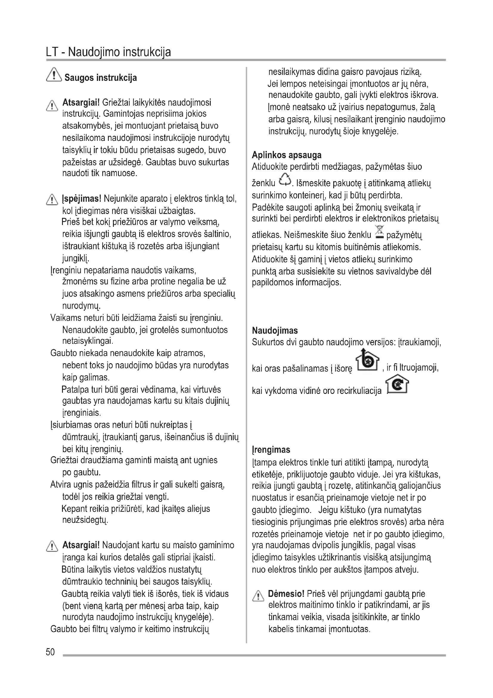 Izmantot augstāku ātrumu īpašas virtuves dūmu koncentrācijas gadījumā. Iesakām ieslēgt iesūkšanu 5 minūtes pirms ēdiena gatavošanas sākšanas un neslēgt to ārā vēl 15 minūtes pēc ēdiena gatavošanas pabeigšanas. Apgaismojums Atvienot ierīci no elektriskās sistēmas. Uzmanību! Pirms pieskarties spuldzēm, pārliecināties, ka tās ir aukstas. Izmantot tikai 12V -20W max - G4 halogēna spuldzes, uzmanoties lai neaiztiktu tās ar rokām.50 Saugos instrukcija Atsargiai! Griežtai laikykitės naudojimosi instrukcijų. Gamintojas neprisiima jokios atsakomybės, jei montuojant prietaisą buvo nesilaikoma naudojimosi instrukcijoje nurodytų taisyklių ir tokiu būdu prietaisas sugedo, buvo pažeistas ar užsidegė. Gaubtas buvo sukurtas naudoti tik namuose. Įspėjimas! Nejunkite aparato į elektros tinklą tol, kol įdiegimas nėra visiškai užbaigtas. Prieš bet kokį priežiūros ar valymo veiksmą, reikia išjungti gaubtą iš elektros srovės šaltinio, ištraukiant kištuką iš rozetės arba išjungiant jungiklį. Įrenginiu nepatariama naudotis vaikams, žmonėms su fizine arba protine negalia be už juos atsakingo asmens priežiūros arba specialių nurodymų. Vaikams neturi būti leidžiama žaisti su įrenginiu. Nenaudokite gaubto, jei grotelės sumontuotos netaisyklingai. Gaubto niekada nenaudokite kaip atramos, nebent toks jo naudojimo būdas yra nurodytas kaip galimas. Patalpa turi būti gerai vėdinama, kai virtuvės gaubtas yra naudojamas kartu su kitais dujinių įrenginiais. Įsiurbiamas oras neturi būti nukreiptas į dūmtraukį, įtraukiantį garus, išeinančius iš dujinių bei kitų įrenginių. Griežtai draudžiama gaminti maistą ant ugnies po gaubtu. Atvira ugnis pažeidžia filtrus ir gali sukelti gaisrą, todėl jos reikia griežtai vengti. Kepant reikia prižiūrėti, kad įkaitęs aliejus neužsidegtų. Atsargiai! Naudojant kartu su maisto gaminimo įranga kai kurios detalės gali stipriai įkaisti. Būtina laikytis vietos valdžios nustatytų dūmtraukio techninių bei saugos taisyklių. Gaubtą reikia valyti tiek iš išorės, tiek iš vidaus (bent vieną kartą per mėnesį arba taip, kaip nurodyta naudojimo instrukcijų knygelėje). Gaubto bei filtrų valymo ir keitimo instrukcijų nesilaikymas didina gaisro pavojaus riziką. Jei lempos neteisingai įmontuotos ar jų nėra, nenaudokite gaubto, gali įvykti elektros iškrova. Įmonė neatsako už įvairius nepatogumus, žalą arba gaisrą, kilusį nesilaikant įrenginio naudojimo instrukcijų, nurodytų šioje knygelėje. Aplinkos apsauga Atiduokite perdirbti medžiagas, pažymėtas šiuo ženklu . Išmeskite pakuotę į atitinkamą atliekų surinkimo konteinerį, kad ji būtų perdirbta. Padėkite saugoti aplinką bei žmonių sveikatą ir surinkti bei perdirbti elektros ir elektronikos prietaisų atliekas. Neišmeskite šiuo ženklu pažymėtų prietaisų kartu su kitomis buitinėmis atliekomis. Atiduokite šį gaminį į vietos atliekų surinkimo punktą arba susisiekite su vietnos savivaldybe dėl papildomos informacijos. Naudojimas Sukurtos dvi gaubto naudojimo versijos: įtraukiamoji, kai oras pašalinamas į išorę , ir fi ltruojamoji, kai vykdoma vidinė oro recirkuliacija . Įrengimas Įtampa elektros tinkle turi atitikti įtampą, nurodytą etiketėje, priklijuotoje gaubto viduje. Jei yra kištukas, reikia įjungti gaubtą į rozetę, atitinkančią galiojančius nuostatus ir esančią prieinamoje vietoje net ir po gaubto įdiegimo. Jeigu kištuko (yra numatytas tiesioginis prijungimas prie elektros srovės) arba nėra rozetės prieinamoje vietoje net ir po gaubto įdiegimo, yra naudojamas dvipolis jungiklis, pagal visas įdiegimo taisykles užtikrinantis visišką atsijungimą nuo elektros tinklo per aukštos įtampos atveju. Dėmesio! Prieš vėl prijungdami gaubtą prie elektros maitinimo tinklo ir patikrindami, ar jis tinkamai veikia, visada įsitikinkite, ar tinklo kabelis tinkamai įmontuotas.