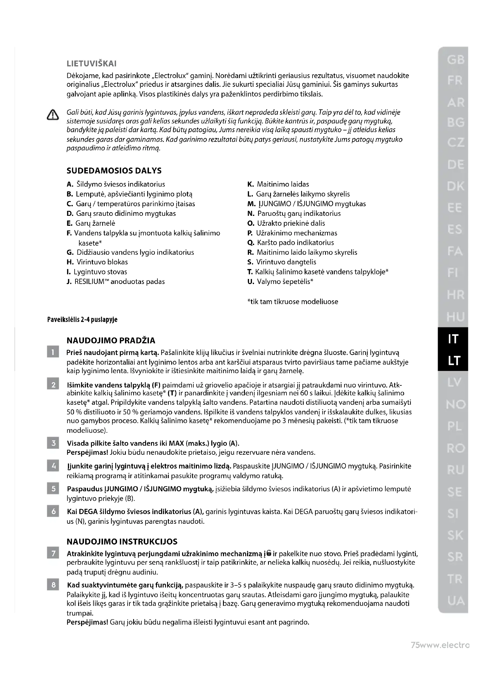 1 Prieš naudojant pirmą kartą. Pašalinkite klijų likučius ir švelniai nutrinkite drėgna šluoste. Garinį lygintuvą padėkite horizontaliai ant lyginimo lentos arba ant karščiui atsparaus tvirto paviršiaus tame pačiame aukštyje kaip lyginimo lenta. Išvyniokite ir ištiesinkite maitinimo laidą ir garų žarnelę. 2 Išimkite vandens talpyklą (F) paimdami už griovelio apačioje ir atsargiai jį patraukdami nuo virintuvo. Atk- abinkite kalkių šalinimo kasetę* (T) ir panardinkite į vandenį ilgesniam nei 60 s laikui. Įdėkite kalkių šalinimo kasetę* atgal. Pripildykite vandens talpyklą šalto vandens. Patartina naudoti distiliuotą vandenį arba sumaišyti 50 % distiliuoto ir 50 % geriamojo vandens. Išpilkite iš vandens talpyklos vandenį ir išskalaukite dulkes, likusias nuo gamybos proceso. Kalkių šalinimo kasetę* rekomenduojame po 3 mėnesių pakeisti. (*tik tam tikruose modeliuose). 3 Visada pilkite šalto vandens iki MAX (maks.) lygio (A). Perspėjimas! Jokiu būdu nenaudokite prietaiso, jeigu rezervuare nėra vandens. 4 Įjunkite garinį lygintuvą į elektros maitinimo lizdą. Paspauskite ĮJUNGIMO / IŠJUNGIMO mygtuką. Pasirinkite reikiamą programą ir atitinkamai pasukite programų valdymo ratuką. 5 Paspaudus ĮJUNGIMO / IŠJUNGIMO mygtuką, įsižiebia šildymo šviesos indikatorius (A) ir apšvietimo lemputė lygintuvo priekyje (B). 6 Kai DEGA šildymo šviesos indikatorius (A), garinis lygintuvas kaista. Kai DEGA paruoštų garų šviesos indikatori- us (N), garinis lygintuvas parengtas naudoti. NAUDOJIMO INSTRUKCIJOS 7 Atrakinkite lygintuvą perjungdami užrakinimo mechanizmą į ir pakelkite nuo stovo. Prieš pradėdami lyginti, perbraukite lygintuvu per seną rankšluostį ir taip patikrinkite, ar nelieka kalkių nuosėdų. Jei reikia, nušluostykite padą truputį drėgnu audiniu. 8 Kad suaktyvintumėte garų funkciją, paspauskite ir 3–5 s palaikykite nuspaudę garų srauto didinimo mygtuką. Palaikykite jį, kad iš lygintuvo išeitų koncentruotas garų srautas. Atleisdami garo įjungimo mygtuką, palaukite kol išeis likęs garas ir tik tada grąžinkite prietaisą į bazę. Garų generavimo mygtuką rekomenduojama naudoti trumpai. Perspėjimas! Garų jokiu būdu negalima išleisti lygintuvui esant ant pagrindo.76 www.electrolux.com 9 Išjunkite prietaisą paspausdami ĮJUNGIMO / IŠJUNGIMO mygtuką (lemputės išsijungs). 10 Prieš padėdami į vietą, lygintuvą visiškai atvėsinkite ant stovo. Tada ištuštinkite vandens talpyklą. Garinį lygintu- vą laikykite ant stovo. 11 Baigę naudoti, prietaisą išjunkite paspausdami ĮJUNGIMO / IŠJUNGIMO mygtuką. Padėkite lygintuvą ant stovo ir įjunkite užrakinimo mechanizmą (padėtis ), kad apsaugotumėte lygintuvą. 12 Maitinimo laidą visada laikykite jam skirtame skyrelyje (R), o garų žarnelę – jai skirtame skyrelyje (L) ant garinio lygintuvo pagrindo. Įspėjimas! Maitinimo laido JOKIU BŪDU nevyniokite aplink lygintuvą. VALYMAS 13 Pasukite lygintuvo pagrindą taip, kad virintuvo dangtelis būtų viršuje. Atsukite virintuvo dangtelį. Prietaisą paver- skite šonu virš plautuvės ir iš virintuvo visiškai išpilkite vandenį. 14 Paruoškite bent 300ml kalkių šalinimo priemonės ir vandens mišinio nurodytu santykiu (Mišinys turi būti re- komenduojamo santykio. Jeigu yra daug nuovirų, atitinkamai padidinkite nuovirų šalinimo priemonės dalį.). Pastaba. Rekomenduojame naudoti kalkių šalinimo priemonę EUD5 iš „Electrolux“. Laikykitės vandens / kalkių šalinimo skysčio santykio instrukcijos ant butelio. Rekomenduojame valyti gaminį kas 2 mėnesius. 15 Išpilkite mišinį. Pripildykite virintuvą švaraus vandens ir vėl išpilkite. Pakartokite šį veiksmą kelis kartus, kol neliks nuovirų ir jų šalinimo priemonės kvapo. Prieš vėl surinkdami virintuvą, įpilkite į jį vieną matavimo indelį švaraus vandens. LYGINTUVUI UŽSIKIMŠUS DĖL KALKIŲ IR DĖL TO SUGEDUS, GARANTIJA NETAIKOMA. Išplovę virintuvą (prieš uždarydami), palikite jame truputį vandens. 16 Į virintuvo angą įkiškite valymo šepetėlį* ir, laikydami prietaisą virš plautuvės, išpilkite likusį vandenį bei išvaly- kite kalkių likučius. (*tik tam tikruose modeliuose). 17 Valykite prietaisą lengvai sudrėkinta šluoste. Jei reikia pašalinti sunkiai įveikiamus nešvarumus, galite naudoti šiek tiek paviršių nebraižančio valiklio. Naudokitės savo nauju „Electrolux“ gaminiu! SAUGOS PATARIMAS Prieš naudodami prietaisą pirmą kartą atidžiai perskaitykite šias instrukcijas.