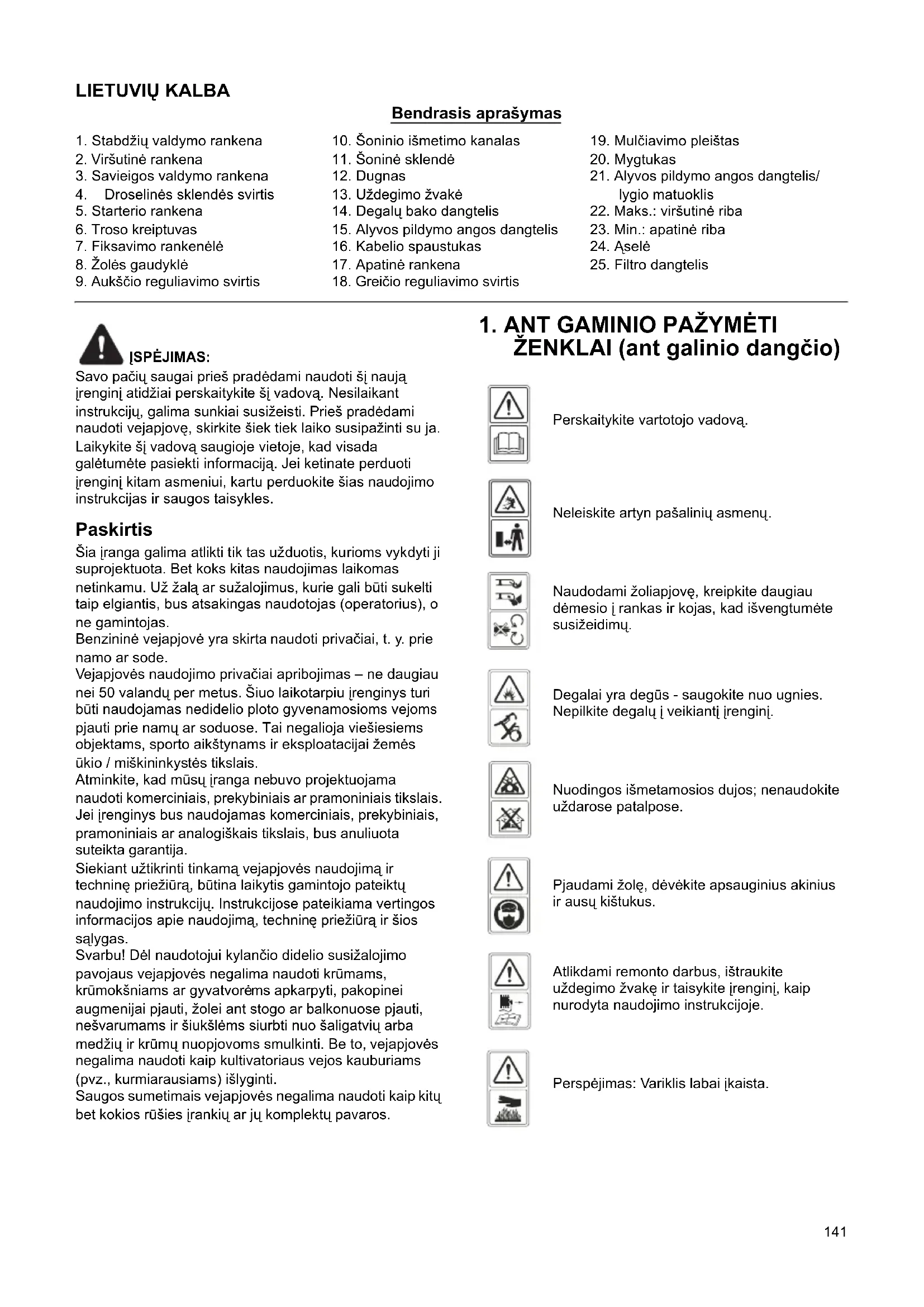 Perskaitykite vartotojo vadovą. Neleiskite artyn pašalinių asmenų. Naudodami žoliapjovę, kreipkite daugiau dėmesio į rankas ir kojas, kad išvengtumėte susižeidimų. Degalai yra degūs - saugokite nuo ugnies. Nepilkite degalų į veikiantį įrenginį. Nuodingos išmetamosios dujos; nenaudokite uždarose patalpose. Pjaudami žolę, dėvėkite apsauginius akinius ir ausų kištukus. Atlikdami remonto darbus, ištraukite uždegimo žvakę ir taisykite įrenginį, kaip nurodyta naudojimo instrukcijoje. Perspėjimas: Variklis labai įkaista.142