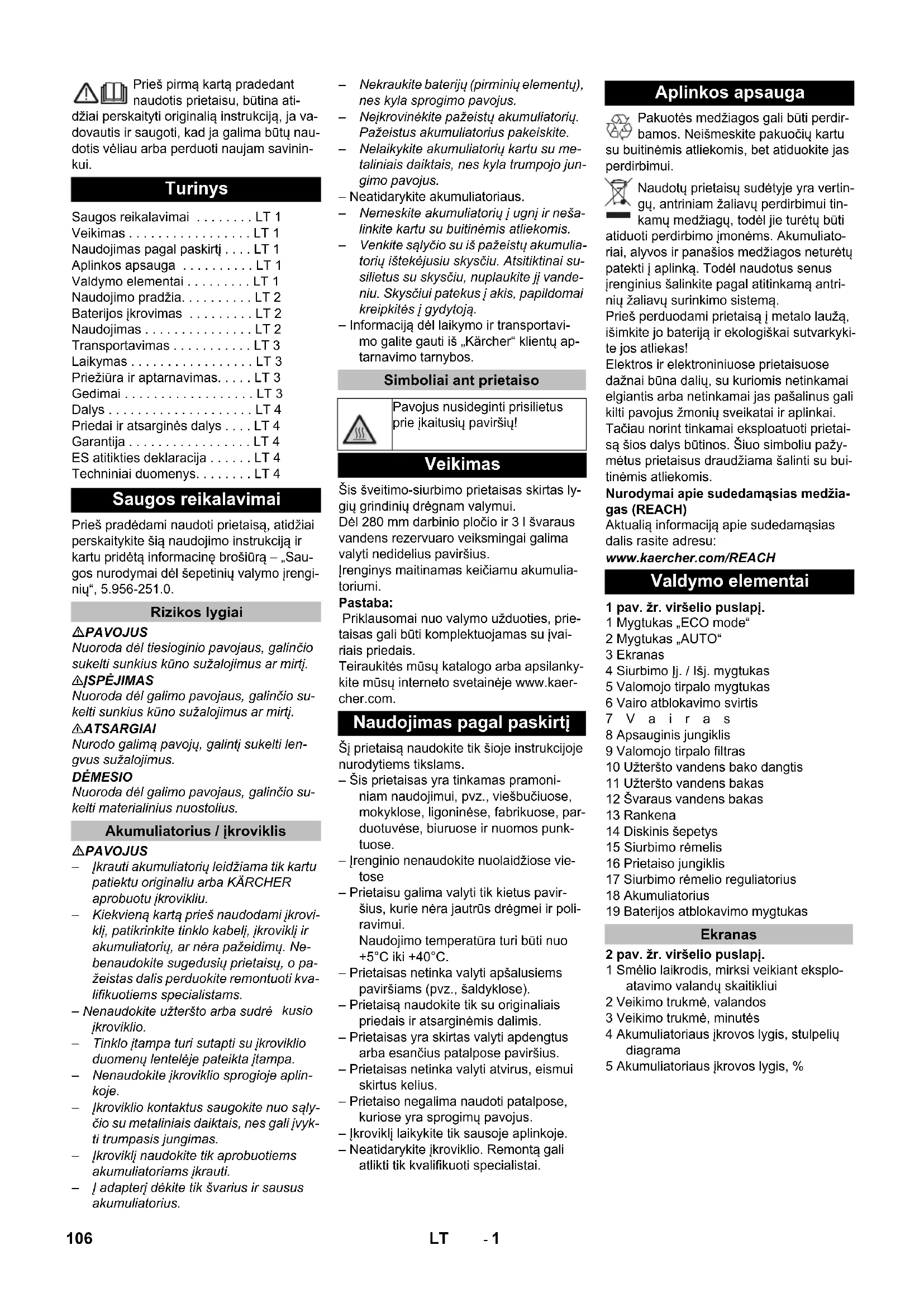 dB(A) 2,3 Lādēšanas ierīce Nordelettronica mod. NE316 Nominālais spriegums V 100...240 Frekvence Hz 50-60 Jaudas patēriņš A 2...1 105LV- 1 Prieš pirmą kartą pradedant naudotis prietaisu, būtina ati- džiai perskaityti originalią instrukciją, ja va- dovautis ir saugoti, kad ja galima būtų nau- dotis vėliau arba perduoti naujam savinin- kui. Prieš pradėdami naudoti prietaisą, atidžiai perskaitykite šią naudojimo instrukciją ir kartu pridėtą informacinę brošiūrą – „Sau- gos nurodymai dėl šepetinių valymo įrengi- nių“, 5.956-251.0. PAVOJUS Nuoroda dėl tiesioginio pavojaus, galinčio sukelti sunkius kūno sužalojimus ar mirtį. 몇 ĮSPĖJIMAS Nuoroda dėl galimo pavojaus, galinčio su- kelti sunkius kūno sužalojimus ar mirtį. 몇 ATSARGIAI Nurodo galimą pavojų, galintį sukelti len- gvus sužalojimus. DĖMESIO Nuoroda dėl galimo pavojaus, galinčio su- kelti materialinius nuostolius. PAVOJUS – Įkrauti akumuliatorių leidžiama tik kartu patiektu originaliu arba KÄRCHER aprobuotu įkrovikliu. – Kiekvieną kartą prieš naudodami įkrovi- klį, patikrinkite tinklo kabelį, įkroviklį ir akumuliatorių, ar nėra pažeidimų. Ne- benaudokite sugedusių prietaisų, o pa- žeistas dalis perduokite remontuoti kva- lifikuotiems specialistams. – Nenaudokite užteršto arba sudrė kusio įkroviklio. – Tinklo įtampa turi sutapti su įkroviklio duomenų lentelėje pateikta įtampa. – Nenaudokite įkroviklio sprogioje aplin- koje. – Įkroviklio kontaktus saugokite nuo sąly- čio su metaliniais daiktais, nes gali įvyk- ti trumpasis jungimas. – Įkroviklį naudokite tik aprobuotiems akumuliatoriams įkrauti. – Į adapterį dėkite tik švarius ir sausus akumuliatorius. – Nekraukite baterijų (pirminių elementų), nes kyla sprogimo pavojus. – Neįkrovinėkite pažeistų akumuliatorių. Pažeistus akumuliatorius pakeiskite. – Nelaikykite akumuliatorių kartu su me- taliniais daiktais, nes kyla trumpojo jun- gimo pavojus. – Neatidarykite akumuliatoriaus. – Nemeskite akumuliatorių į ugnį ir neša- linkite kartu su buitinėmis atliekomis. – Venkite sąlyčio su iš pažeistų akumulia- torių ištekėjusiu skysčiu. Atsitiktinai su- silietus su skysčiu, nuplaukite jį vande- niu. Skysčiui patekus į akis, papildomai kreipkitės į gydytoją. – Informaciją dėl laikymo ir transportavi- mo galite gauti iš „Kärcher“ klientų ap- tarnavimo tarnybos. Šis šveitimo-siurbimo prietaisas skirtas ly- gių grindinių drėgnam valymui. Dėl 280 mm darbinio pločio ir 3 l švaraus vandens rezervuaro veiksmingai galima valyti nedidelius paviršius. Įrenginys maitinamas keičiamu akumulia- toriumi. Pastaba: Priklausomai nuo valymo užduoties, prie- taisas gali būti komplektuojamas su įvai- riais priedais. Teiraukitės mūsų katalogo arba apsilanky- kite mūsų interneto svetainėje www.kaer- cher.com. Šį prietaisą naudokite tik šioje instrukcijoje nurodytiems tikslams. – Šis prietaisas yra tinkamas pramoni- niam naudojimui, pvz., viešbučiuose, mokyklose, ligoninėse, fabrikuose, par- duotuvėse, biuruose ir nuomos punk- tuose. – Įrenginio nenaudokite nuolaidžiose vie- tose – Prietaisu galima valyti tik kietus pavir- šius, kurie nėra jautrūs drėgmei ir poli- ravimui. Naudojimo temperatūra turi būti nuo +5°C iki +40°C. – Prietaisas netinka valyti apšalusiems paviršiams (pvz., šaldyklose). – Prietaisą naudokite tik su originaliais priedais ir atsarginėmis dalimis. – Prietaisas yra skirtas valyti apdengtus arba esančius patalpose paviršius. – Prietaisas netinka valyti atvirus, eismui skirtus kelius. – Prietaiso negalima naudoti patalpose, kuriose yra sprogimų pavojus. – Įkroviklį laikykite tik sausoje aplinkoje. – Neatidarykite įkroviklio. Remontą gali atlikti tik kvalifikuoti specialistai. Pakuotės medžiagos gali būti perdir- bamos. Neišmeskite pakuočių kartu su buitinėmis atliekomis, bet atiduokite jas perdirbimui. Naudotų prietaisų sudėtyje yra vertin- gų, antriniam žaliavų perdirbimui tin- kamų medžiagų, todėl jie turėtų būti atiduoti perdirbimo įmonėms. Akumuliato- riai, alyvos ir panašios medžiagos neturėtų patekti į aplinką. Todėl naudotus senus įrenginius šalinkite pagal atitinkamą antri- nių žaliavų surinkimo sistemą. Prieš perduodami prietaisą į metalo laužą, išimkite jo bateriją ir ekologiškai sutvarkyki- te jos atliekas! Elektros ir elektroniniuose prietaisuose dažnai būna dalių, su kuriomis netinkamai elgiantis arba netinkamai jas pašalinus gali kilti pavojus žmonių sveikatai ir aplinkai. Tačiau norint tinkamai eksploatuoti prietai- są šios dalys būtinos. Šiuo simboliu pažy- mėtus prietaisus draudžiama šalinti su bui- tinėmis atliekomis. Nurodymai apie sudedamąsias medžia- gas (REACH) Aktualią informaciją apie sudedamąsias dalis rasite adresu: www.kaercher.com/REACH 1 pav. žr. viršelio puslapį. 1 Mygtukas „ECO mode“ 2 Mygtukas „AUTO“ 3 Ekranas 4 Siurbimo Įj. / Išj. mygtukas 5 Valomojo tirpalo mygtukas 6 Vairo atblokavimo svirtis 7Vairas 8 Apsauginis jungiklis 9 Valomojo tirpalo filtras 10 Užteršto vandens bako dangtis 11 Užteršto vandens bakas 12 Švaraus vandens bakas 13 Rankena 14 Diskinis šepetys 15 Siurbimo rėmelis 16 Prietaiso jungiklis 17 Siurbimo rėmelio reguliatorius 18 Akumuliatorius 19 Baterijos atblokavimo mygtukas 2 pav. žr. viršelio puslapį. 1 Smėlio laikrodis, mirksi veikiant eksplo- atavimo valandų skaitikliui 2 Veikimo trukmė, valandos 3 Veikimo trukmė, minutės 4 Akumuliatoriaus įkrovos lygis, stulpelių diagrama 5 Akumuliatoriaus įkrovos lygis, % Turinys Saugos reikalavimai . . . . . . . . LT 1 Veikimas . . . . . . . . . . . . . . . . . LT 1 Naudojimas pagal paskirtį . . . . LT 1 Aplinkos apsauga . . . . . . . . . . LT 1 Valdymo elementai . . . . . . . . . LT 1 Naudojimo pradžia. . . . . . . . . . LT 2 Baterijos įkrovimas . . . . . . . . . LT 2 Naudojimas