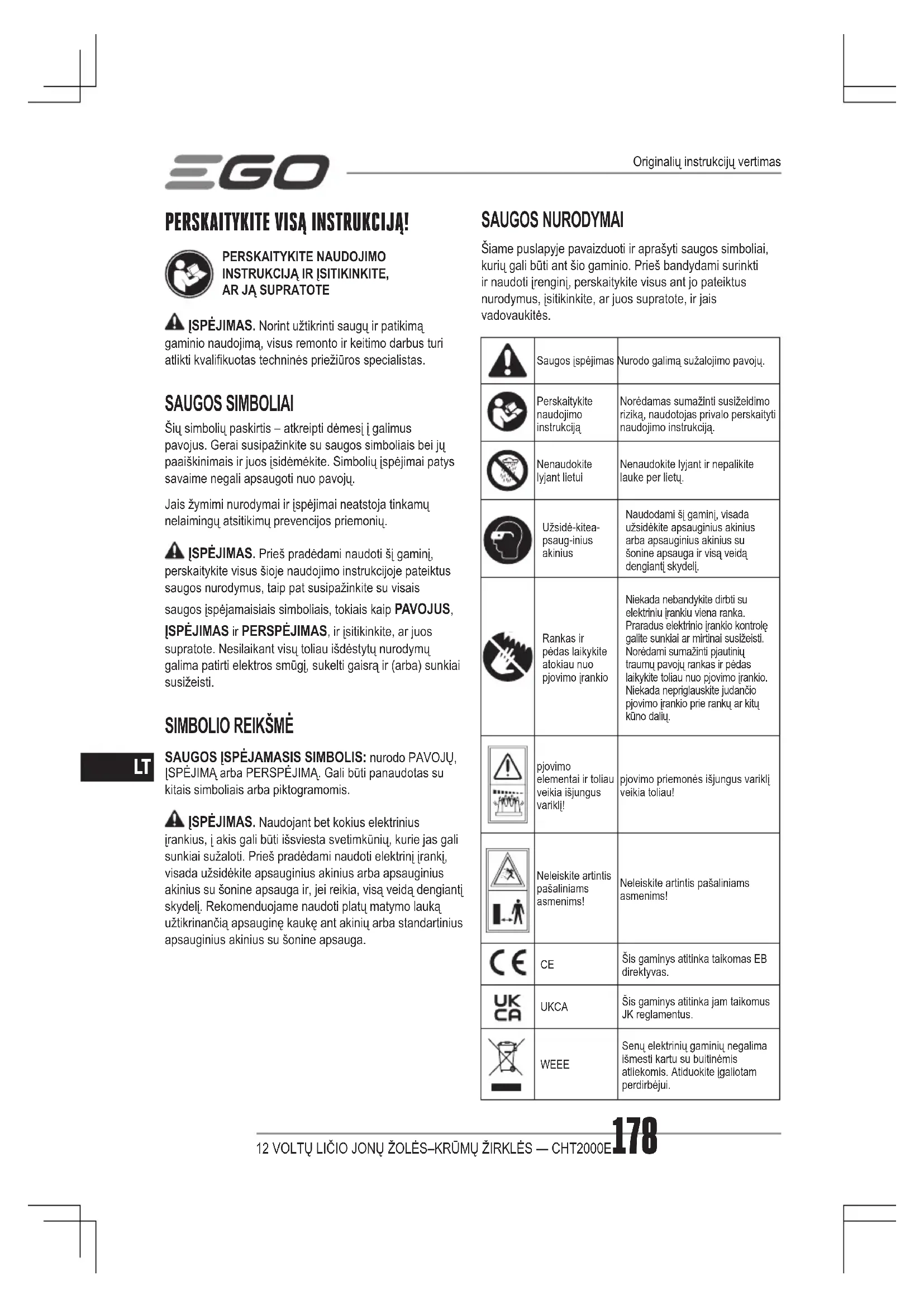 SAUGOS ĮSPĖJAMASIS SIMBOLIS: nurodo PAVOJŲ, ĮSPĖJIMĄ arba PERSPĖJIMĄ. Gali būti panaudotas su kitais simboliais arba piktogramomis. ĮSPĖJIMAS. Naudojant bet kokius elektrinius įrankius, į akis gali būti išsviesta svetimkūnių, kurie jas gali sunkiai sužaloti. Prieš pradėdami naudoti elektrinį įrankį, visada užsidėkite apsauginius akinius arba apsauginius akinius su šonine apsauga ir, jei reikia, visą veidą dengiantį skydelį. Rekomenduojame naudoti platų matymo lauką užtikrinančią apsauginę kaukę ant akinių arba standartinius apsauginius akinius su šonine apsauga. SAUGOS NURODYMAI Šiame puslapyje pavaizduoti ir aprašyti saugos simboliai, kurių gali būti ant šio gaminio. Prieš bandydami surinkti ir naudoti įrenginį, perskaitykite visus ant jo pateiktus nurodymus, įsitikinkite, ar juos supratote, ir jais vadovaukitės.Saugos įspėjimas Nurodo galimą sužalojimo pavojų.Perskaitykite naudojimo instrukcijąNorėdamas sumažinti susižeidimo riziką, naudotojas privalo perskaityti naudojimo instrukciją.Nenaudokite lyjant lietuiNenaudokite lyjant ir nepalikite lauke per lietų.Užsidė-kitea-psaug-inius akiniusNaudodami šį gaminį, visada užsidėkite apsauginius akinius arba apsauginius akinius su šonine apsauga ir visą veidą dengiantį skydelį.Rankas ir pėdas laikykite atokiau nuo pjovimo įrankioNiekada nebandykite dirbti su elektriniu įrankiu viena ranka. Praradus elektrinio įrankio kontrolę galite sunkiai ar mirtinai susižeisti. Norėdami sumažinti pjautinių traumų pavojų rankas ir pėdas laikykite toliau nuo pjovimo įrankio. Niekada nepriglauskite judančio pjovimo įrankio prie rankų ar kitų kūno dalių.pjovimo elementai ir toliau veikia išjungus variklį!pjovimo priemonės išjungus variklį veikia toliau!Neleiskite artintis pašaliniams asmenims!Neleiskite artintis pašaliniams asmenims! Šis gaminys atitinka taikomas EB direktyvas. UKCA Šis gaminys atitinka jam taikomus JK reglamentus. WEEE Senų elektrinių gaminių negalima išmesti kartu su buitinėmis atliekomis. Atiduokite įgaliotam perdirbėjui.Originalių instrukcijų vertimas12 VOLTŲ LIČIO JONŲ ŽOLĖS–KRŪMŲ ŽIRKLĖS — CHT2000E 179