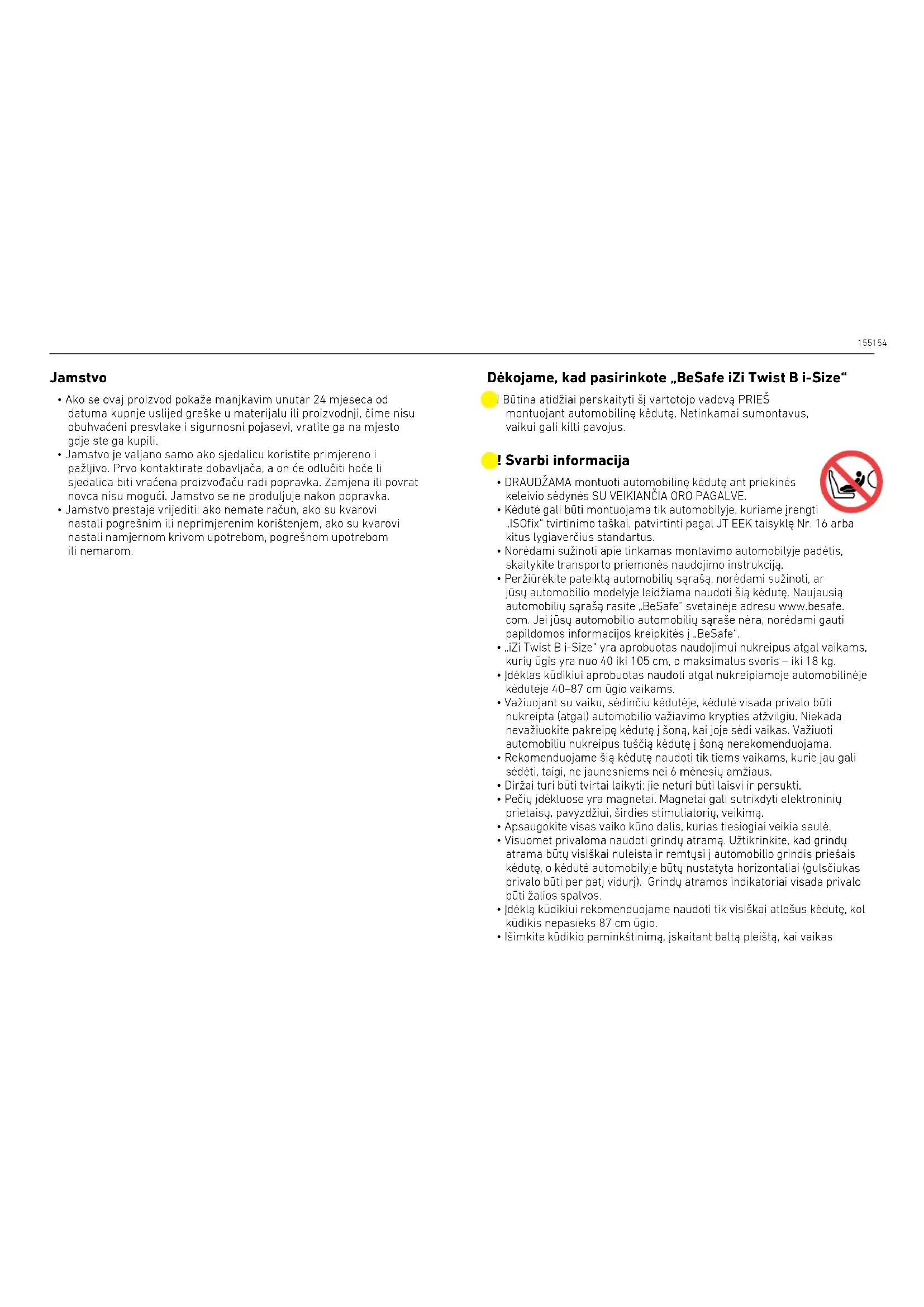 - Išimkite kūdikio paminkštinimą, įskaitant baltą pleištą, kai vaikas ! Būtina atidžiai perskaityti šį vartotojo vadovą PRIEŠ montuojant automobilinę kėdutę. Netinkamai sumontavus, vaikui gali kilti pavojus. Dėkojame, kad pasirinkote „BeSafe iZi Twist B i-Size“156 157 pasieks 60 cm ūgį arba taps vyresnis nei 4 metų amžiaus.