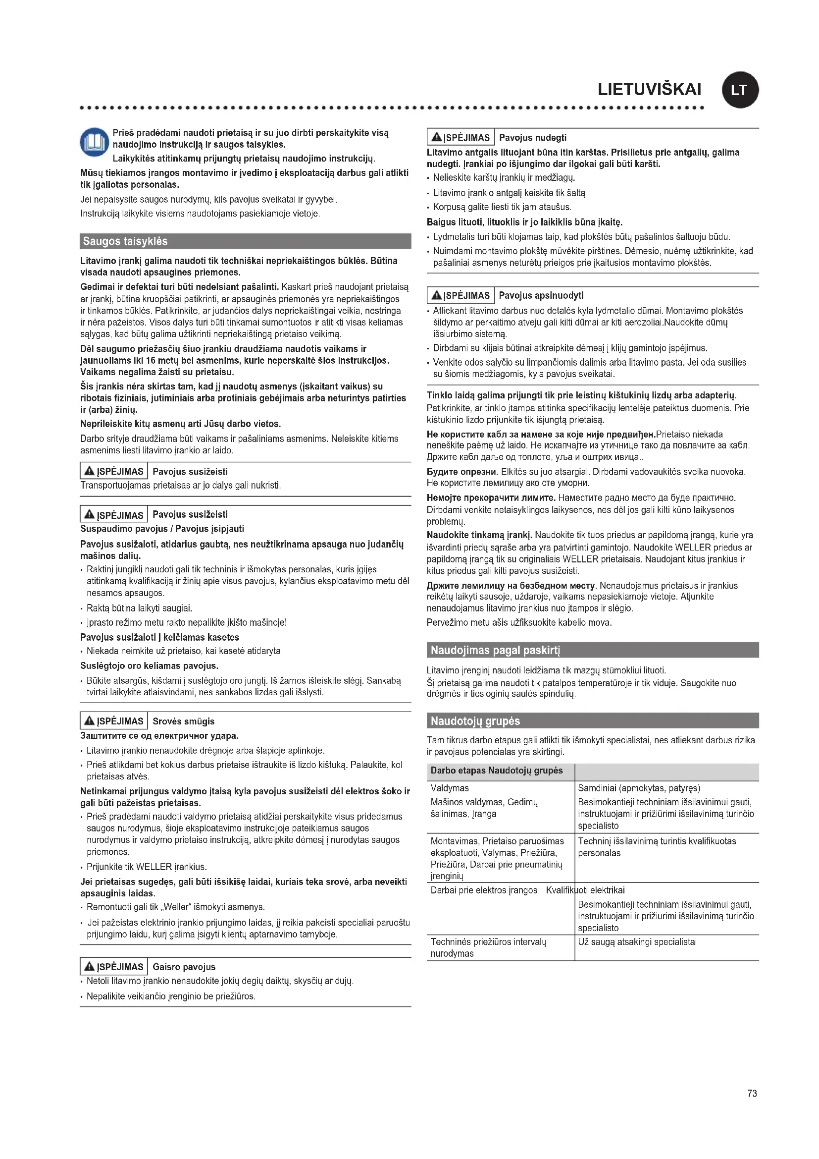 - Venkiteodossąlyčiosulimpančiomisdalimisarbalitavimopasta.Jeiodasusilies sušiomismedžiagomis,kylapavojussveikatai. Tinklo laidą galima prijungti tik prie leistinų kištukinių lizdų arba adapterių. Patikrinkite, ar tinklo įtampa atitinka specikacijų lentelėje pateiktus duomenis. Prie kištukinio lizdo prijunkite tik išjungtą prietaisą. Не користите кабл за намене за које није предвиђен.Prietaiso niekada neneškitepaėmęužlaido.Неискапчајтеизутичницетакодаповлачитезакабл. Држитекаблдаљеодтоплоте,уљаиоштрихивица.. Будите опрезни. Elkitėssujuoatsargiai.Dirbdamivadovaukitėssveikanuovoka. Некористителемилицуакостеуморни. Немојте прекорачити лимите. Наместитерадноместодабудепрактично. Dirbdamivenkitenetaisyklingoslaikysenos,nesdėljosgalikiltikūnolaikysenos problemų. Naudokite tinkamą įrankį. Naudokitetiktuospriedusarpapildomąįrangą,kurieyra išvardintipriedųsąrašearbayrapatvirtintigamintojo.NaudokiteWELLERpriedusar papildomąįrangątiksuoriginaliaisWELLERprietaisais.Naudojantkitusįrankiusir kituspriedusgalikiltipavojussusižeisti. Држите лемилицу на безбедном месту.Nenaudojamusprietaisusirįrankius reikėtųlaikytisausoje,uždaroje,vaikamsnepasiekiamojevietoje.Atjunkite nenaudojamuslitavimoįrankiusnuoįtamposirslėgio. Pervežimometuašisužksuokitekabeliomova. Naudojimas pagal paskirtį Litavimoįrenginįnaudotileidžiamatikmazgųstūmokliuilituoti. Šįprietaisągalimanaudotitikpatalpostemperatūrojeirtikviduje.Saugokitenuo drėgmėsirtiesioginiųsaulėsspindulių. Naudotojų grupės Tamtikrusdarboetapusgaliatliktitikišmokytispecialistai,nesatliekantdarbusrizika irpavojauspotencialasyraskirtingi. Darbo etapas Naudotojų grupės Valdymas Mašinosvaldymas,Gedimų šalinimas,Įranga Samdiniai(apmokytas,patyręs) Besimokantiejitechniniamišsilavinimuigauti, instruktuojamiirprižiūrimiišsilavinimąturinčio specialisto Montavimas,Prietaisoparuošimas eksploatuoti,Valymas,Priežiūra, Priežiūra,Darbaipriepneumatinių įrenginių Techninįišsilavinimąturintiskvalikuotas personalas Darbaiprieelektrosįrangos Kvalikuotielektrikai Besimokantiejitechniniamišsilavinimuigauti, instruktuojamiirprižiūrimiišsilavinimąturinčio specialisto Techninėspriežiūrosintervalų nurodymas Užsaugąatsakingispecialistai