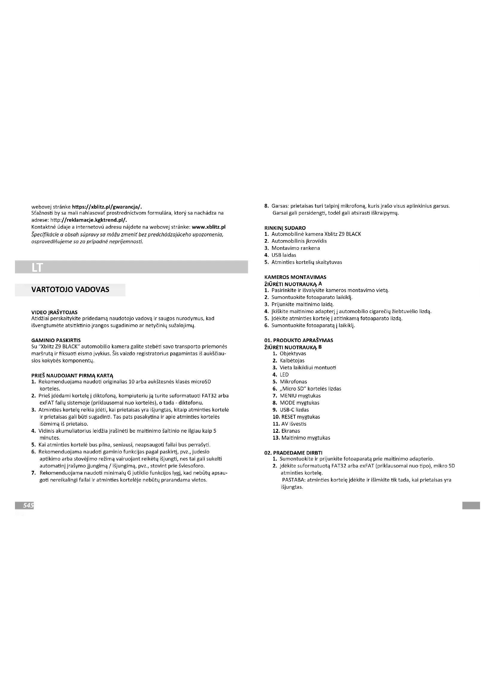 Produktui suteikiama 24 mėnesių garanja. Garanjos sąlygas rasite svetainėje hps://xblitz.pl/gwarancja/. Apie skundus reikėtų praneš naudojant formą, esančią adresu: hp://reklamacje.kgktrend.pl/. Kontaknę informaciją ir interneto svetainės adresą galima ras interneto svetainė- je www.xblitz.pl. Specikacijos ir rinkinio turinys gali keiss be išanksnio įspėjimo, atsiprašome už nepatogumus.