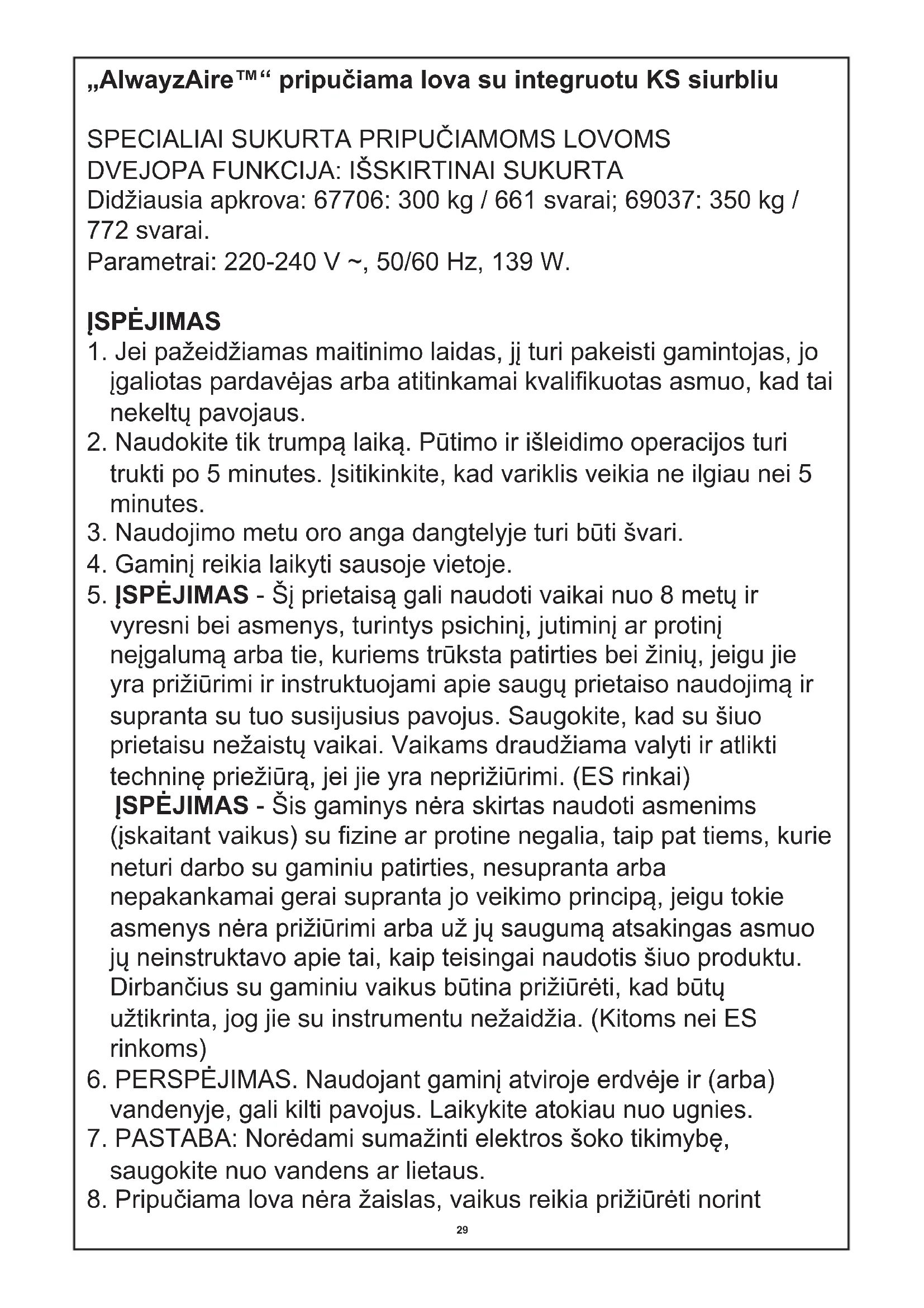 8. Pripučiama lova nėra žaislas, vaikus reikia prižiūrėti norint