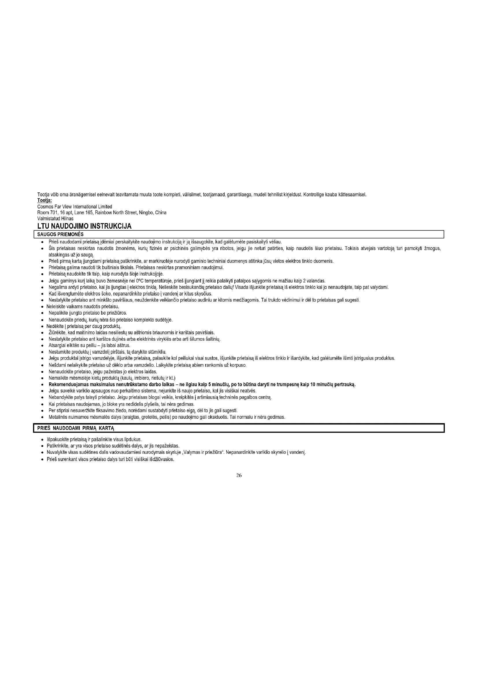 GARANTIJA NETAIKOMA EKSPLOATACINĖMS MEDŽIAGOMS (FILTRAMS, KERAMINĖMS IR NESVYLANČIOMS DANGOMS, GUMINIAMS SANDARINIMO ŽIEDAMS IR KT.). Prietaiso paminimo datą galima rasti serijos numeryje, kuris nurodytas identifikavimo lipduke ant gaminio dėžės ir/arba lipduke, užklijuotame ant paties gaminio. Serijos numerį sudaro 13 ženklų, 4-as ir 5-as ženklas reiškia prietaiso pagaminimo mėnesį, 6-as ir 7-as metus. Gamintojas savo nuožiūra ir papildomai nepranešdamas gali keisti gaminio komplekto sudėtį, išvaizdą, šalį gamintoją, garantijos terminą ir modelio techninius duomenis. Tikrinkite pasiimdami prietaisą. Gamintojas: Cosmos Far View International Limited Room 701, 16 apt, Lane 165, Rainbow North Street, Ningbo, China Pagaminta Kinijoje