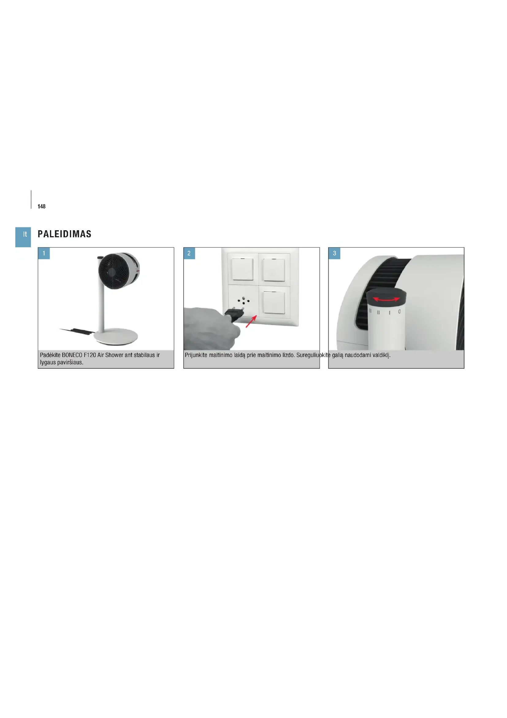 Padėkite BONECO F120 Air Shower ant stabilaus ir lygaus paviršiaus. Prijunkite maitinimo laidą prie maitinimo lizdo. Sureguliuokite galią naudodami valdiklį.149