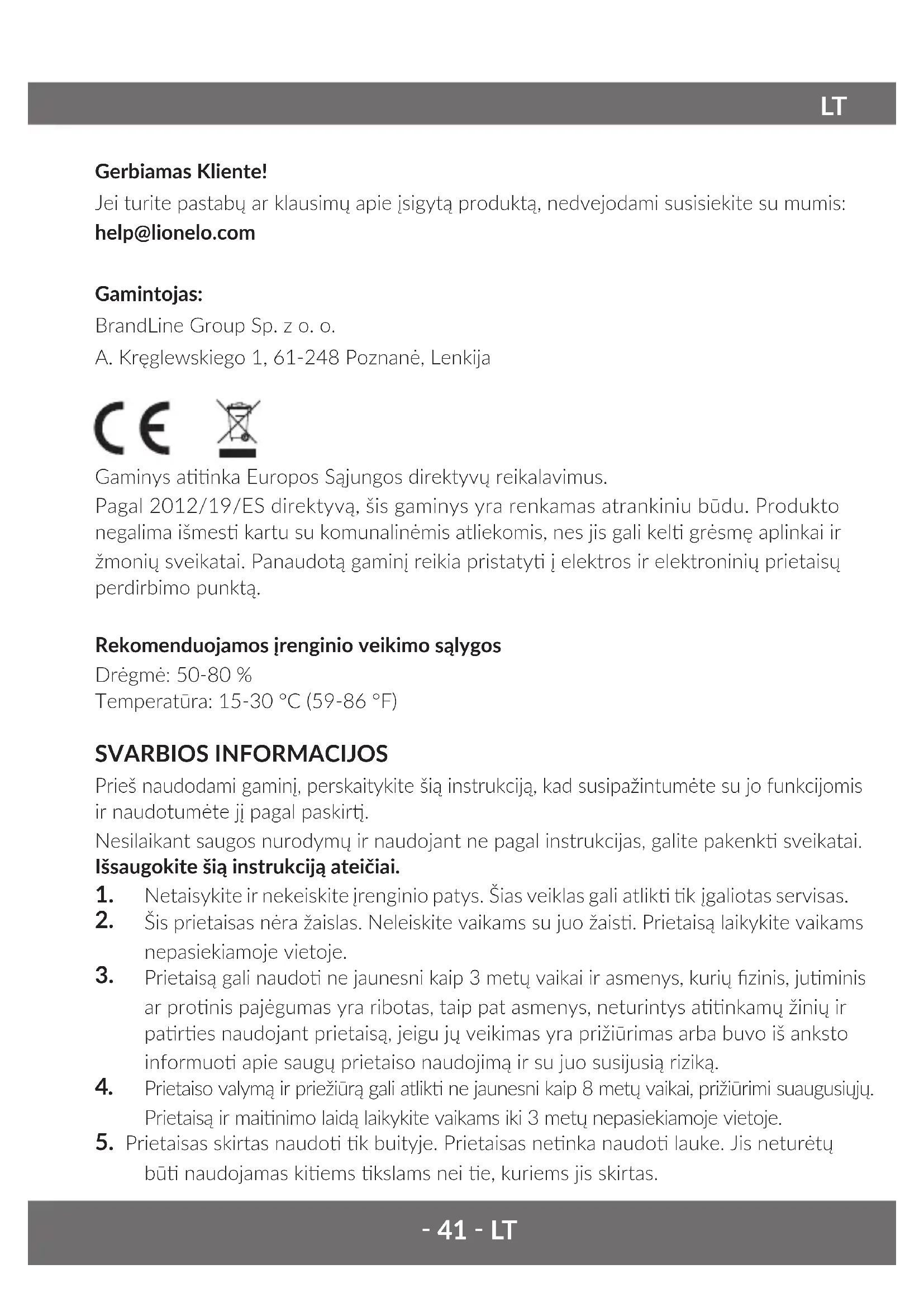 Gerbiamas Kliente! Jei turite pastabų ar klausimų apie įsigytą produktą, nedvejodami susisiekite su mumis: help@lionelo.com Gamintojas: BrandLine Group Sp. z o. o. A. Kręglewskiego 1, 61-248 Poznanė, Lenkija Gaminys anka Europos Sąjungos direktyvų reikalavimus. Pagal 2012/19/ES direktyvą, šis gaminys yra renkamas atrankiniu būdu. Produkto negalima išmes kartu su komunalinėmis atliekomis, nes jis gali kel grėsmę aplinkai ir žmonių sveikatai. Panaudotą gaminį reikia pristaty į elektros ir elektroninių prietaisų perdirbimo punktą. Rekomenduojamos įrenginio veikimo sąlygos Drėgmė: 50-80 % Temperatūra: 15-30 °C (59-86 °F) SVARBIOS INFORMACIJOS Prieš naudodami gaminį, perskaitykite šią instrukciją, kad susipažintumėte su jo funkcijomis ir naudotumėte jį pagal paskir. Nesilaikant saugos nurodymų ir naudojant ne pagal instrukcijas, galite pakenk sveikatai. Išsaugokite šią instrukciją ateičiai.