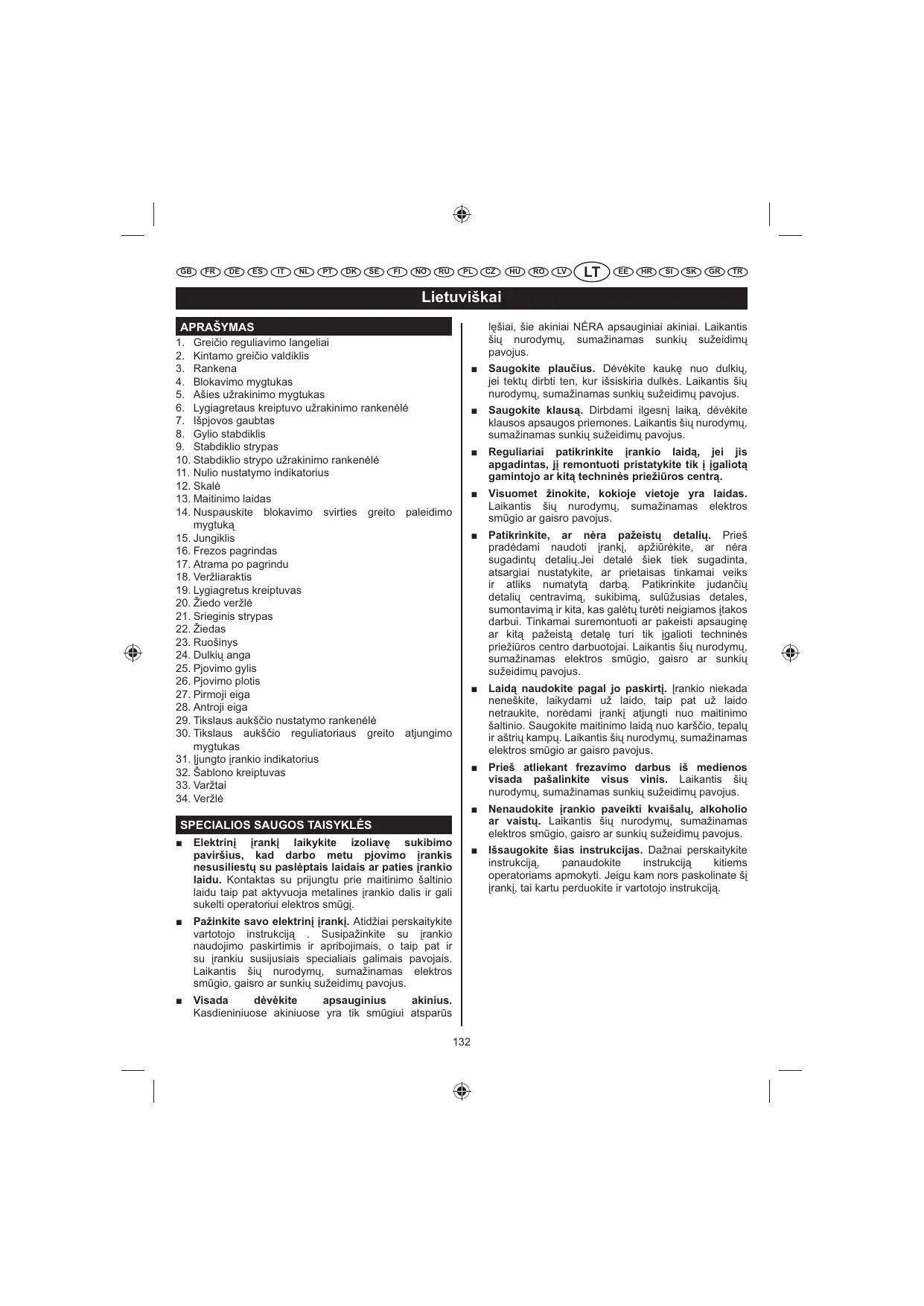 SPJIMAS Neišjungus (rankio iš elektros maitinimo šaltinio, variklis gali atsitiktinai užsivesti bei jus sunkiai sužeisti. DVIGUBA IZOLIACIJA Elektriniams (rankiams suteikia saugumo, nes d'l jos neb%tina naudoti trij laid (žemint maitinimo kabel(. Visos neapsaugotos metalin's detal's apsaugine izoliacija yra izoliuotos nuo vidini variklio komponent. Dvigubos izoliacijos prietais (žeminti nereikia. ATSARGIAI Kad nesugadintum'te ašies ir jos užrakto, visada leiskite varikliui visiškai sustoti prieš užrakindami ašies užrakt. SPJIMAS Dvigubos izoliacijos sistema skirta apsaugoti vartotoj nuo elektros sm%gio, kuris atsiranda nutr%kus prietaiso vidinei izoliacijai. Laikykit's vis (prast saugos priemoni, apsaugani nuo elektros sm%gio.