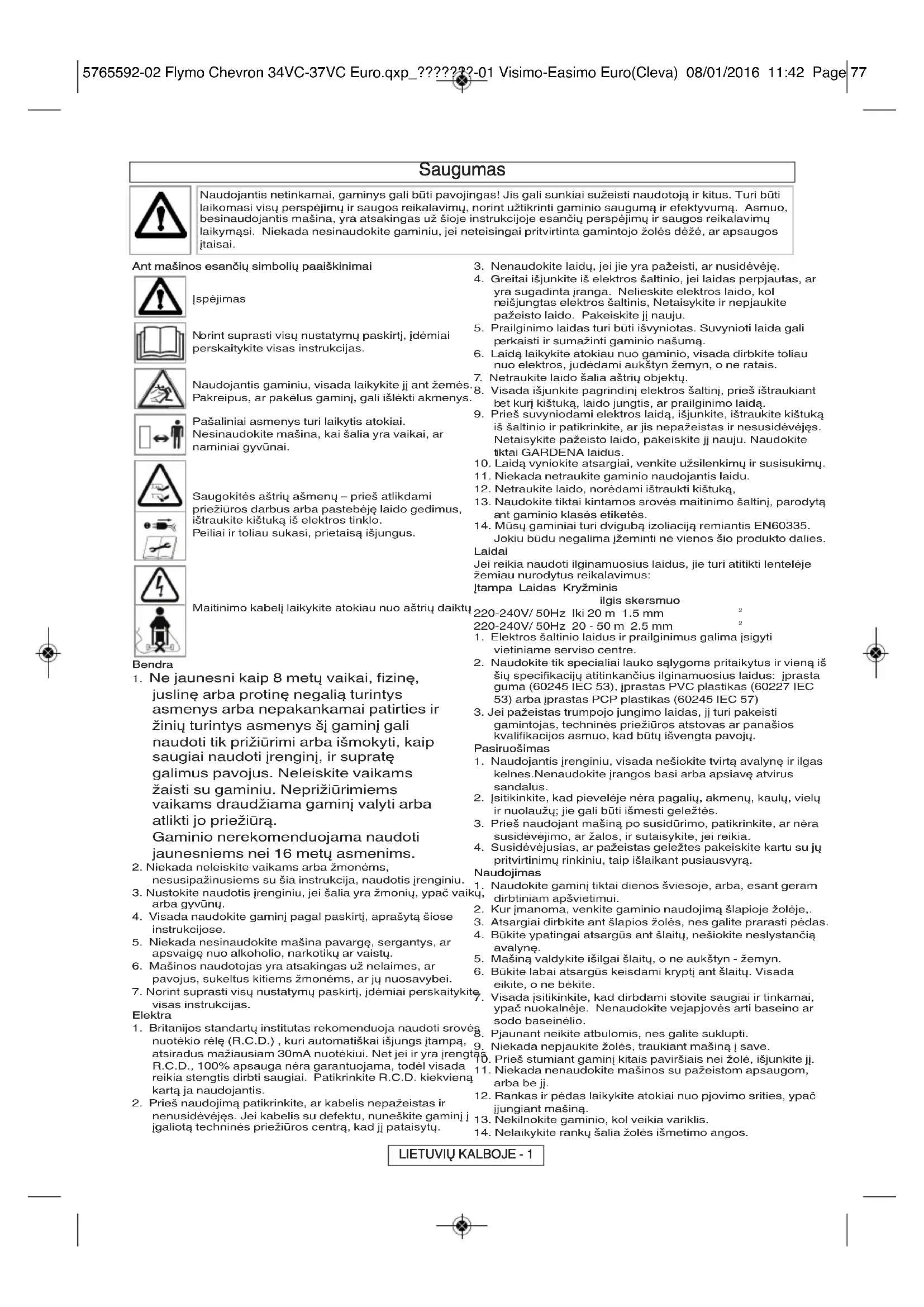- Husqvarna UK Ltd. ne preuzima garancijsku odgovornost za kvarove uzrokovane djelimično ili u potpunosti, izravno ili neizravno stavljajući ili zamjenjujući dijelove koji nisu proizvedeni ili odobreni od strane Husqvarna UK Ltd., ili ako je stroj modificiran na bilo koji način. 5765592-02 Flymo Chevron 34VC-37VC Euro.qxp_???????-01 Visimo-Easimo Euro(Cleva) 08/01/2016 11:42 Page 76Saugumas Naudojantis netinkamai, gaminys gali būti pavojingas! Jis gali sunkiai sužeisti naudotoją ir kitus. Turi būti laikomasi visų perspėjimų ir saugos reikalavimų, norint užtikrinti gaminio saugumą ir efektyvumą. Asmuo, besinaudojantis mašina, yra atsakingas už šioje instrukcijoje esančių perspėjimų ir saugos reikalavimų laikymąsi. Niekada nesinaudokite gaminiu, jei neteisingai pritvirtinta gamintojo žolės dėžė, ar apsaugos įtaisai. Ant mašinos esančių simbolių paaiškinimai Įspėjimas