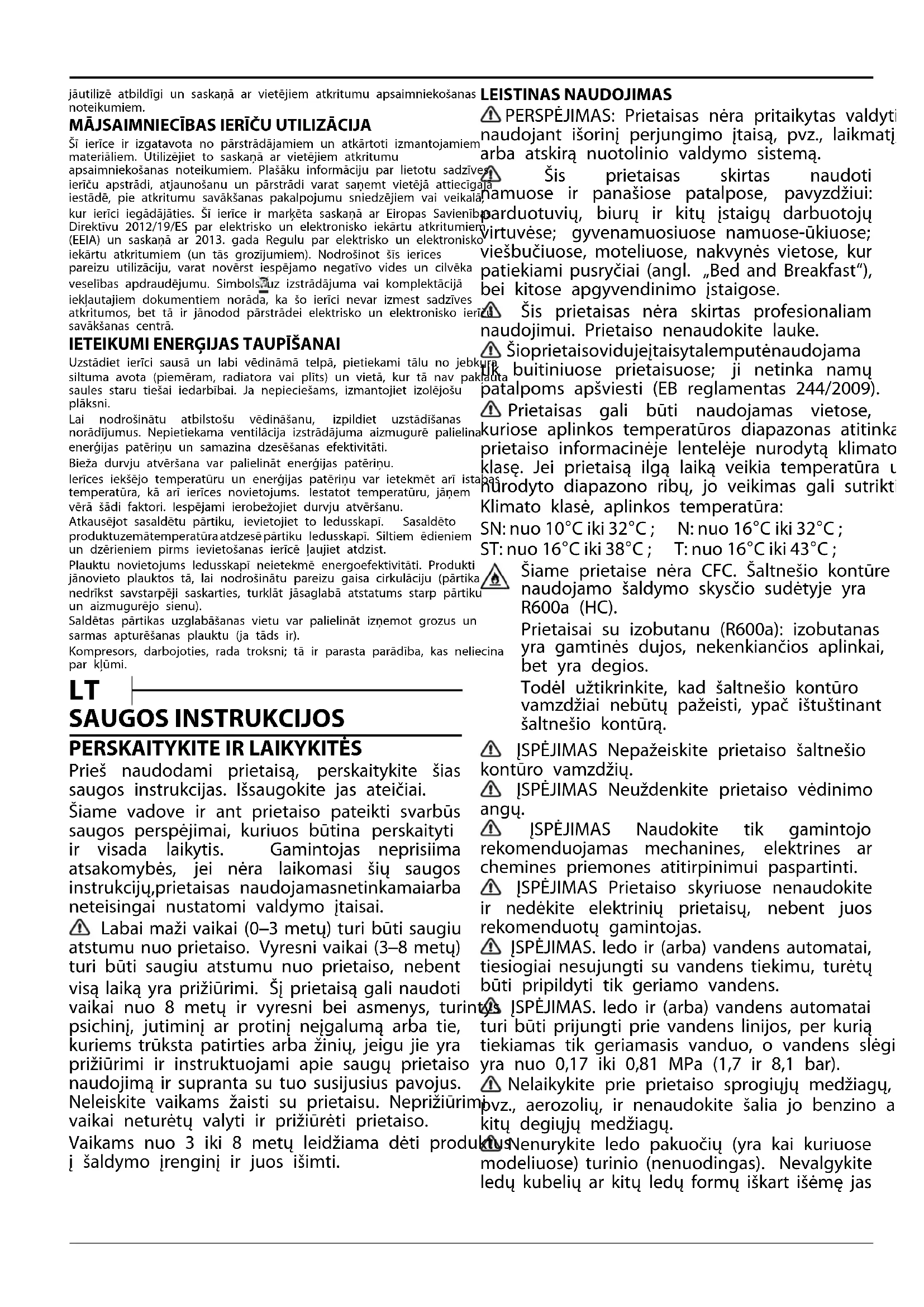 Prieš naudodami prietaisą, perskaitykite šias saugos instrukcijas. Išsaugokite jas ateičiai. Šiame vadove ir ant prietaiso pateikti svarbūs saugos perspėjimai, kuriuos būtina perskaityti ir visada laikytis. Gamintojas neprisiima atsakomybės, jei nėra laikomasi šių saugos instrukcijų,prietaisas naudojamasnetinkamaiarba neteisingai nustatomi valdymo įtaisai. Labai maži vaikai (0–3 metų) turi būti saugiu atstumu nuo prietaiso. Vyresni vaikai (3–8 metų) turi būti saugiu atstumu nuo prietaiso, nebent visą laiką yra prižiūrimi. Šį prietaisą gali naudoti vaikai nuo 8 metų ir vyresni bei asmenys, turintys psichinį, jutiminį ar protinį neįgalumą arba tie, kuriems trūksta patirties arba žinių, jeigu jie yra prižiūrimi ir instruktuojami apie saugų prietaiso naudojimą ir supranta su tuo susijusius pavojus. Neleiskite vaikams žaisti su prietaisu. Neprižiūrimi vaikai neturėtų valyti ir prižiūrėti prietaiso. Vaikams nuo 3 iki 8 metų leidžiama dėti produktus į šaldymo įrenginį ir juos išimti. LEISTINAS NAUDOJIMAS PERSPĖJIMAS: Prietaisas nėra pritaikytas valdyti naudojant išorinį perjungimo įtaisą, pvz., laikmatį, arba atskirą nuotolinio valdymo sistemą. Šis prietaisas skirtas naudoti namuose ir panašiose patalpose, pavyzdžiui: parduotuvių, biurų ir kitų įstaigų darbuotojų virtuvėse; gyvenamuosiuose namuose-ūkiuose; viešbučiuose, moteliuose, nakvynės vietose, kur patiekiami pusryčiai (angl. „Bed and Breakfast“), bei kitose apgyvendinimo įstaigose. Šis prietaisas nėra skirtas profesionaliam naudojimui. Prietaiso nenaudokite lauke. Šioprietaisovidujeįtaisytalemputėnaudojama tik buitiniuose prietaisuose; ji netinka namų patalpoms apšviesti (EB reglamentas 244/2009). Prietaisas gali būti naudojamas vietose, kuriose aplinkos temperatūros diapazonas atitinka prietaiso informacinėje lentelėje nurodytą klimato klasę. Jei prietaisą ilgą laiką veikia temperatūra už nurodyto diapazono ribų, jo veikimas gali sutrikti. Klimato klasė, aplinkos temperatūra: SN: nuo 10°C iki 32°C ; N: nuo 16°C iki 32°C ; ST: nuo 16°C iki 38°C ; T: nuo 16°C iki 43°C ; Šiame prietaise nėra CFC. Šaltnešio kontūre naudojamo šaldymo skysčio sudėtyje yra R600a (HC). Prietaisai su izobutanu (R600a): izobutanas yra gamtinės dujos, nekenkiančios aplinkai, bet yra degios. Todėl užtikrinkite, kad šaltnešio kontūro vamzdžiai nebūtų pažeisti, ypač ištuštinant šaltnešio kontūrą. ĮSPĖJIMAS Nepažeiskite prietaiso šaltnešio kontūro vamzdžių. ĮSPĖJIMAS Neuždenkite prietaiso vėdinimo angų. ĮSPĖJIMAS Naudokite tik gamintojo rekomenduojamas mechanines, elektrines ar chemines priemones atitirpinimui paspartinti. ĮSPĖJIMAS Prietaiso skyriuose nenaudokite ir nedėkite elektrinių prietaisų, nebent juos rekomenduotų gamintojas. ĮSPĖJIMAS. ledo ir (arba) vandens automatai, tiesiogiai nesujungti su vandens tiekimu, turėtų būti pripildyti tik geriamo vandens. ĮSPĖJIMAS. ledo ir (arba) vandens automatai turi būti prijungti prie vandens linijos, per kurią tiekiamas tik geriamasis vanduo, o vandens slėgis yra nuo 0,17 iki 0,81 MPa (1,7 ir 8,1 bar). Nelaikykite prie prietaiso sprogiųjų medžiagų, pvz., aerozolių, ir nenaudokite šalia jo benzino ar kitų degiųjų medžiagų. Nenurykite ledo pakuočių (yra kai kuriuose modeliuose) turinio (nenuodingas). Nevalgykite ledų kubelių ar kitų ledų formų iškart išėmę jasiš šaldymo kameros, nes jie gali sukelti šalčio nudegimus. Gaminiuose, kuriuoseturibūtinaudojamas oro filtras, esantis po ventiliatoriaus gaubtu, veikiant šaldytuvui šis filtras visada turi būti vietoje. Šaldymo kameroje nelaikykite stiklinių talpų su skysčiais, nes jos gali skilti. Neužstatykite ventiliatoriaus (jei yra) maisto produktais. Įdėję maistą patikrinkite, ar tinkamai uždarėte skyrių dureles, ypač šaldiklio dureles. Pažeistus tarpiklius būtina kuo greičiau pakeisti. Šaldytuvąnaudokitetikšviežiammaistuilaikyti, o šaldymo kamera skirta tik šaldytam maistui laikyti, šviežiam maistui šaldyti ir ledo kubeliams daryti. Nelaikykite nesuvynioto maisto šaldytuvo ar šaldiklio skyriuose, kad maistas nekontaktuotų su vidiniais paviršiais. Prietaisai gali turėti specialius skyrius (šviežio maisto skyrių, nulio laipsnių dėžę...). Jei kitaip nenurodytaspecialiame prietaisolankstinuke, juos galima išimti ir tai neturės įtakos veikimui. C pentanas naudojamas kaip porodaris izoliacinėse putose; tai yra degios dujos. Toliau pateikiami tinkamiausi skyriai tam tikro tipo maisto produktams laikyti, atsižvelgiant į skirtingą temperatūrų pasiskirstymą skirtinguose įrenginio skyriuose: - Šaldytuvo skyrius: