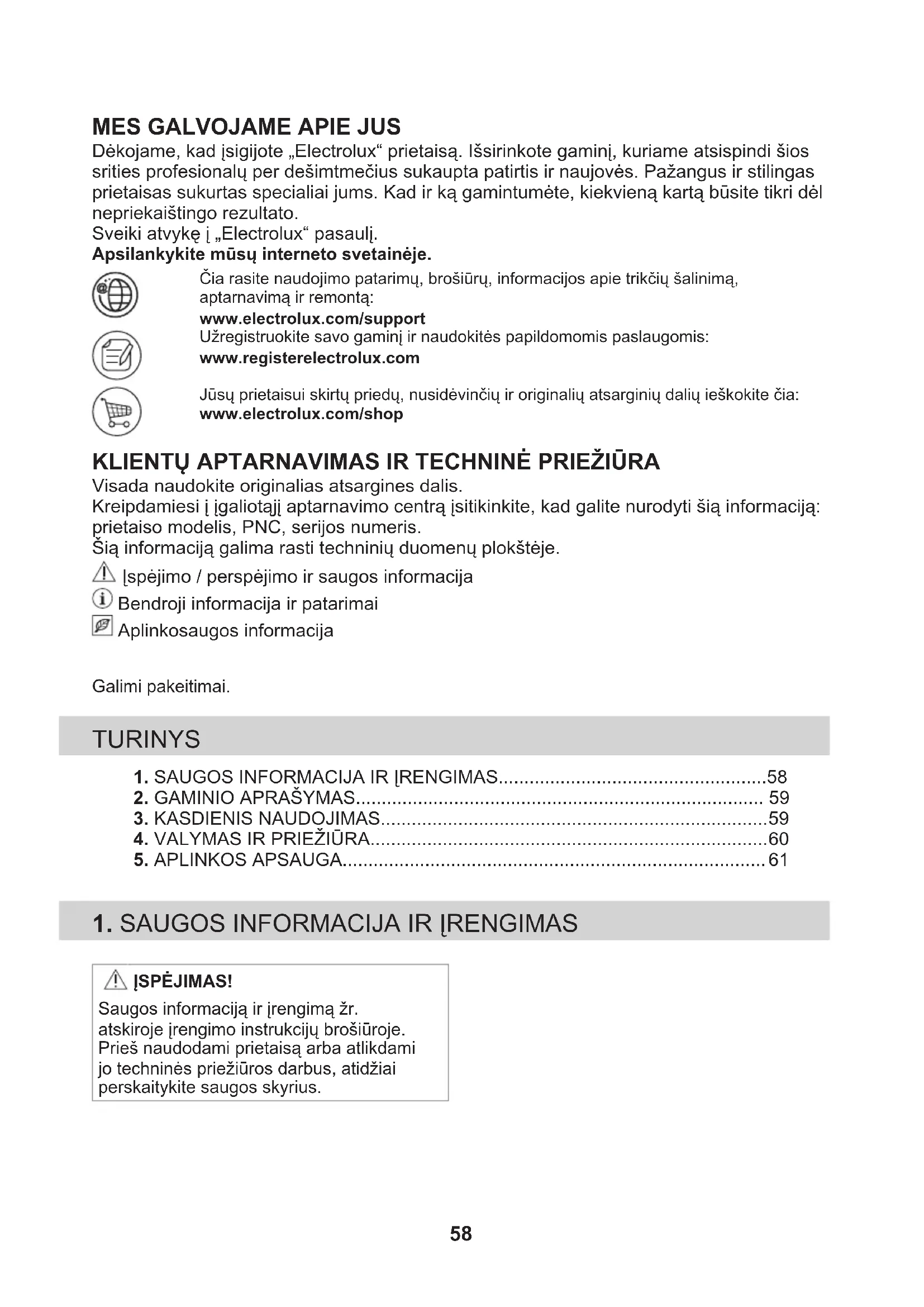 Dėkojame, kad įsigijote „Electrolux“ prietaisą. Išsirinkote gaminį, kuriame atsispindi šios srities profesionalų per dešimtmečius sukaupta patirtis ir naujovės. Pažangus ir stilingas prietaisas sukurtas specialiai jums. Kad ir ką gamintumėte, kiekvieną kartą būsite tikri dėl nepriekaištingo rezultato. Sveiki atvykę į „Electrolux“ pasaulį. Apsilankykite mūsų interneto svetainėje. Čia rasite naudojimo patarimų, brošiūrų, informacijos apie trikčių šalinimą,aptarnavimą ir remontą:www.electrolux.com/supportUžregistruokite savo gaminį ir naudokitės papildomomis paslaugomis:www.registerelectrolux.comJūsų prietaisui skirtų priedų, nusidėvinčių ir originalių atsarginių dalių ieškokite čia:www.electrolux.com/shop KLIENTŲ APTARNAVIMAS IR TECHNINĖ PRIEŽIŪRA Visada naudokite originalias atsargines dalis. Kreipdamiesi į įgaliotąjį aptarnavimo centrą įsitikinkite, kad galite nurodyti šią informaciją: prietaiso modelis, PNC, serijos numeris. Šią informaciją galima rasti techninių duomenų plokštėje. Įspėjimo / perspėjimo ir saugos informacija Bendroji informacija ir patarimai Aplinkosaugos informacija Galimi pakeitimai. TURINYS