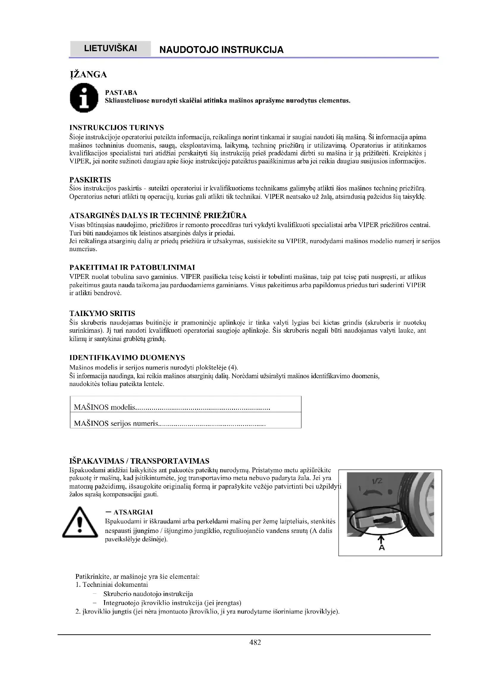 ĮŽANGA PASTABA Skliausteliuose nurodyti skaičiai atitinka mašinos aprašyme nurodytus elementus. INSTRUKCIJOS TURINYS Šioje instrukcijoje operatoriui pateikta informacija, reikalinga norint tinkamai ir saugiai naudoti šią mašiną. Ši informacija apima mašinos techninius duomenis, saugą, eksploatavimą, laikymą, techninę priežiūrą ir utilizavimą. Operatorius ir atitinkamos kvalifikacijos specialistai turi atidžiai perskaityti šią instrukciją prieš pradėdami dirbti su mašina ir ją prižiūrėti. Kreipkitės į VIPER, jei norite sužinoti daugiau apie šioje instrukcijoje pateiktus paaiškinimus arba jei reikia daugiau susijusios informacijos. PASKIRTIS Šios instrukcijos paskirtis - suteikti operatoriui ir kvalifikuotiems technikams galimybę atlikti šios mašinos techninę priežiūrą. Operatorius neturi atlikti tų operacijų, kurias gali atlikti tik technikai. VIPER neatsako už žalą, atsiradusią pažeidus šią taisyklę. ATSARGINĖS DALYS IR TECHNINĖ PRIEŽIŪRA Visas būtinąsias naudojimo, priežiūros ir remonto procedūras turi vykdyti kvalifikuoti specialistai arba VIPER priežiūros centrai. Turi būti naudojamos tik leistinos atsarginės dalys ir priedai. Jei reikalinga atsarginių dalių ar priedų priežiūra ir užsakymas, susisiekite su VIPER, nurodydami mašinos modelio numerį ir serijos numerius.