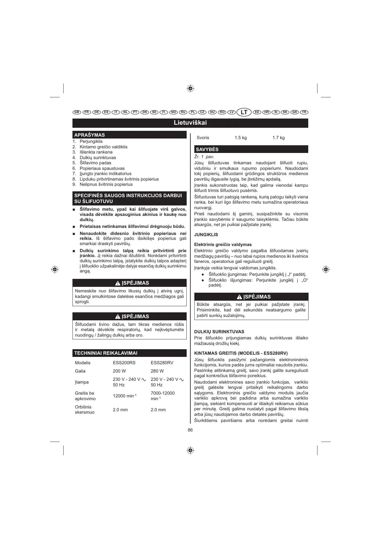 Dulkiô surinkimo talp¯ reikia pritvirtinti prie ùrankio. JƳ reikia dažnai ištuštinti. Nordami pritvirtinti dulki surinkimo talpą, Ƴstatykite dulki talpos adapterƳ Ƴ šlifuoklio užpakalinje dalyje esanią dulki surinkimo angą. SAVYBðS JUNGIKLIS Elektrinis greiºio valdymas Elektrinio greiio valdymo pagalba šlifuodamas Ƴvairi medžiag pavirši – nuo labai rupios medienos iki švelnios faneros, operatorius gali reguliuoti greitƳ. rankyje veikia lengvai valdomas jungiklis. È Šlifuoklio Ƴjungimas: Perjunkite jungiklƳ Ƴ „I“ padtƳ. È Šlifuoklio išjungimas: Perjunkite jungiklƳ Ƴ „O“ padtƳ. ûSPðJIMAS Nemeskite nuo šlifavimo likusi dulki Ƴ atvirą ugnƳ, kadangi smulkintose dalelse esanios medžiagos gali sprogti. ûSPðJIMAS Bkite atsargs, net jei puikiai pažƳstate ƳrankƳ. Prisiminkite, kad dl sekunds neatsargumo galite patirti sunki sužalojim. ûSPðJIMAS Šlifuodami švino dažus, tam tikras medienos ršis ir metalą dvkite respiratori, kad neƳkvptumte nuoding / žaling dulki arba oro. DULKIþ SURINKTUVAS Prie šlifuoklio prijungiamas dulki surinktuvas išlaiko mažiausią drožli kiekƳ. TECHNINIAI REIKALAVIMAI Modelis ESS200RS ESS280RV Galia 200 W 280 W tampa 230 V - 240 V 50 Hz 230 V - 240 V 50 Hz Greitis be apkrovimo 12000 min-1 7000-12000 min-1 Orbitinis skersmuo