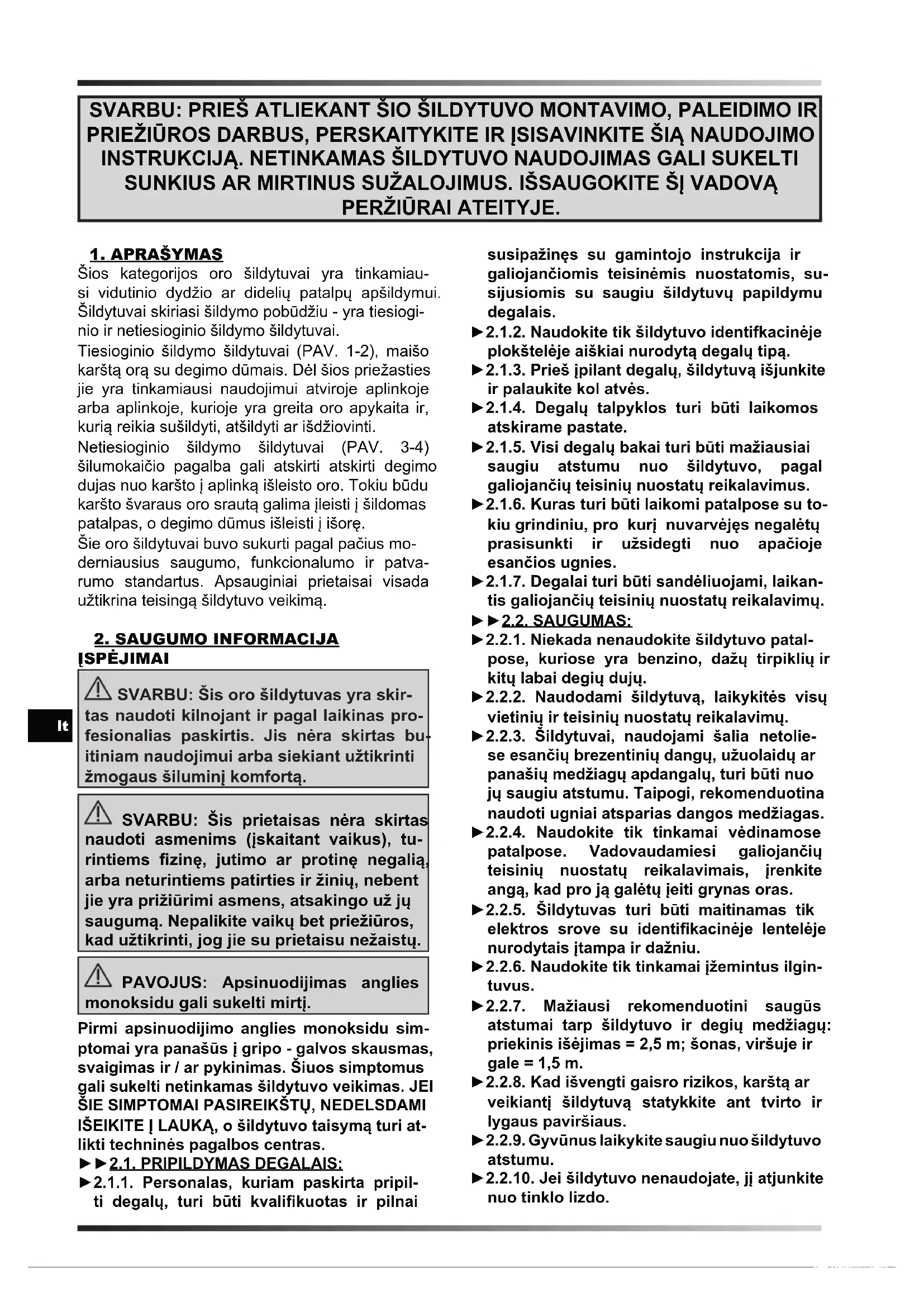 ĮSPĖJIMAI SVARBU: Šis oro šildytuvas yra skir- tas naudoti kilnojant ir pagal laikinas pro- fesionalias paskirtis. Jis nėra skirtas bu- itiniam naudojimui arba siekiant užtikrinti žmogaus šiluminį komfortą. SVARBU: Šis prietaisas nėra skirtas naudoti asmenims (įskaitant vaikus), tu- rintiems zinę, jutimo ar protinę negalią, arba neturintiems patirties ir žinių, nebent jie yra prižiūrimi asmens, atsakingo už jų saugumą. Nepalikite vaikų bet priežiūros, kad užtikrinti, jog jie su prietaisu nežaistų. PAVOJUS: Apsinuodijimas anglies monoksidu gali sukelti mirtį. Pirmi apsinuodijimo anglies monoksidu sim- ptomai yra panašūs į gripo - galvos skausmas, svaigimas ir / ar pykinimas. Šiuos simptomus gali sukelti netinkamas šildytuvo veikimas. JEI