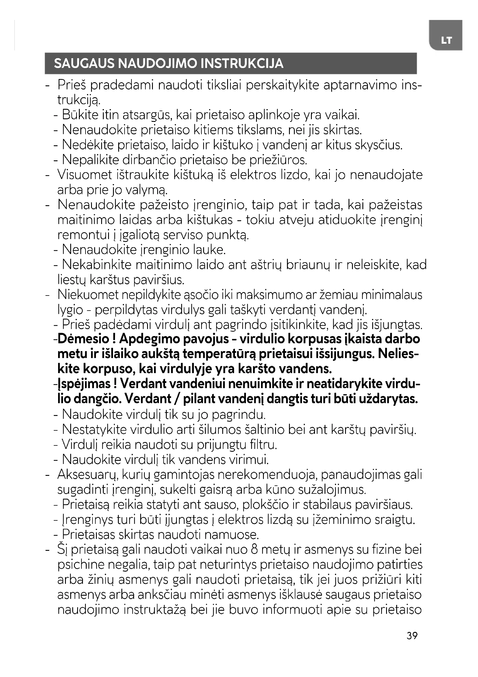 Įspėjimas ! Verdant vandeniui nenuimkite ir neatidarykite virdu- lio dangčio. Verdant / pilant vandenį dangtis turi būti uždarytas. - Naudokite virdulį tik su jo pagrindu. - Nestatykite virdulio arti šilumos šaltinio bei ant karštų paviršių. - Virdulį reikia naudoti su prijungtu filtru. - Naudokite virdulį tik vandens virimui.