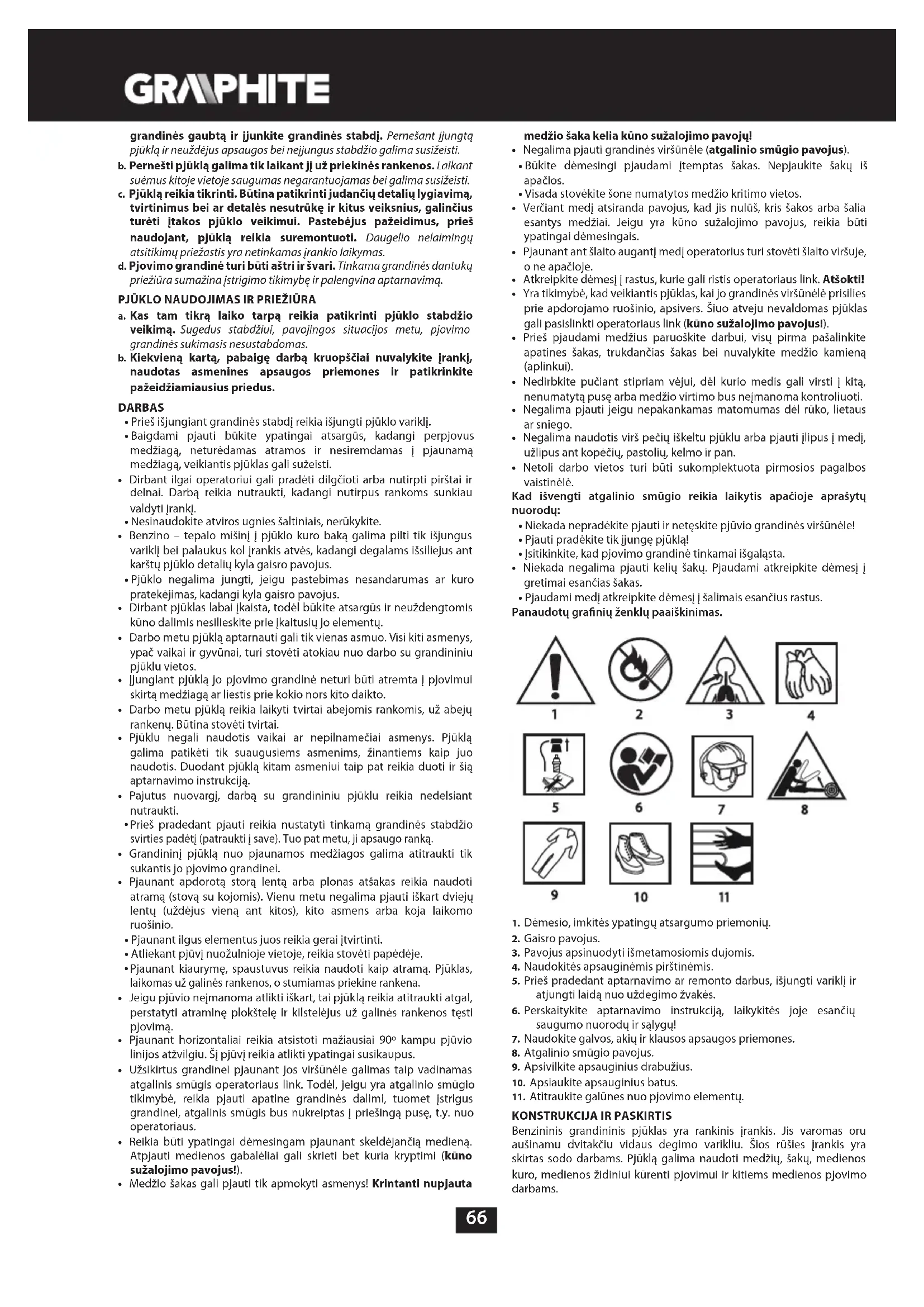 - Negalima naudotis virš pečių iškeltu pjūklu arba pjauti įlipus į medį, užlipus ant kopėčių, pastolių, kelmo ir pan.
