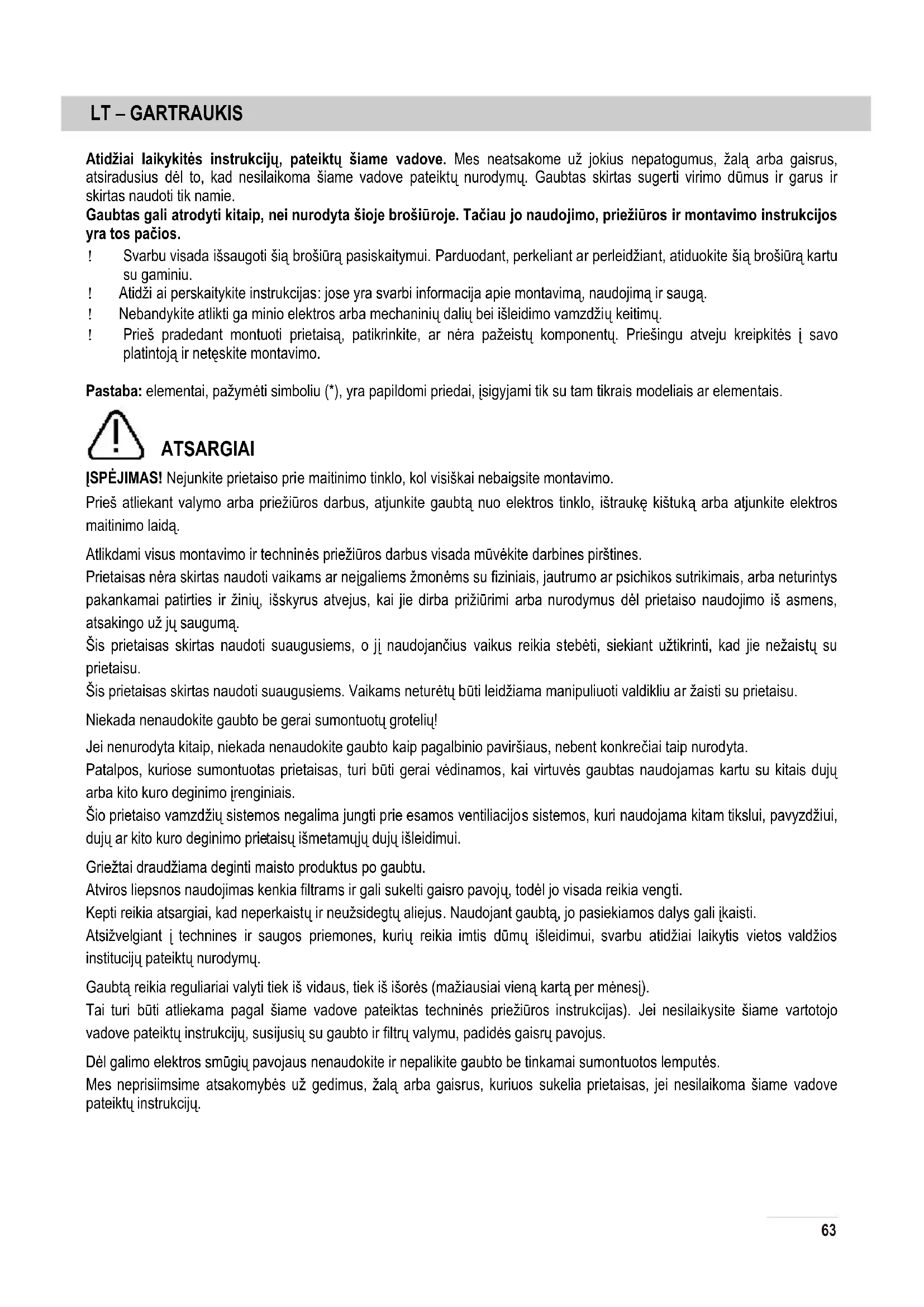 Ауа сорғыны түрлі қабырғалар мен төбеге бекіту үшін дюбельдер ұсынылады. Монтаждауды бастамас бұрын білікті маман қабырға беті мен төбенің сәйкестігін тексеруі тиіс. Қабырға немесе төбе аспап салмағына шыдау үшін берік болуы тиіс. Ауа сорғыны қабырғаға сұйық шегені ң, силиконның және т.б. Көмегімен бекітпеңіз. Аспап тек ілінетін монтаждауға арналған. Өнiм сапасына қойылатын талаптарды мына мекен-жай бойынша жiберуiңiздi сұраймыз: Қазақстан Республикасы, Алматы қаласы, Бегалин қ. 19\49, Пр-во «Gorenje», тел 8 (727) 293 03 07 Претензии по качеству продукции направлять по адресу: Республика Казахстан, г. Алматы, ул. Бегалина, дом 19\49, Пр-во «Gorenje» 8 (727) 293 03 07 Қытайда жасалған 61Өртенген шамды ауыстырыңыз. жарықдиодты E14 LED 4Wx1 шамдарын ғана қолданыңыз. Толығырақ нұсқаулықтағы 20 жəне 21 суреттерді қараңыз. 62Atidžiai laikykitės instrukcijų, pateiktų šiame vadove. Mes neatsakome už jokius nepatogumus, žalą arba gaisrus, atsiradusius dėl to, kad nesilaikoma šiame vadove pateiktų nurodymų. Gaubtas skirtas sugerti virimo dūmus ir garus ir skirtas naudoti tik namie. Gaubtas gali atrodyti kitaip, nei nurodyta šioje brošiūroje. Tačiau jo naudojimo, priežiūros ir montavimo instrukcijos yra tos pačios. ! Svarbu visada išsaugoti šią brošiūrą pasiskaitymui. Parduodant, perkeliant ar perleidžiant, atiduokite šią brošiūrą kartu su gaminiu. ! Atidži ai perskaitykite instrukcijas: jose yra svarbi informacija apie montavimą, naudojimą ir saugą. ! Nebandykite atlikti ga minio elektros arba mechaninių dalių bei išleidimo vamzdžių keitimų. ! Prieš pradedant montuoti prietaisą, patikrinkite, ar nėra pažeistų komponentų. Priešingu atveju kreipkitės į savo platintoją ir netęskite montavimo. Pastaba: elementai, pažymėti simboliu (*), yra papildomi priedai, įsigyjami tik su tam tikrais modeliais ar elementais. ATSARGIAI ĮSPĖJIMAS! Nejunkite prietaiso prie maitinimo tinklo, kol visiškai nebaigsite montavimo. Prieš atliekant valymo arba priežiūros darbus, atjunkite gaubtą nuo elektros tinklo, ištraukę kištuką arba atjunkite elektros maitinimo laidą. Atlikdami visus montavimo ir techninės priežiūros darbus visada mūvėkite darbines pirštines. Prietaisas nėra skirtas naudoti vaikams ar neįgaliems žmonėms su fiziniais, jautrumo ar psichikos sutrikimais, arba neturintys pakankamai patirties ir žinių, išskyrus atvejus, kai jie dirba prižiūrimi arba nurodymus dėl prietaiso naudojimo iš asmens, atsakingo už jų saugumą. Šis prietaisas skirtas naudoti suaugusiems, o jį naudojančius vaikus reikia stebėti, siekiant užtikrinti, kad jie nežaistų su prietaisu. Šis prietaisas skirtas naudoti suaugusiems. Vaikams neturėtų būti leidžiama manipuliuoti valdikliu ar žaisti su prietaisu. Niekada nenaudokite gaubto be gerai sumontuotų grotelių! Jei nenurodyta kitaip, niekada nenaudokite gaubto kaip pagalbinio paviršiaus, nebent konkrečiai taip nurodyta. Patalpos, kuriose sumontuotas prietaisas, turi būti gerai vėdinamos, kai virtuvės gaubtas naudojamas kartu su kitais dujų arba kito kuro deginimo įrenginiais. Šio prietaiso vamzdžių sistemos negalima jungti prie esamos ventiliacijos sistemos, kuri naudojama kitam tikslui, pavyzdžiui, dujų ar kito kuro deginimo prie taisų išmetamųjų dujų išleidimui. Griežtai draudžiama deginti maisto produktus po gaubtu. Atviros liepsnos naudojimas kenkia filtrams ir gali sukelti gaisro pavojų, todėl jo visada reikia vengti. Kepti reikia atsargiai, kad neperkaistų ir neužsidegtų aliejus. Naudojant gaubtą, jo pasiekiamos dalys gali įkaisti. Atsižvelgiant į technines ir saugos priemones, kurių reikia imtis dūmų išleidimui, svarbu atidžiai laikytis vietos valdžios institucijų pateiktų nurodymų. Gaubtą reikia reguliariai valyti tiek iš vidaus, tiek iš išorės (mažiausiai vieną kartą per mėnesį). Tai turi būti atliekama pagal šiame vadove pateiktas techninės priežiūros instrukcijas). Jei nesilaikysite šiame vartotojo vadove pateiktų instrukcijų, susijusių su gaubto ir filtrų valymu, padidės gaisrų pavojus. Dėl galimo elektros smūgių pavojaus nenaudokite ir nepalikite gaubto be tinkamai sumontuotos lemputės. Mes neprisiimsime atsakomybės už gedimus, žalą arba gaisrus, kuriuos sukelia prietaisas, jei nesilaikoma šiame vadove pateiktų instrukcijų. LT – GARTRAUKIS 63Šis prietaisas pažymėtas pagal Europos direktyvą 2002/96/EB dėl elektros ir elektroninės įrangos atliekų (EEĮA). Tinkami utilizuodami šį produktą, padėsite apsaugoti nuo galimų neigiamų pasekmių aplinkai ir žmogaus sveikatai, kurias gali sukelti netinkamas šio produkto atliekų tvarkymas. Simbolis ____ ant gaminio arba kartu su juo pridedamuose dokumentuose rodo, kad šis prietaisas negali būti išmetamas kartu su buitinėmis atliekomis.. Vietoj to jį reikia priduoti į tinkamą elektros ir elektroninės įrangos surinkimo punktą perdirbti. Atliekos turi būti tvarkomos pagal vietinius aplinkosaugos reikalavimus atliekų š alinimui. Jei norite gauti išsamesnės informacijos apie šio gaminio gamybą, surinkimą ir perdirbimą, kreipkitės į atitinkamą vietinių valdžios institucijų skyrių arba vietos buitinių atliekų skyrių arba parduotuvę, kurioje pirkote šį gaminį. Prietaisas suprojektuotas, išbandytas ir pagamintas pagal: Sa