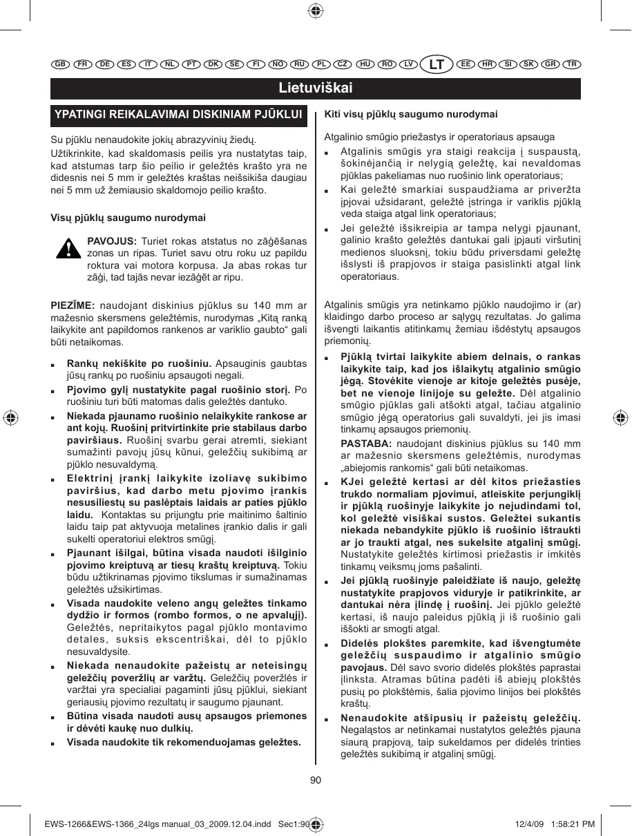 PASTABA: naudoant diskinius pjuklus su 140 mm ar mazesnio skersmens geleztemis, nurodymas "abiejomis rankomis" gali buti netaikomas.