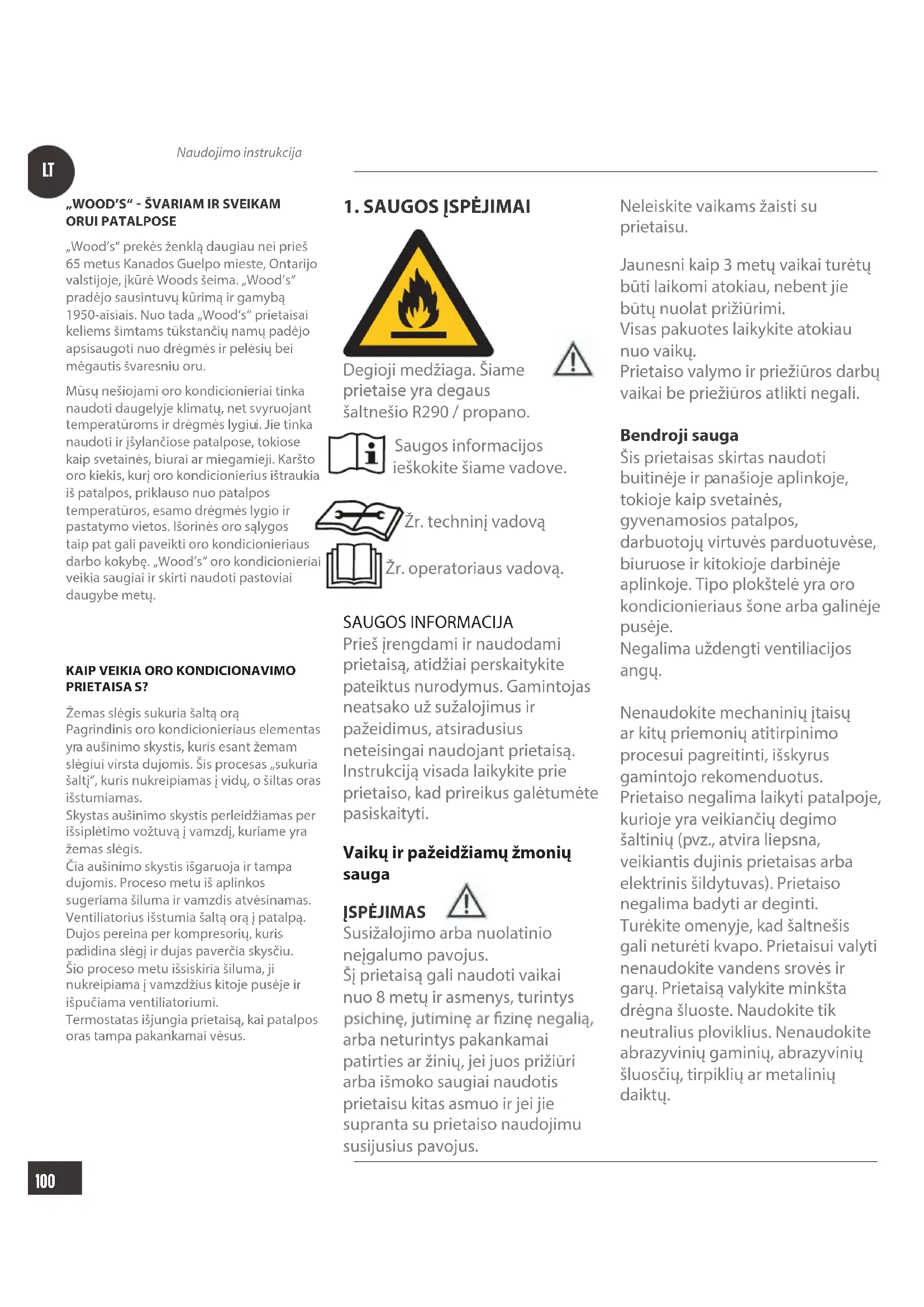 Naudojimo instrukcija„WOOD’S“ ŠVARIAM IR SVEIKAM ORUI PATALPOSE„Wood’s“ prekės ženklą daugiau nei prieš 65 metus Kanados Guelpo mieste, Ontarijo valstijoje, įkūrė Woods šeima. „Wood’s“ pradėjo sausintuvų kūrimą ir gamybą 1950-aisiais. Nuo tada „Wood‘s“ prietaisai keliems šimtams tūkstančių namų padėjo apsisaugoti nuo drėgmės ir pelėsių bei mėgautis švaresniu oru. Mūsų nešiojami oro kondicionieriai tinka naudoti daugelyje klimatų, net svyruojant temperatūroms ir drėgmės lygiui. Jie tinka naudoti ir įšylančiose patalpose, tokiose ip svetainės, biurai ar miegamieji. Karšto oro kiekis, kurį oro kondicionierius ištraukia iš patalpos, priklauso nuo patalpos temperatūros, esamo drėgmės lygio ir pastatymo vietos. Išorinės oro sąlygos taip pat gali paveikti oro kondicionieriaus darbo kokybę. „Wood’s“ oro kondicionieriai veikia saugiai ir skirti naudoti pastoviai daugybe metų. KAIP VEIKIA ORO KONDICIONAVIMO PRIETAISA Žemas slėgis sukuria šaltą orąPagrindinis oro kondicionieriaus elementas a aušinimo skystis, kuris esant žemam slėgiui virsta dujomis. Šis procesas „sukuria šaltį“, kuris nukreipiamas į vidų, o šiltas oras išstumiamas.Skystas aušinimo skystis perleidžiamas per išsiplėtimo vožtuvą į vamzdį, kuriame yra žemas slėgis.Čia aušinimo skystis išgaruoja ir tampa dujomis. Proceso metu iš aplinkos sugeriama šiluma ir vamzdis atvėsinamas.Ventiliatorius išstumia šaltą orą į patalpą.Dujos pereina per kompresorių, kuris didina slėgį ir dujas paverčia skysčiu.Šio proceso metu išsiskiria šiluma, ji nukreipiama į vamzdžius kitoje pusėje ir išpučiama ventiliatoriumi.Termostatas išjungia prietaisą, kai patalpos oras tampa pakankamai vėsus.