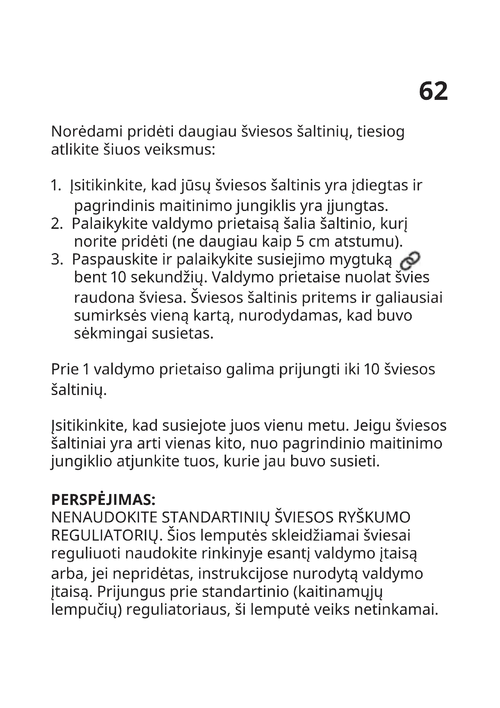 bent 10 sekundžių. Valdymo prietaise nuolat švies raudona šviesa. Šviesos šaltinis pritems ir galiausiai sumirksės vieną kartą, nurodydamas, kad buvo sėkmingai susietas. Prie 1 valdymo prietaiso galima prijungti iki 10 šviesos šaltinių. Įsitikinkite, kad susiejote juos vienu metu. Jeigu šviesos šaltiniai yra arti vienas kito, nuo pagrindinio maitinimo jungiklio atjunkite tuos, kurie jau buvo susieti. PERSPĖJIMAS: