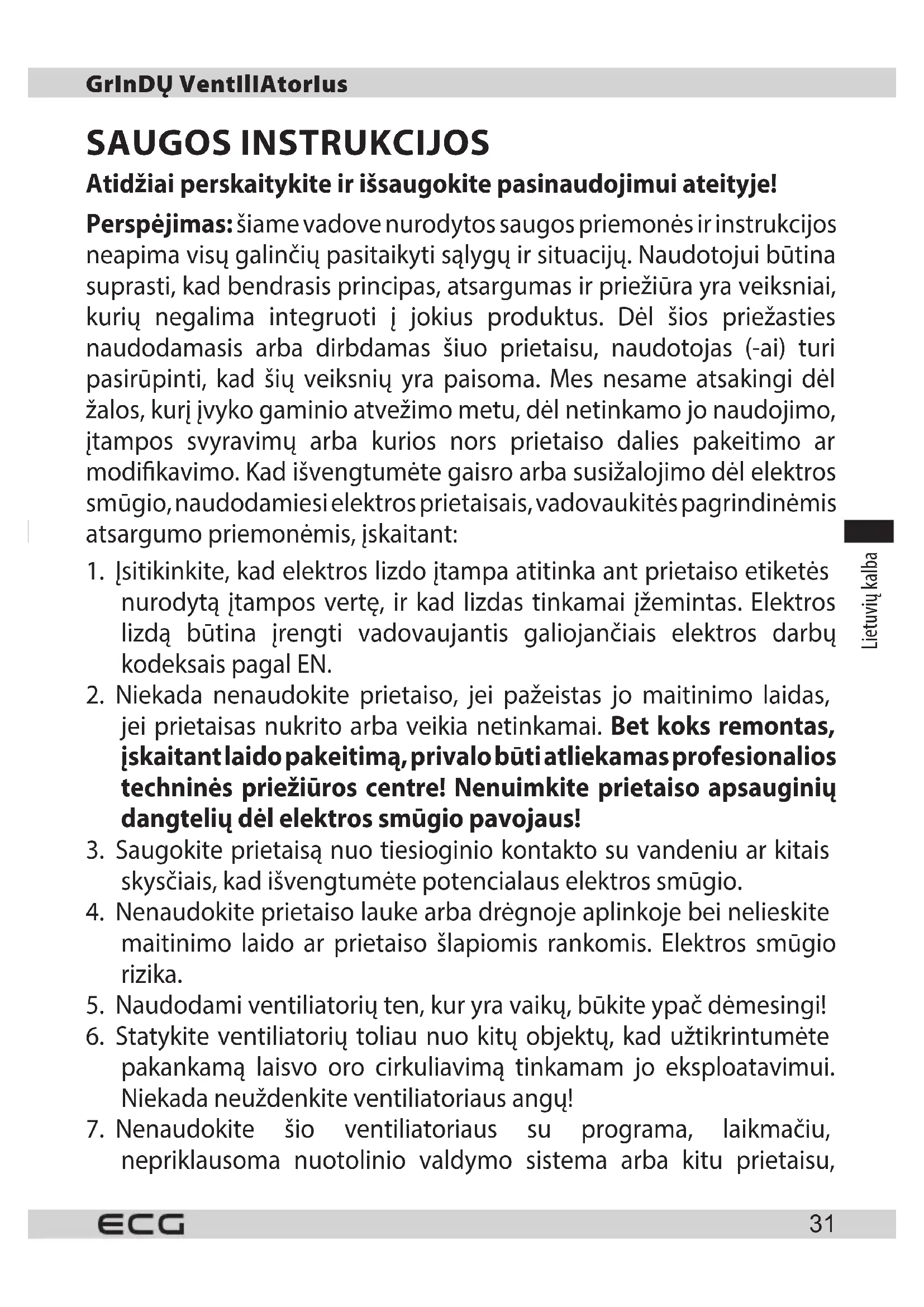5. Naudodami ventiliatorių ten, kur yra vaikų, būkite ypač dėmesingi!