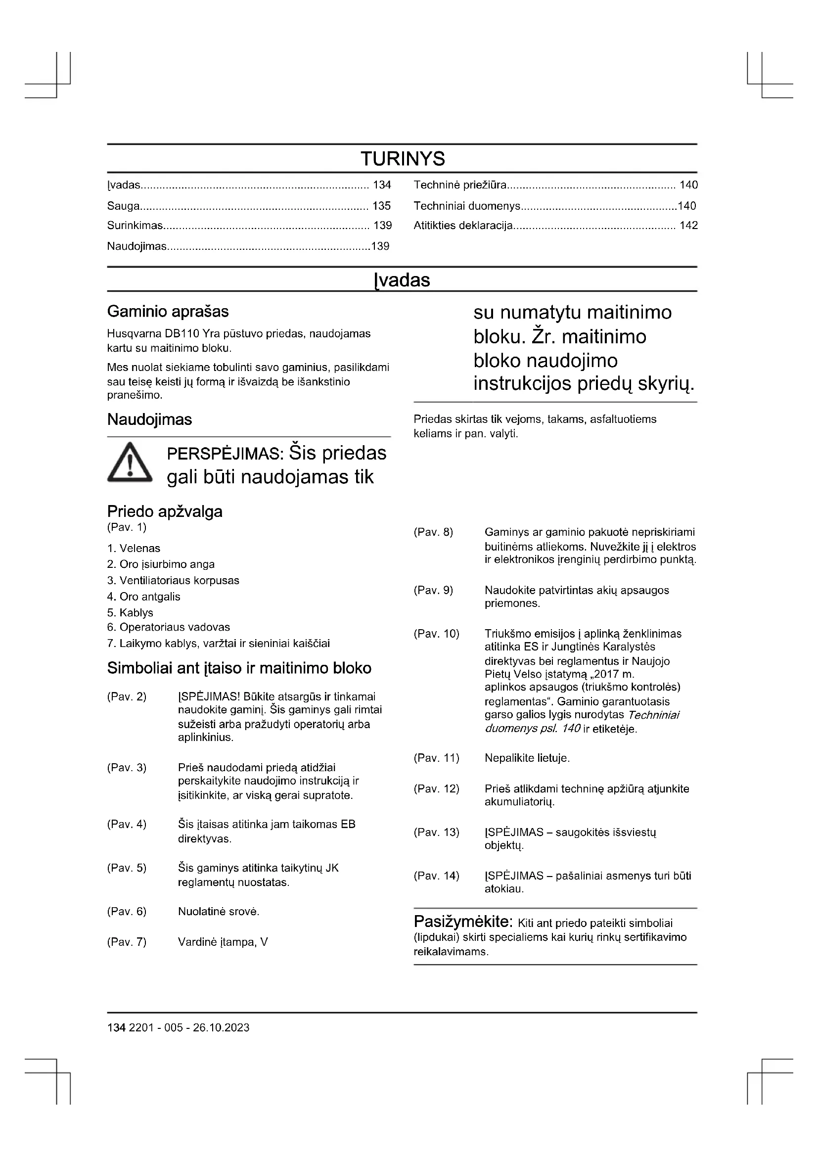 Simboliai ant įtaiso ir maitinimo bloko (Pav. 2) ĮSPĖJIMAS! Būkite atsargūs ir tinkamai naudokite gaminį. Šis gaminys gali rimtai sužeisti arba pražudyti operatorių arba aplinkinius. (Pav. 3) Prieš naudodami priedą atidžiai perskaitykite naudojimo instrukciją ir įsitikinkite, ar viską gerai supratote. (Pav. 4) Šis įtaisas atitinka jam taikomas EB direktyvas. (Pav. 5) Šis gaminys atitinka taikytinų JK reglamentų nuostatas. (Pav. 6) Nuolatinė srovė. (Pav. 7) Vardinė įtampa, V (Pav. 8) Gaminys ar gaminio pakuotė nepriskiriami buitinėms atliekoms. Nuvežkite jį į elektros ir elektronikos įrenginių perdirbimo punktą. (Pav. 9) Naudokite patvirtintas akių apsaugos priemones. (Pav. 10) Triukšmo emisijos į aplinką ženklinimas atitinka ES ir Jungtinės Karalystės direktyvas bei reglamentus ir Naujojo Pietų Velso įstatymą „2017m. aplinkos apsaugos (triukšmo kontrolės) reglamentas“. Gaminio garantuotasis garso galios lygis nurodytas Techniniai duomenys psl. 140 ir etiketėje. (Pav. 11) Nepalikite lietuje. (Pav. 12) Prieš atlikdami techninę apžiūrą atjunkite akumuliatorių. (Pav. 13) ĮSPĖJIMAS – saugokitės išsviestų objektų. (Pav. 14) ĮSPĖJIMAS – pašaliniai asmenys turi būti atokiau. Pasižymėkite: Kiti ant priedo pateikti simboliai (lipdukai) skirti specialiems kai kurių rinkų sertifikavimo reikalavimams. 134 2201 - 005 - 26.10.2023Sauga Saugos ženklų reikšmės Įspėjimai, perspėjimai ir pastabos yra skirtos atkreipti dėmesį į ypač svarbias naudotojo instrukcijos dalis. PERSPĖJIMAS: Naudojamas, kai naudotojui ar šalia esantiems asmenims kyla mirtino arba sunkaus sužeidimo pavojus arba, jei nesilaikoma naudotojo instrukcijoje pateiktų nurodymų. PASTABA: Naudojamas, kai kyla pavojus sugadinti gaminį ir (arba) priedą, kitas medžiagas arba padaryti žalą aplinkai, jei nesilaikoma naudotojo instrukcijoje pateiktų nurodymų. Pasižymėkite: Naudojama pateikti daugiau, nei būtina esamoje situacijoje, informacijos. Bendrieji saugos nurodymai PERSPĖJIMAS: Prieš naudodami priedą, perskaitykite toliau esančius saugos nurodymus.