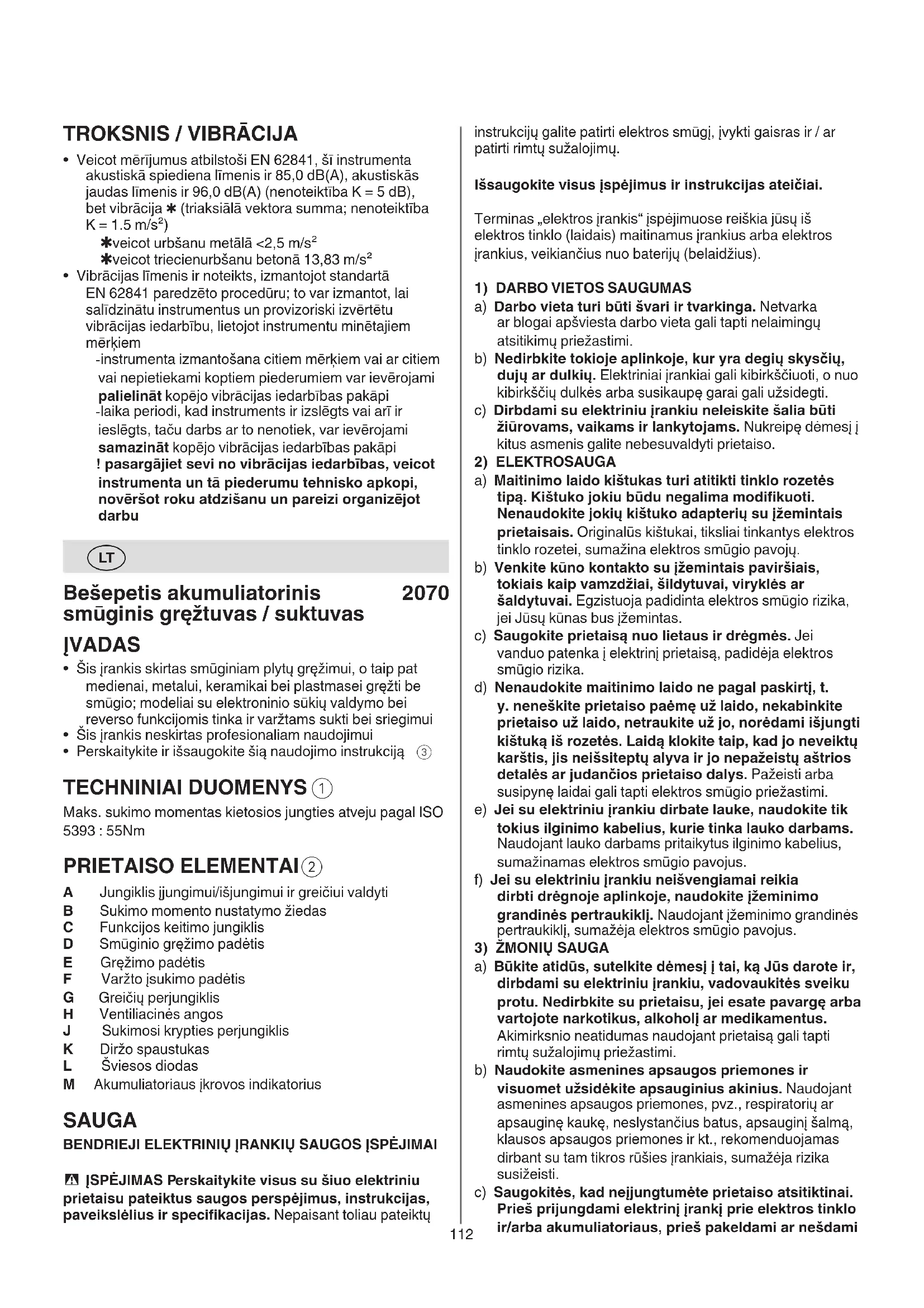 A Jungiklis įjungimui/išjungimui ir greičiui valdyti B Sukimo momento nustatymo žiedas C Funkcijos keitimo jungiklis D Smūginio gręžimo padėtis E Gręžimo padėtis F Varžto įsukimo padėtis G Greičių perjungiklis H Ventiliacinės angos J Sukimosi krypties perjungiklis K Diržo spaustukas L Šviesos diodas M Akumuliatoriaus įkrovos indikatorius SAUGA