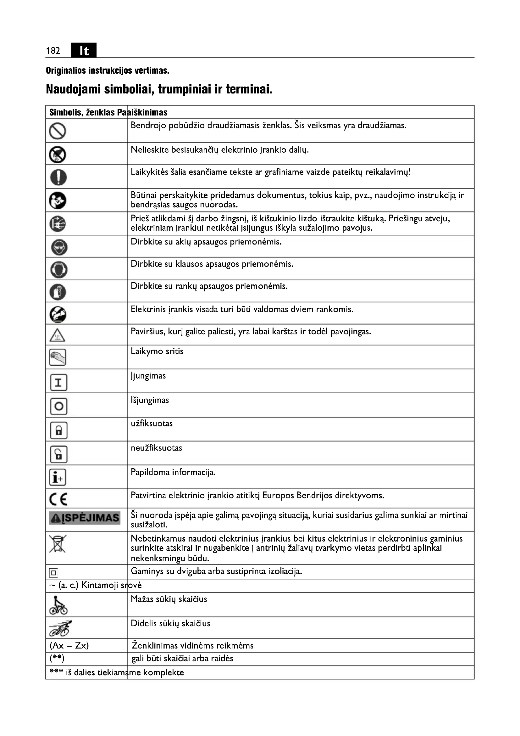 Originalios instrukcijos vertimas. Naudojami simboliai, trumpiniai ir terminai. Simbolis, ženklas Paaiškinimas Bendrojo pobūdžio draudžiamasis ženklas. Šis veiksmas yra draudžiamas. Nelieskite besisukančių elektrinio įrankio dalių. Laikykitės šalia esančiame tekste ar grafiniame vaizde pateiktų reikalavimų! Būtinai perskaitykite pridedamus dokumentus, tokius kaip, pvz., naudojimo instrukciją ir bendrąsias saugos nuorodas. Prieš atlikdami šį darbo žingsnį, iš kištukinio lizdo ištraukite kištuką. Priešingu atveju, elektriniam įrankiui netikėtai įsijungus iškyla sužalojimo pavojus. Dirbkite su akių apsaugos priemonėmis. Dirbkite su klausos apsaugos priemonėmis. Dirbkite su rankų apsaugos priemonėmis. Elektrinis įrankis visada turi būti valdomas dviem rankomis. Paviršius, kurį galite paliesti, yra labai karštas ir todėl pavojingas. Laikymo sritis Įjungimas Išjungimas užfiksuotas neužfiksuotas Papildoma informacija. Patvirtina elektrinio įrankio atitiktį Europos Bendrijos direktyvoms. Ši nuoroda įspėja apie galimą pavojingą situaciją, kuriai susidarius galima sunkiai ar mirtinai susižaloti. Nebetinkamus naudoti elektrinius įrankius bei kitus elektrinius ir elektroninius gaminius surinkite atskirai ir nugabenkite į antrinių žaliavų tvarkymo vietas perdirbti aplinkai nekenksmingu būdu. Gaminys su dviguba arba sustiprinta izoliacija. ~ (a. c.) Kintamoji srovė Mažas sūkių skaičius Didelis sūkių skaičius (Ax – Zx) Ženklinimas vidinėms reikmėms (**) gali būti skaičiai arba raidės *** iš dalies tiekiamame komplekte183