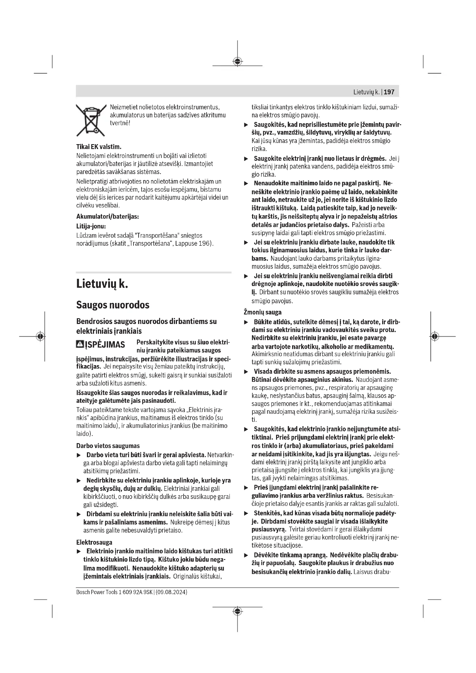 Išmatuota 20−25°C temperatūroje su akumuliatoriumiGBA 12V 6.0Ah. B) ribota galia, esant sūkių skaičiui < 50% C) priklausomai nuo naudojamo akumuliatoriaus D) ribota galia, esant temperatūrai < 0°C Vertės gali skirtis priklausomai nuo gaminio, jos taip pat priklauso nuo naudojimo ir aplinkos sąlygų. Daugiau informacijos rasite www.bosch-professional.com/wac. Informacija apie triukšmą ir vibraciją Triukšmo emisijos vertės nustatytos pagalEN62841-2-2. Pagal A skalę išmatuotas elektrinio įrankio garso slėgio lygis tipiniu atveju yra70dB(A). Triukšmo lygis darbo metu nuro- dytas vertes gali viršyti. Dirbkite su klausos apsaugos prie- monėmis! Vibracijos bendroji vertė a