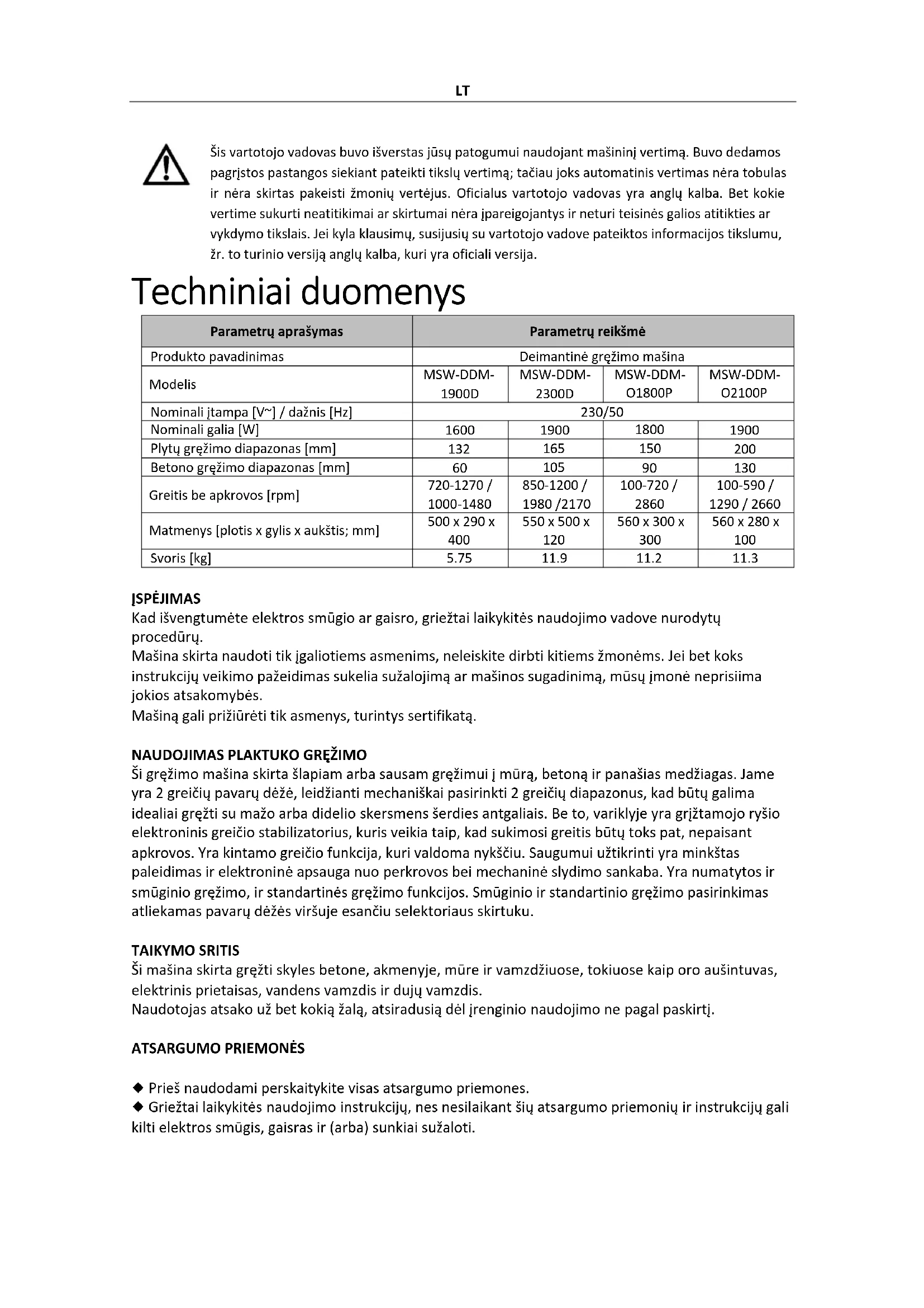 ĮSPĖJIMAS Kad išvengtumėte elektros smūgio ar gaisro, griežtai laikykitės naudojimo vadove nurodytų procedūrų. Mašina skirta naudoti tik įgaliotiems asmenims, neleiskite dirbti kitiems žmonėms. Jei bet koks instrukcijų veikimo pažeidimas sukelia sužalojimą ar mašinos sugadinimą, mūsų įmonė neprisiima jokios atsakomybės. Mašiną gali prižiūrėti tik asmenys, turintys sertifikatą.