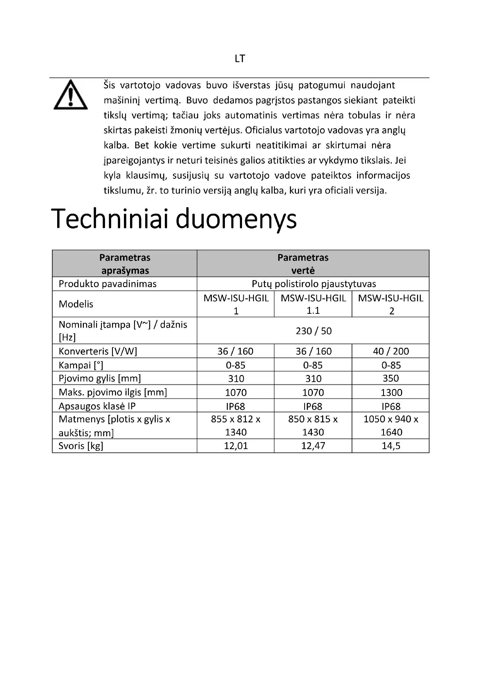 Šis vartotojo vadovas buvo išverstas jūsų patogumui naudojant mašininį vertimą. Buvo dedamos pagrįstos pastangos siekiant pateikti tikslų vertimą; tačiau joks automatinis vertimas nėra tobulas ir nėra skirtas pakeisti žmonių vertėjus. Oficialus vartotojo vadovas yra anglų kalba. Bet kokie vertime sukurti neatitikimai ar skirtumai nėra įpareigojantys ir neturi teisinės galios atitikties ar vykdymo tikslais. Jei kyla klausimų, susijusių su vartotojo vadove pateiktos informacijos tikslumu, žr. to turinio versiją anglų kalba, kuri yra oficiali versija. Techniniai duomenys Parametras aprašymas Parametras vertė Produkto pavadinimas Putų polistirolo pjaustytuvas Modelis MSW-ISU-HGIL