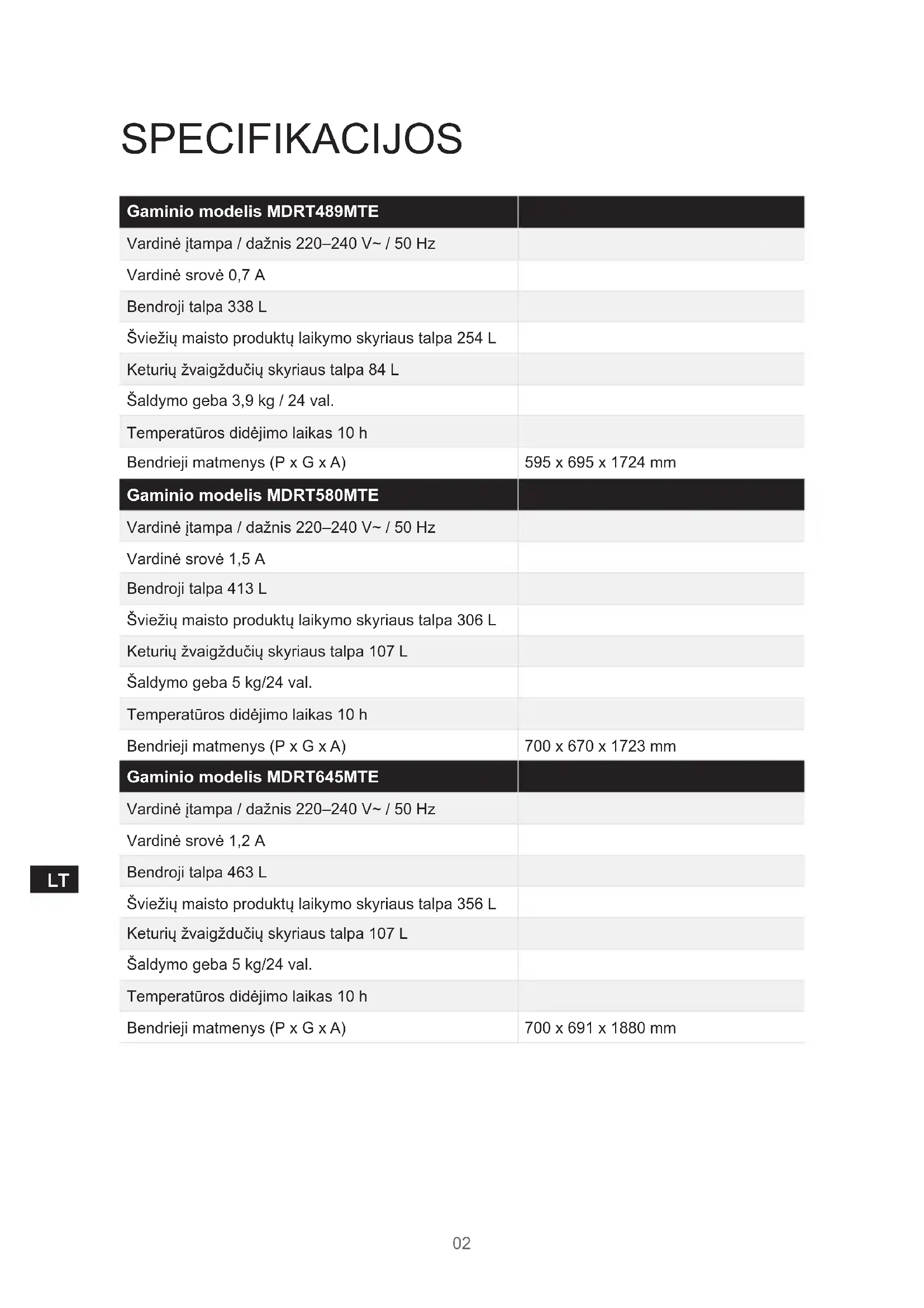 SPECIFIKACIJOS Gaminio modelis MDRT580MTE Vardinė įtampa / dažnis 220–240 V~ / 50 Hz Vardinė srovė 1,5 A Bendroji talpa 413 L Šviežių maisto produktų laikymo skyriaus talpa 306 L Keturių žvaigždučių skyriaus talpa 107 L Šaldymo geba 5 kg/24 val. Temperatūros didėjimo laikas 10 h Bendrieji matmenys (P x G x A) 700 x 670 x 1723 mm Gaminio modelis MDRT645MTE Vardinė įtampa / dažnis 220–240 V~ / 50 Hz Vardinė srovė 1,2 A Bendroji talpa 463 L Šviežių maisto produktų laikymo skyriaus talpa 356 L Keturių žvaigždučių skyriaus talpa 107 L Šaldymo geba 5 kg/24 val. Temperatūros didėjimo laikas 10 h Bendrieji matmenys (P x G x A) 700 x 691 x 1880 mm Gaminio modelis MDRT489MTE Vardinė įtampa / dažnis 220–240 V~ / 50 Hz Vardinė srovė 0,7 A Bendroji talpa 338 L Šviežių maisto produktų laikymo skyriaus talpa 254 L Keturių žvaigždučių skyriaus talpa 84 L Šaldymo geba 3,9 kg / 24 val. Temperatūros didėjimo laikas 10 h Bendrieji matmenys (P x G x A) 595 x 695 x 1724 mm03