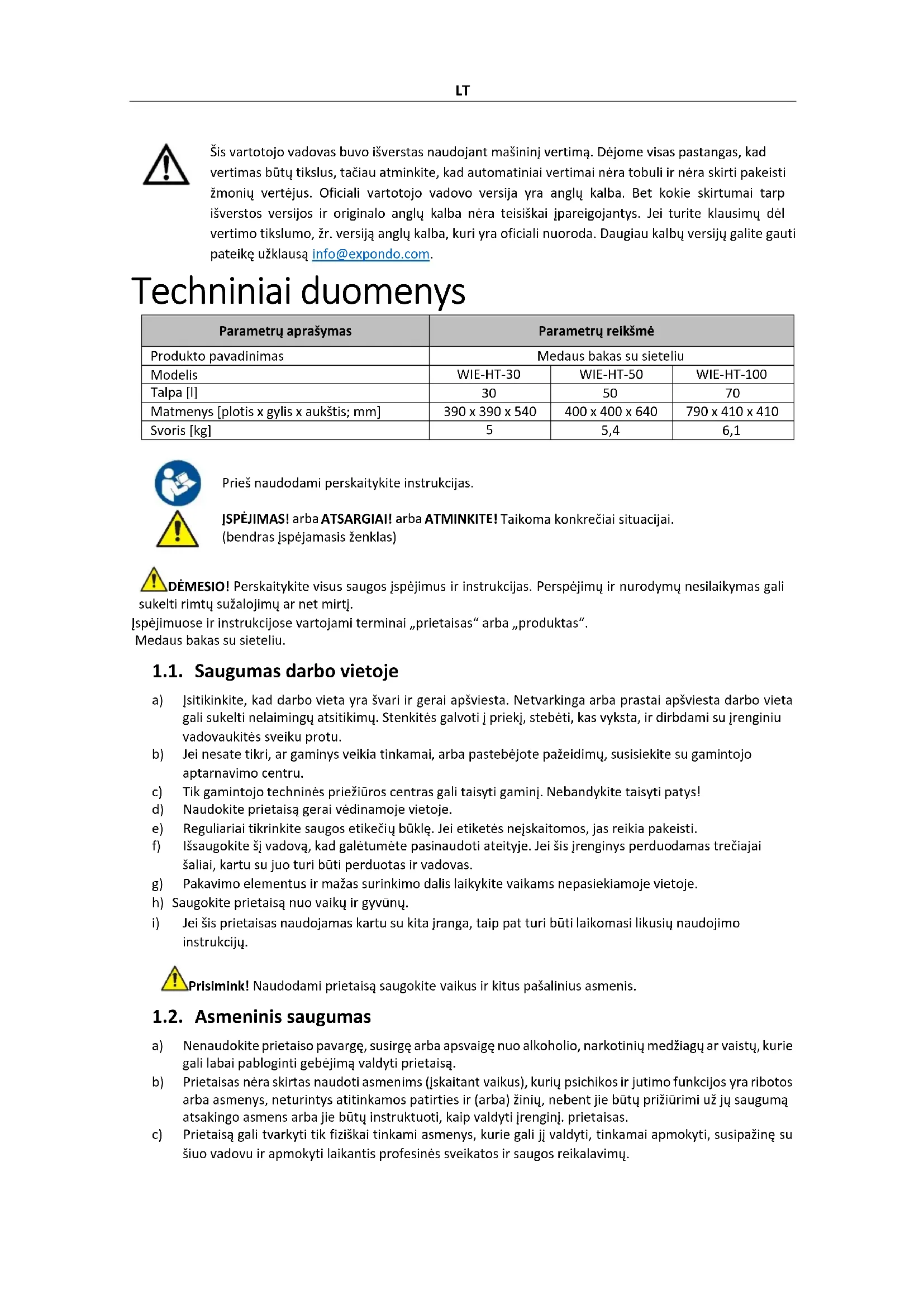 gorivom, uljima ili drugim kemijskim tvarima jer to može oštetiti uređaj. ODLAGANJE KORIŠTENIH UREĐAJA: Nemojte odlagati ovaj uređaj u sustave komunalnog otpada. Predajte ga mjestu za prikupljanje i recikliranje električnih i električnih uređaja. Provjerite simbol na proizvodu, priručniku s uputama i pakiranju. Plastika koja se koristi za izradu uređaja može se reciklirati u skladu s oznakama. Odabirom recikliranja dajete značajan doprinos zaštiti našeg okoliša. Obratite se lokalnim vlastima za informacije o vašem lokalnom pogonu za recikliranje.LT Šis vartotojo vadovas buvo išverstas naudojant mašininį vertimą. Dėjome visas pastangas, kad vertimas būtų tikslus, tačiau atminkite, kad automatiniai vertimai nėra tobuli ir nėra skirti pakeisti žmonių vertėjus. Oficiali vartotojo vadovo versija yra anglų kalba. Bet kokie skirtumai tarp išverstos versijos ir originalo anglų kalba nėra teisiškai įpareigojantys. Jei turite klausimų dėl vertimo tikslumo, žr. versiją anglų kalba, kuri yra oficiali nuoroda. Daugiau kalbų versijų galite gauti pateikę užklausą info@expondo.com. Techniniai duomenys Parametrų aprašymas Parametrų reikšmė Produkto pavadinimas Medaus bakas su sieteliu Modelis WIE-HT-30 WIE-HT-50 WIE-HT-100 Talpa [l]