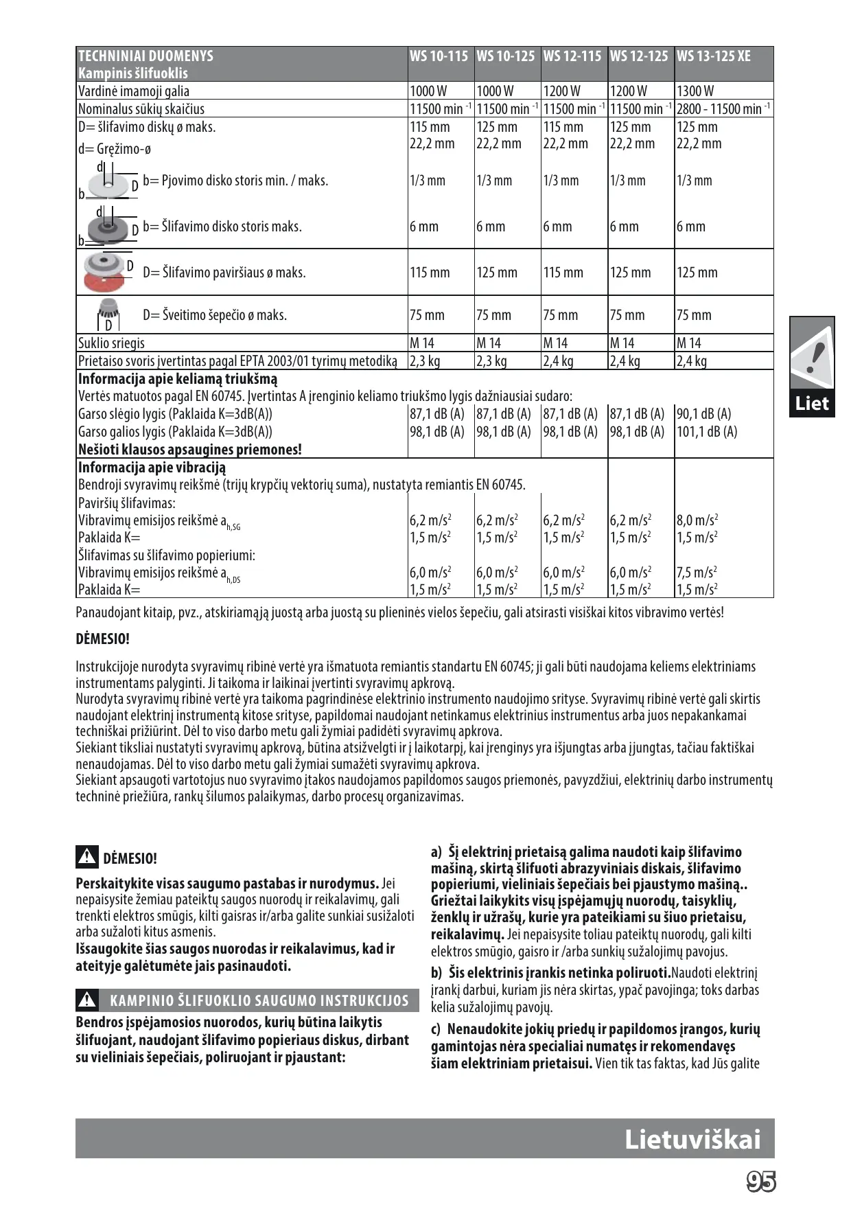 Paklaida K= 1,5 m/s 1,5 m/s 1,5 m/s 1,5 m/s 1,5 m/s2 Šlifavimas su šlifavimo popieriumi: 6,0 m/s2 6,0 m/s2 6,0 m/s2 6,0 m/s2 7,5 m/s2 Vibravimų emisijos reikšmė ah,DS Paklaida K= 1,5 m/s2 1,5 m/s2 1,5 m/s2 1,5 m/s2 1,5 m/s2 Panaudojant kitaip, pvz., atskiriamąją juostą arba juostą su plieninės vielos šepečiu, gali atsirasti visiškai kitos vibravimo vertės! Liet DĖMESIO! Instrukcijoje nurodyta svyravimų ribinė vertė yra išmatuota remiantis standartu EN 60745; ji gali būti naudojama keliems elektriniams instrumentams palyginti. Ji taikoma ir laikinai įvertinti svyravimų apkrovą. Nurodyta svyravimų ribinė vertė yra taikoma pagrindinėse elektrinio instrumento naudojimo srityse. Svyravimų ribinė vertė gali skirtis naudojant elektrinį instrumentą kitose srityse, papildomai naudojant netinkamus elektrinius instrumentus arba juos nepakankamai techniškai prižiūrint. Dėl to viso darbo metu gali žymiai padidėti svyravimų apkrova. Siekiant tiksliai nustatyti svyravimų apkrovą, būtina atsižvelgti ir į laikotarpį, kai įrenginys yra išjungtas arba įjungtas, tačiau faktiškai nenaudojamas. Dėl to viso darbo metu gali žymiai sumažėti svyravimų apkrova. Siekiant apsaugoti vartotojus nuo svyravimo įtakos naudojamos papildomos saugos priemonės, pavyzdžiui, elektrinių darbo instrumentų techninė priežiūra, rankų šilumos palaikymas, darbo procesų organizavimas. DĖMESIO! Perskaitykite visas saugumo pastabas ir nurodymus. Jei nepaisysite žemiau pateiktų saugos nuorodų ir reikalavimų, gali trenkti elektros smūgis, kilti gaisras ir/arba galite sunkiai susižaloti arba sužaloti kitus asmenis. Išsaugokite šias saugos nuorodas ir reikalavimus, kad ir ateityje galėtumėte jais pasinaudoti.