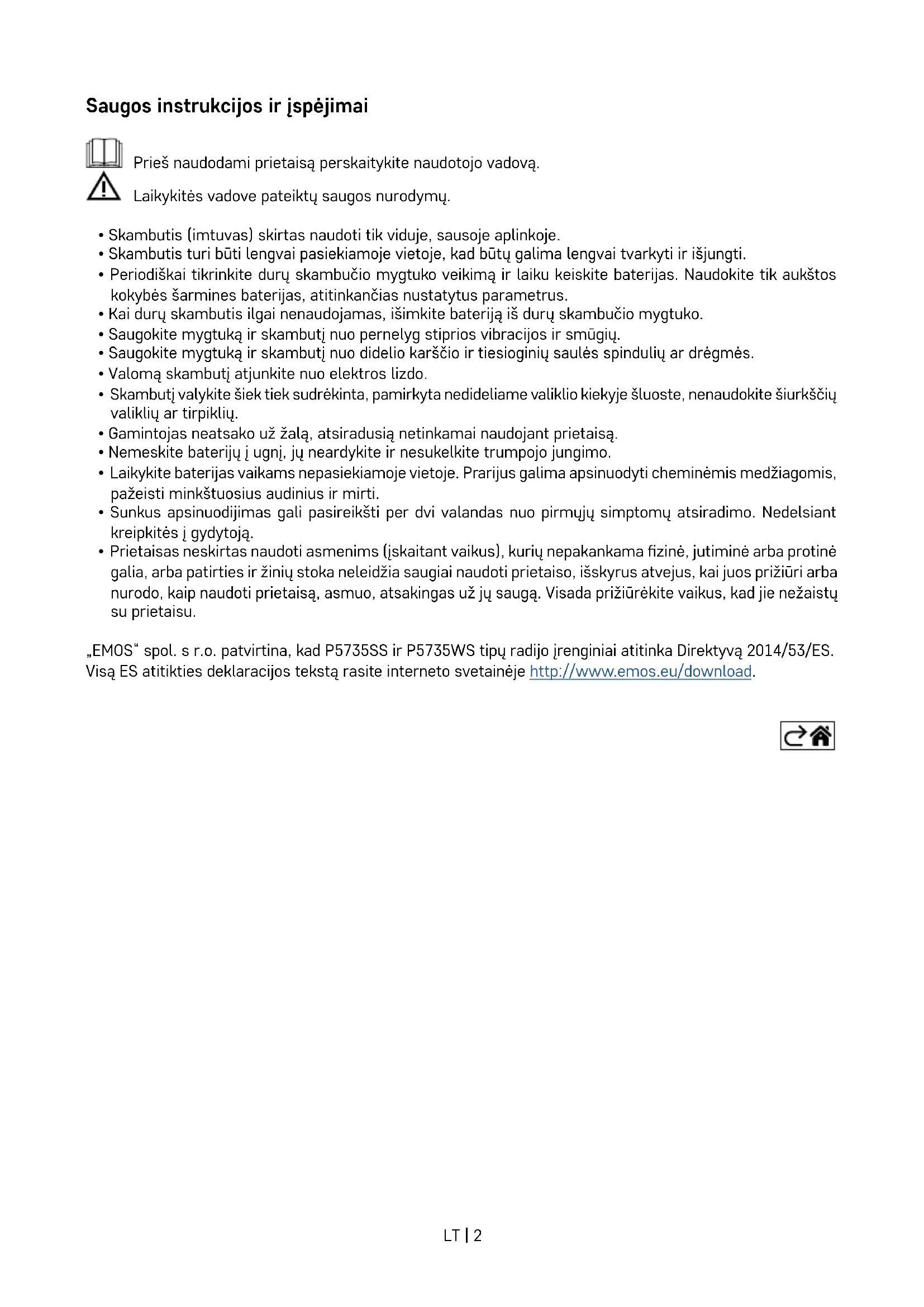- Prietaisas neskirtas naudoti asmenims (įskaitant vaikus), kurių nepakankama zinė, jutiminė arba protinė galia, arba patirties ir žinių stoka neleidžia saugiai naudoti prietaiso, išskyrus atvejus, kai juos prižiūri arba nurodo, kaip naudoti prietaisą, asmuo, atsakingas už jų saugą. Visada prižiūrėkite vaikus, kad jie nežaistų su prietaisu. „EMOS“ spol. s r.o. patvirtina, kad P5735SS ir P5735WS tipų radijo įrenginiai atitinka Direktyvą 2014/53/ES. Visą ES atitikties deklaracijos tekstą rasite interneto svetainėje http://www.emos.eu/download.LT | 3 80 mm 38 mm 19 mm 65 mm 80 mm 92 mm Techninės specikacijos Perdavimo atstumas: iki 150 m atviroje erdvėje (gali sumažėti iki penktadalio apstatytoje zonoje) Mygtukas: atsparus vandeniui; apsauga IP44 Skambučio susiejimas su mygtukais: „savaran- kiško mokymosi“ funkcija Susiejimo pajėgumai: daugiausia 8 mygtukai 1 skambučiui, daugiausia 2 mygtukai 1 skam- bučiui „EMOS“ programėlėje „GoSmart“ Skambėjimo melodijų skaičius: 52 Perdavimo dažnis: 433,92 MHz, didžiausia ekvi- valentinė spinduliuotės galia (e. r. p.) 10 mW Skambučio maitinimo šaltinis: 230 V KS / 50 Hz Mygtuko maitinimas: 1× 3 V baterija (CR2032 tipo, pridedama) Pridedama: dvipusė lipnioji juostaLT | 4