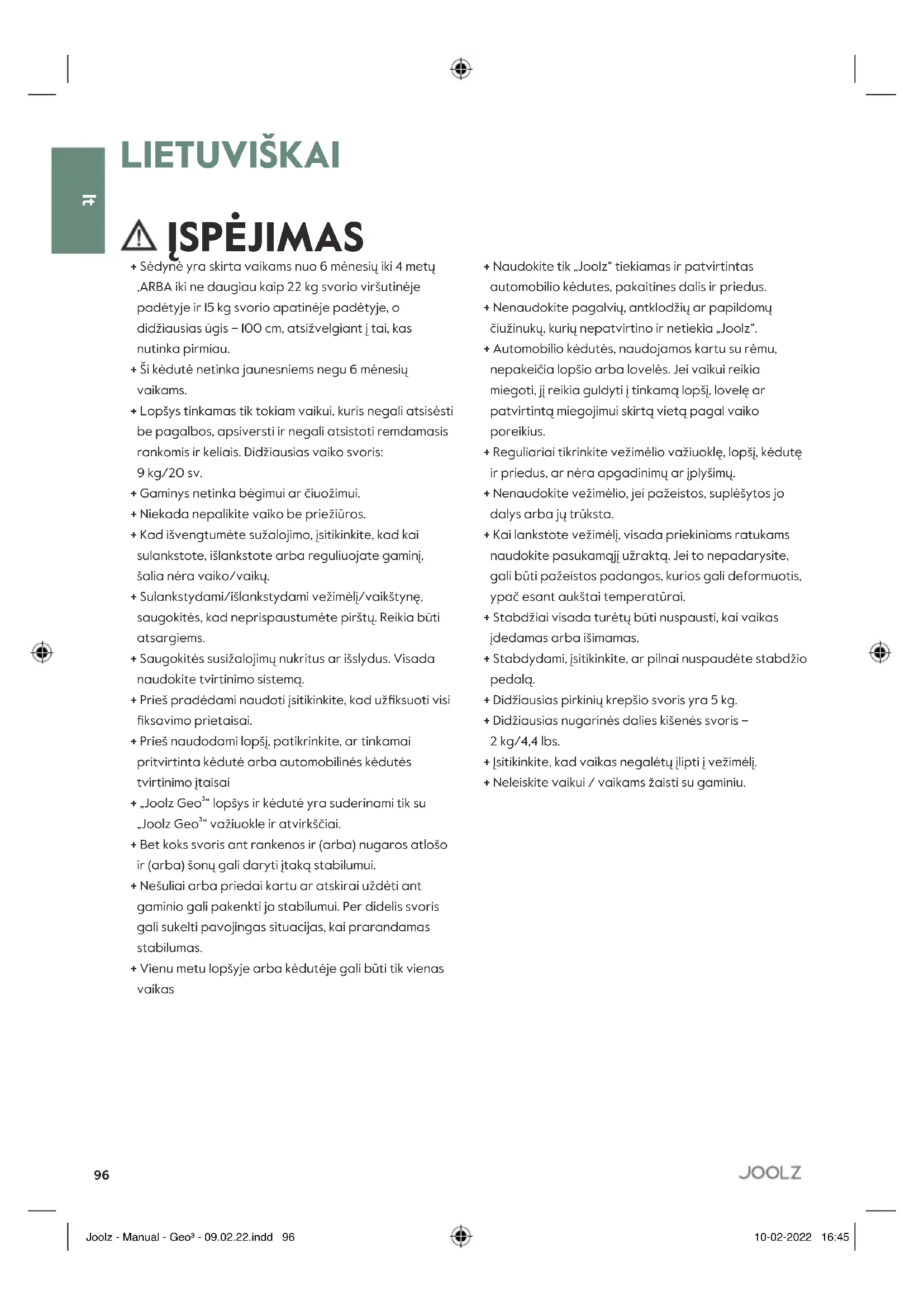 LIETUVIŠKAI ĮSPĖJIMAS + Sėdynė yra skirta vaikams nuo 6 mėnesių iki 4 metų ,ARBA iki ne daugiau kaip 22 kg svorio viršutinėje padėtyje ir 15 kg svorio apatinėje padėtyje, o didžiausias ūgis – 100 cm, atsižvelgiant į tai, kas nutinka pirmiau. + Ši kėdutė netinka jaunesniems negu 6 mėnesių vaikams. + Lopšys tinkamas tik tokiam vaikui, kuris negali atsisėsti be pagalbos, apsiversti ir negali atsistoti remdamasis rankomis ir keliais. Didžiausias vaiko svoris: 9 kg/20 sv. + Gaminys netinka bėgimui ar čiuožimui. + Niekada nepalikite vaiko be priežiūros. + Kad išvengtumėte sužalojimo, įsitikinkite, kad kai sulankstote, išlankstote arba reguliuojate gaminį, šalia nėra vaiko/vaikų. + Sulankstydami/išlankstydami vežimėlį/vaikštynę, saugokitės, kad neprispaustumėte pirštų. Reikia būti atsargiems. + Saugokitės susižalojimų nukritus ar išslydus. Visada naudokite tvirtinimo sistemą. + Prieš pradėdami naudoti įsitikinkite, kad užksuoti visi ksavimo prietaisai. + Prieš naudodami lopšį, patikrinkite, ar tinkamai pritvirtinta kėdutė arba automobilinės kėdutės tvirtinimo įtaisai + „Joolz Geo³“ lopšys ir kėdutė yra suderinami tik su „Joolz Geo³“ važiuokle ir atvirkščiai. + Bet koks svoris ant rankenos ir (arba) nugaros atlošo ir (arba) šonų gali daryti įtaką stabilumui. + Nešuliai arba priedai kartu ar atskirai uždėti ant gaminio gali pakenkti jo stabilumui. Per didelis svoris gali sukelti pavojingas situacijas, kai prarandamas stabilumas. + Vienu metu lopšyje arba kėdutėje gali būti tik vienas vaikas + Naudokite tik „Joolz“ tiekiamas ir patvirtintas automobilio kėdutes, pakaitines dalis ir priedus. + Nenaudokite pagalvių, antklodžių ar papildomų čiužinukų, kurių nepatvirtino ir netiekia „Joolz“. + Automobilio kėdutės, naudojamos kartu su rėmu, nepakeičia lopšio arba lovelės. Jei vaikui reikia miegoti, jį reikia guldyti į tinkamą lopšį, lovelę ar patvirtintą miegojimui skirtą vietą pagal vaiko poreikius. + Reguliariai tikrinkite vežimėlio važiuoklę, lopšį, kėdutę ir priedus, ar nėra apgadinimų ar įplyšimų. + Nenaudokite vežimėlio, jei pažeistos, suplėšytos jo dalys arba jų trūksta. + Kai lankstote vežimėlį, visada priekiniams ratukams naudokite pasukamąjį užraktą. Jei to nepadarysite, gali būti pažeistos padangos, kurios gali deformuotis, ypač esant aukštai temperatūrai. + Stabdžiai visada turėtų būti nuspausti, kai vaikas įdedamas arba išimamas. + Stabdydami, įsitikinkite, ar pilnai nuspaudėte stabdžio pedalą. + Didžiausias pirkinių krepšio svoris yra 5 kg. + Didžiausias nugarinės dalies kišenės svoris – 2 kg/4,4 lbs. + Įsitikinkite, kad vaikas negalėtų įlipti į vežimėlį. + Neleiskite vaikui/ vaikams žaisti su gaminiu. Joolz - Manual - Geo³ - 09.02.22.indd 96Joolz - Manual - Geo³ - 09.02.22.indd 96 10-02-2022 16:4510-02-2022 16:4597 instruction manual Joolz Geo