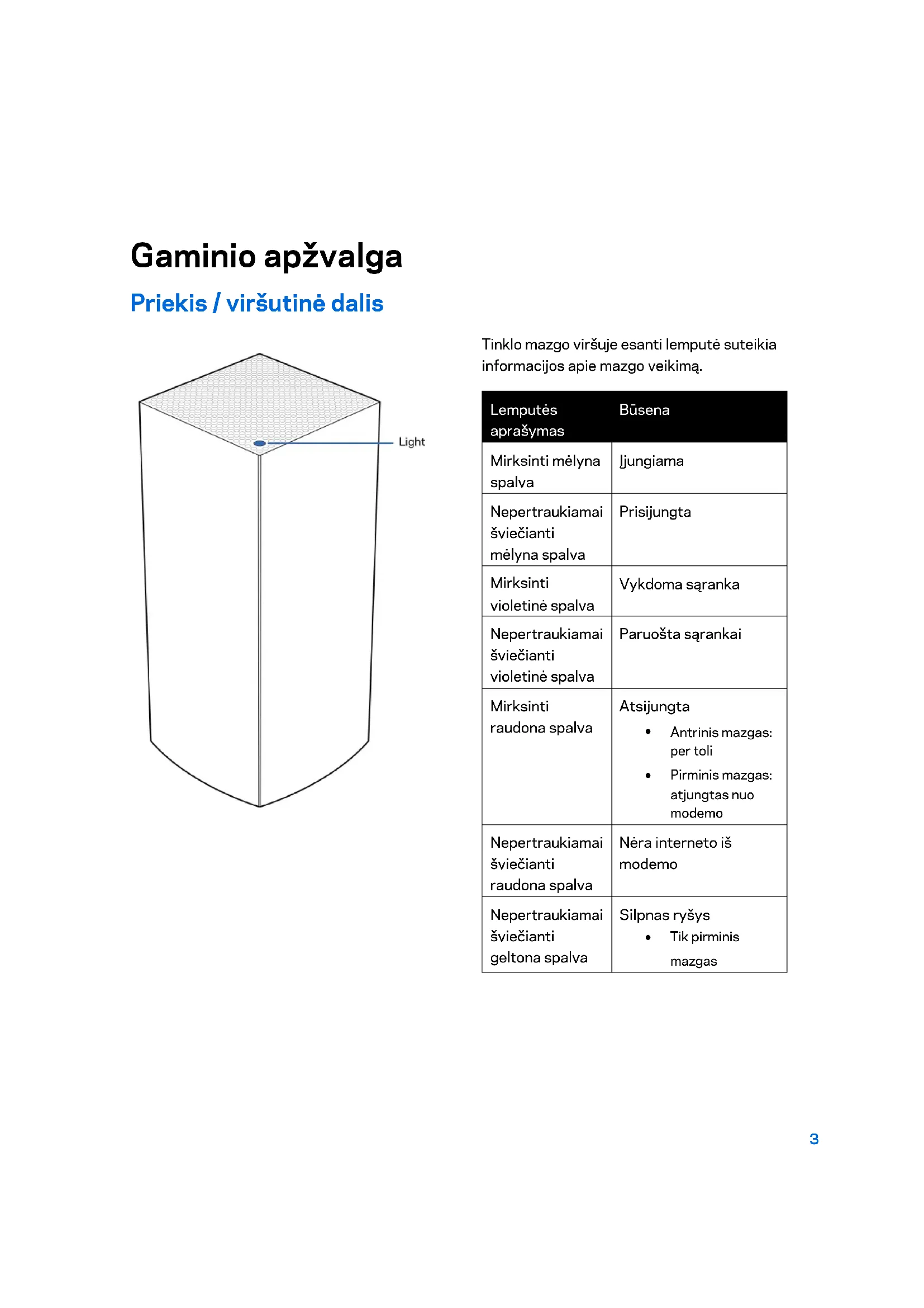 „Linksys“ programos pagalba (paleiskite programą ir pagrindiniame naršymo meniu spustelėkite „Help“ (pagalba) Pastaba. Šiame gaminyje naudojamos trečiųjų šalių įrangos licencijas ir pranešimus galima peržiūrėti http://support.linksys.com/en-us/license. Susisiekite su http://support.linksys.com/en- us/gplcodecenter , jei turite klausimų arba GPL šaltino kodo užklausų.7 Sąranka SVARBU. „Velop“ mazgus galima nustatyti kaip pirminius arba antrinius mazgus. Pagrindinis mazgas turi būti eterneto kabeliu prijungtas prie modemo ar modemo maršruto parinktuvo. Nustačius belaidžiu būdu, antrinius mazgus galima jungti prie kito mazgo belaidžiu būdu arba eterneto kabeliais. Jei šį naują mazgą pridedate kaip pirminį mazgą į esamą „Velop“ viso namų tinklo „Wi-Fi“ sistemą, atkurkite visų mazgų gamyklines nuostatas ir pridėkite juos į sistemą, kai buvo atlikta naujo mazgo sąranka ir jis veikia. Atsisiųskite „Linksys“ programą. Norint nustatyti „Velop“, reikia šios programos. Eikite į įrenginio programų parduotuvę ir į paiešką suveskite „Linksys“. Įdiekite programą, atverkite ją ir vykdykite instrukcijas. Pastaba. Programa veikia „iOS“ 11.4 ir naujesnėje bei „Android“ 6 ir naujesnėje aplinkoje. Sukursite „Linksys Smart Wi-Fi“ paskyrą, kad programą galėtumėte naudoti „Velop“ sistemos nuostatoms peržiūrėti arba keisti bet kurioje vietoje, kurioje yra interneto ryšys. Naudodami „Linksys Smart Wi-Fi“ galite daryti daug dalykų, įskaitant: