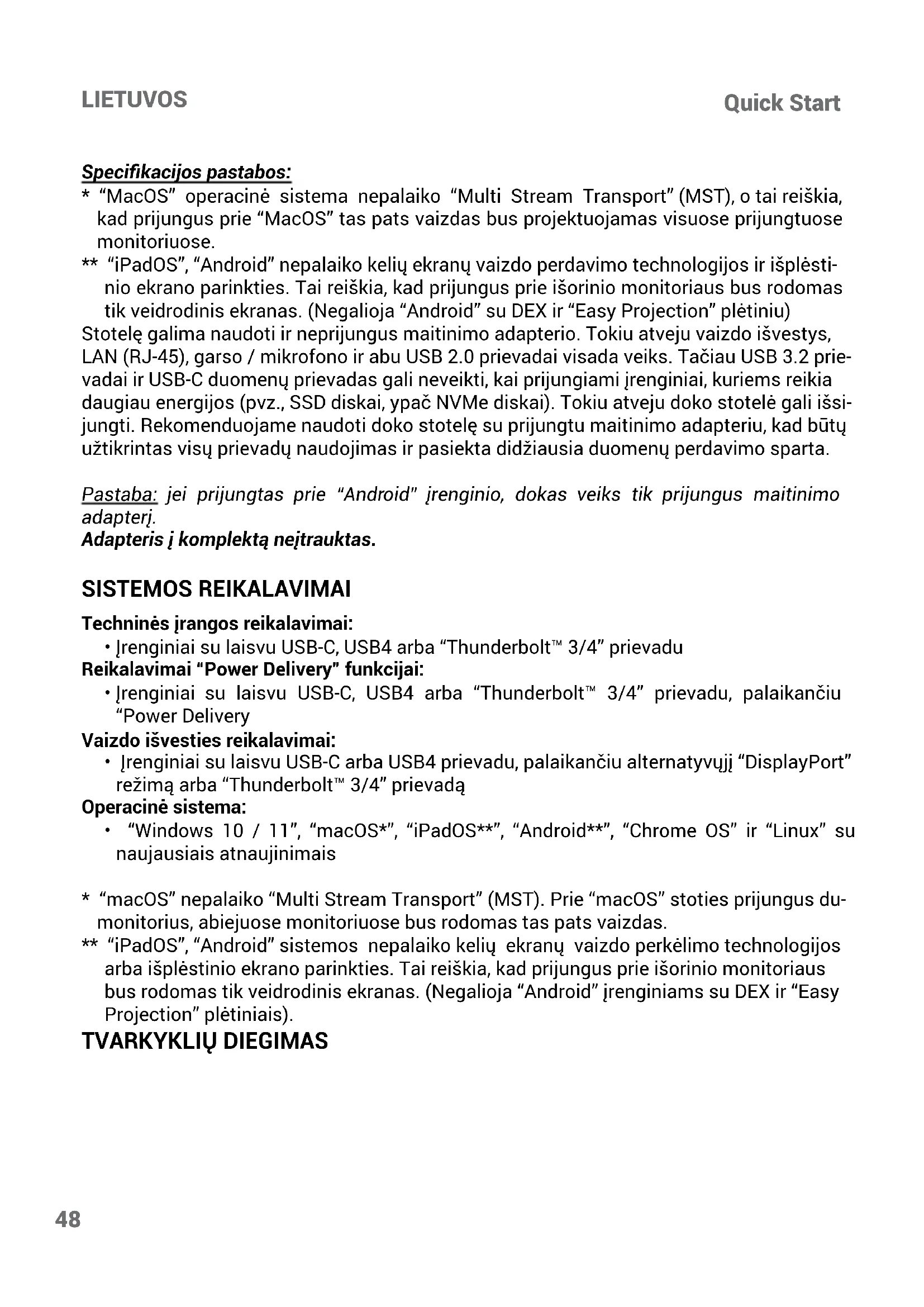 - “macOS” nepalaiko “Multi Stream Transport” (MST). Prie “macOS” stoties prijungus du- monitorius, abiejuose monitoriuose bus rodomas tas pats vaizdas. ** “iPadOS”, “Android” sistemos nepalaiko kelių ekranų vaizdo perkėlimo technologijos arba išplėstinio ekrano parinkties. Tai reiškia, kad prijungus prie išorinio monitoriaus bus rodomas tik veidrodinis ekranas. (Negalioja “Android” įrenginiams su DEX ir “Easy Projection” plėtiniais).