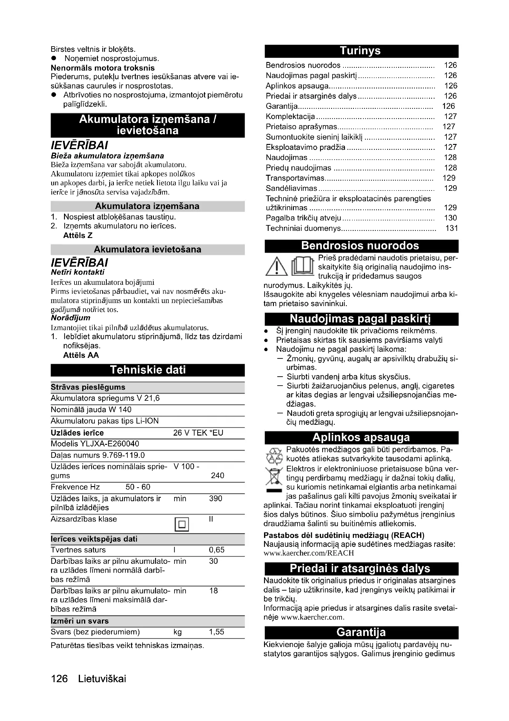 nofiksējas. Attēls AA Tehniskie dati Paturētas tiesības veikt tehniskas izmaiņas. Turinys Bendrosios nuorodos Prieš pradėdami naudotis prietaisu, per- skaitykite šią originalią naudojimo ins- trukciją ir pridedamus saugos nurodymus. Laikykitės jų. Išsaugokite abi knygeles vėlesniam naudojimui arba ki- tam prietaiso savininkui. Naudojimas pagal paskirtį ● Šį įrenginį naudokite tik privačioms reikmėms. ● Prietaisas skirtas tik sausiems paviršiams valyti ● Naudojimu ne pagal paskirtį laikoma: – Žmonių, gyvūnų, augalų ar apsivilktų drabužių si- urbimas. – Siurbti vandenį arba kitus skysčius. – Siurbti žaižaruojančius pelenus, anglį, cigaretes ar kitas degias ar lengvai užsiliepsnojančias me- džiagas. – Naudoti greta sprogiųjų ar lengvai užsiliepsnojan- čių medžiagų. Aplinkos apsauga Pakuotės medžiagos gali būti perdirbamos. Pa- kuotės atliekas sutvarkykite tausodami aplinką. Elektros ir elektroniniuose prietaisuose būna ver- tingų perdirbamų medžiagų ir dažnai tokių dalių, su kuriomis netinkamai elgiantis arba netinkamai jas pašalinus gali kilti pavojus žmonių sveikatai ir aplinkai. Tačiau norint tinkamai eksploatuoti įrenginį šios dalys būtinos. Šiuo simboliu pažymėtus įrenginius draudžiama šalinti su buitinėmis atliekomis. Pastabos dėl sudėtinių medžiagų (REACH) Naujausią informaciją apie sudėtines medžiagas rasite: www.kaercher.com/REACH Priedai ir atsarginės dalys Naudokite tik originalius priedus ir originalas atsargines dalis – taip užtikrinsite, kad įrenginys veiktų patikimai ir be trikčių. Informaciją apie priedus ir atsargines dalis rasite svetai- nėje www.kaercher.com. Garantija Kiekvienoje šalyje galioja mūsų įgaliotų pardavėjų nu- statytos garantijos sąlygos. Galimus įrenginio gedimus Strāvas pieslēgums Akumulatora spriegums V 21,6 Nominālā jauda W 140 Akumulatoru pakas tips Li-ION Uzlādes ierīce 26 V TEK *EU Modelis YLJXA-E260040 Daļas numurs 9.769-119.0 Uzlādes ierīces nominālais sprie- gums V 100 -