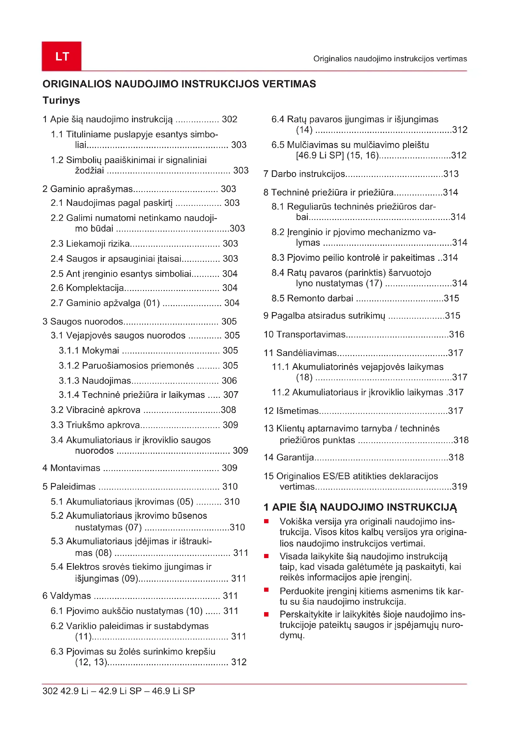- Tik 42.9 Li SP ir 46.9 Li SP. ** Priklausomai nuo gaminio kodo, žr. techninius duomenis. *** 46.9 Li SP galima įsigyti kaip priedą. 3 SAUGOS NUORODOS PAVOJUS! Pavojus gyvybei ir sunkių sužalojimų pavojus! Nežinant saugos nuorodų ir valdymo instrukcijų, galima sunkiai ar net mirtinai susižaloti.