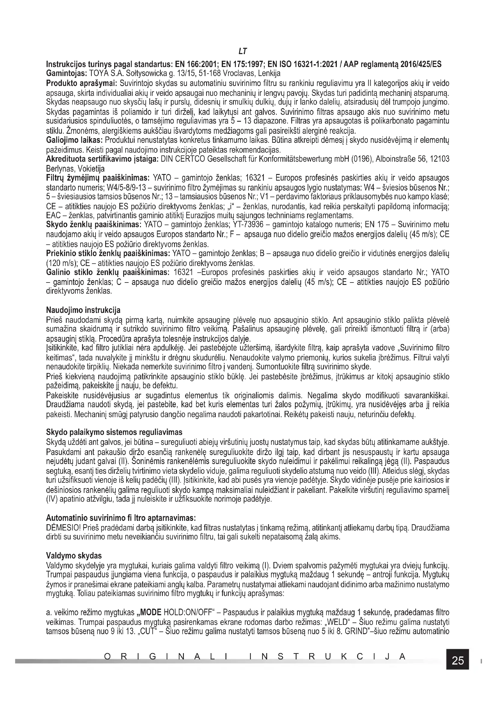Instrukcijos turinys pagal standartus: EN 166:2001; EN 175:1997; EN ISO 16321-1:2021 / AAP reglamentą 2016/425/ES Gamintojas: TOYA S.A. Sołtysowicka g. 13/15, 51-168 Vroclavas, Lenkija Produkto aprašymai: Suvirintojo skydas su automatiniu suvirinimo fi ltru su rankiniu reguliavimu yra II kategorijos akių ir veido apsauga, skirta individualiai akių ir veido apsaugai nuo mechaninių ir lengvų pavojų. Skydas turi padidintą mechaninį atsparumą. Skydas neapsaugo nuo skysčių lašų ir purslų, didesnių ir smulkių dulkių, dujų ir lanko dalelių, atsiradusių dėl trumpojo jungimo. Skydas pagamintas iš poliamido ir turi dirželį, kad laikytųsi ant galvos. Suvirinimo fi ltras apsaugo akis nuo suvirinimo metu susidariusios spinduliuotės, o tamsėjimo reguliavimas yra 5 – 13 diapazone. Filtras yra apsaugotas iš polikarbonato pagamintu stiklu. Žmonėms, alergiškiems aukščiau išvardytoms medžiagoms gali pasireikšti alerginė reakcija. Galiojimo laikas: Produktui nenustatytas konkretus tinkamumo laikas. Būtina atkreipti dėmesį į skydo nusidėvėjimą ir elementų pažeidimus. Keisti pagal naudojimo instrukcijoje pateiktas rekomendacijas. Akredituota sertifi kavimo įstaiga: DIN CERTCO Gesellschaft für Konformitätsbewertung mbH (0196), Alboinstraße 56, 12103 Berlynas, Vokietija Filtrų žymėjimų paaiškinimas: YATO – gamintojo ženklas; 16321 – Europos profesinės paskirties akių ir veido apsaugos standarto numeris; W4/5-8/9-13 – suvirinimo fi ltro žymėjimas su rankiniu apsaugos lygio nustatymas: W4 – šviesios būsenos Nr.; 5 – šviesiausios tamsios būsenos Nr.; 13 – tamsiausios būsenos Nr.; V1 – perdavimo faktoriaus priklausomybės nuo kampo klasė; CE – atitikties naujojo ES požiūrio direktyvoms ženklas; „i“ – ženklas, nurodantis, kad reikia perskaityti papildomą informaciją; EAC – ženklas, patvirtinantis gaminio atitiktį Eurazijos muitų sąjungos techniniams reglamentams. Skydo ženklų paaiškinimas: YATO – gamintojo ženklas; YT-73936 – gamintojo katalogo numeris; EN 175 – Suvirinimo metu naudojamo akių ir veido apsaugos Europos standarto Nr.; F – apsauga nuo didelio greičio mažos energijos dalelių (45 m/s); CE – atitikties naujojo ES požiūrio direktyvoms ženklas. Priekinio stiklo ženklų paaiškinimas: YATO – gamintojo ženklas; B – apsauga nuo didelio greičio ir vidutinės energijos dalelių (120 m/s); CE – atitikties naujojo ES požiūrio direktyvoms ženklas. Galinio stiklo ženklų paaiškinimas: 16321 –Europos profesinės paskirties akių ir veido apsaugos standarto Nr.; YATO – gamintojo ženklas; C – apsauga nuo didelio greičio mažos energijos dalelių (45 m/s); CE – atitikties naujojo ES požiūrio direktyvoms ženklas. Naudojimo instrukcija Prieš naudodami skydą pirmą kartą, nuimkite apsauginę plėvelę nuo apsauginio stiklo. Ant apsauginio stiklo palikta plėvelė sumažina skaidrumą ir sutrikdo suvirinimo fi ltro veikimą. Pašalinus apsauginę plėvelę, gali prireikti išmontuoti fi ltrą ir (arba) apsauginį stiklą. Procedūra aprašyta tolesnėje instrukcijos dalyje. Įsitikinkite, kad fi ltro jutikliai nėra apdulkėję. Jei pastebėjote užteršimą, išardykite fi ltrą, kaip aprašyta vadove „Suvirinimo fi ltro keitimas“, tada nuvalykite jį minkštu ir drėgnu skudurėliu. Nenaudokite valymo priemonių, kurios sukelia įbrėžimus. Filtrui valyti nenaudokite tirpiklių. Niekada nemerkite suvirinimo fi ltro į vandenį. Sumontuokite fi ltrą suvirinimo skyde. Prieš kiekvieną naudojimą patikrinkite apsauginio stiklo būklę. Jei pastebėsite įbrėžimus, įtrūkimus ar kitokį apsauginio stiklo pažeidimą, pakeiskite jį nauju, be defektu. Pakeiskite nusidėvėjusius ar sugadintus elementus tik originaliomis dalimis. Negalima skydo modifi kuoti savarankiškai. Draudžiama naudoti skydą, jei pastebite, kad bet kuris elementas turi žalos požymių, įtrūkimų, yra nusidėvėjęs arba jį reikia pakeisti. Mechaninį smūgį patyrusio dangčio negalima naudoti pakartotinai. Reikėtų pakeisti nauju, neturinčiu defektų. Skydo palaikymo sistemos reguliavimas Skydą uždėti ant galvos, jei būtina – sureguliuoti abiejų viršutinių juostų nustatymus taip, kad skydas būtų atitinkamame aukštyje. Pasukdami ant pakaušio diržo esančią rankenėlę sureguliuokite diržo ilgį taip, kad dirbant jis nesuspaustų ir kartu apsauga nejudėtų judant galvai (II). Šoninėmis rankenėlėmis sureguliuokite skydo nuleidimui ir pakėlimui reikalingą jėgą (II). Paspaudus segtuką, esantį ties dirželių tvirtinimo vieta skydelio viduje, galima reguliuoti skydelio atstumą nuo veido (III). Atleidus slėgį, skydas turi užsifi ksuoti vienoje iš kelių padėčių (III). Įsitikinkite, kad abi pusės yra vienoje padėtyje. Skydo vidinėje pusėje prie kairiosios ir dešiniosios rankenėlių galima reguliuoti skydo kampą maksimaliai nuleidžiant ir pakeliant. Pakelkite viršutinį reguliavimo sparnelį (IV) apatinio atžvilgiu, tada jį nuleiskite ir užfi ksuokite norimoje padėtyje. Automatinio suvirinimo fi ltro aptarnavimas: DĖMESIO! Prieš pradėdami darbą įsitikinkite, kad fi ltras nustatytas į tinkamą režimą, atitinkantį atliekamų darbų tipą. Draudžiama dirbti su suvirinimo metu neveikiančiu suvirinimo fi ltru, tai gali sukelti nepataisomą žalą akims. Valdymo skydas Valdymo skydelyje yra mygtukai, kuriais galima valdyti fi ltro veikimą (I). Dviem spalvomis pažymėti mygtukai yra dviejų funkcijų. Trumpai paspaudus įjungiama viena funkcija, o paspaudus ir palaikius mygtuką maždaug 1 sekundę – antroji funkcija. Mygtukų žymos ir pranešimai ekrane pateikiami anglų kalba. Parametrų nustatymai atliekami naudojant didinimo arba mažinimo nustatymo mygtuką. Toliau pateikiamas suvirinimo fi ltro mygtukų ir funkcijų aprašymas: a. veikimo režimo mygtukas „MODE HOLD:ON/OFF“ – Paspaudus ir palaikius mygtuką maždaug 1 sekun