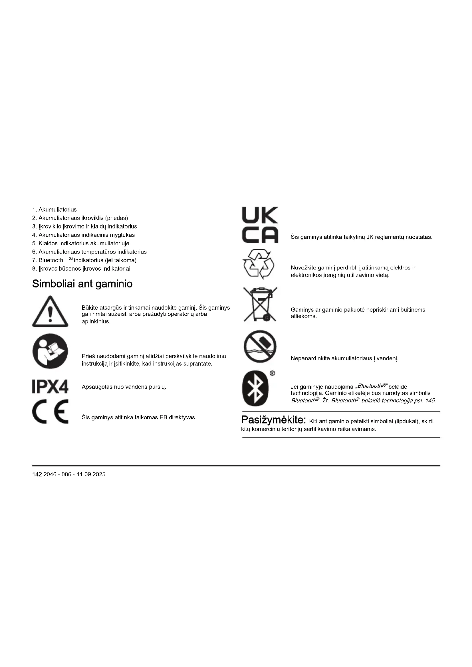 Simboliai ant gaminio Būkite atsargūs ir tinkamai naudokite gaminį. Šis gaminys gali rimtai sužeisti arba pražudyti operatorių arba aplinkinius. Prieš naudodami gaminį atidžiai perskaitykite naudojimo instrukciją ir įsitikinkite, kad instrukcijas suprantate. Apsaugotas nuo vandens purslų. Šis gaminys atitinka taikomas EB direktyvas. Šis gaminys atitinka taikytinų JK reglamentų nuostatas. Nuvežkite gaminį perdirbti į atitinkamą elektros ir elektronikos įrenginių utilizavimo vietą. Gaminys ar gaminio pakuotė nepriskiriami buitinėms atliekoms. Nepanardinkite akumuliatoriaus į vandenį. Jei gaminyje naudojama „Bluetooth