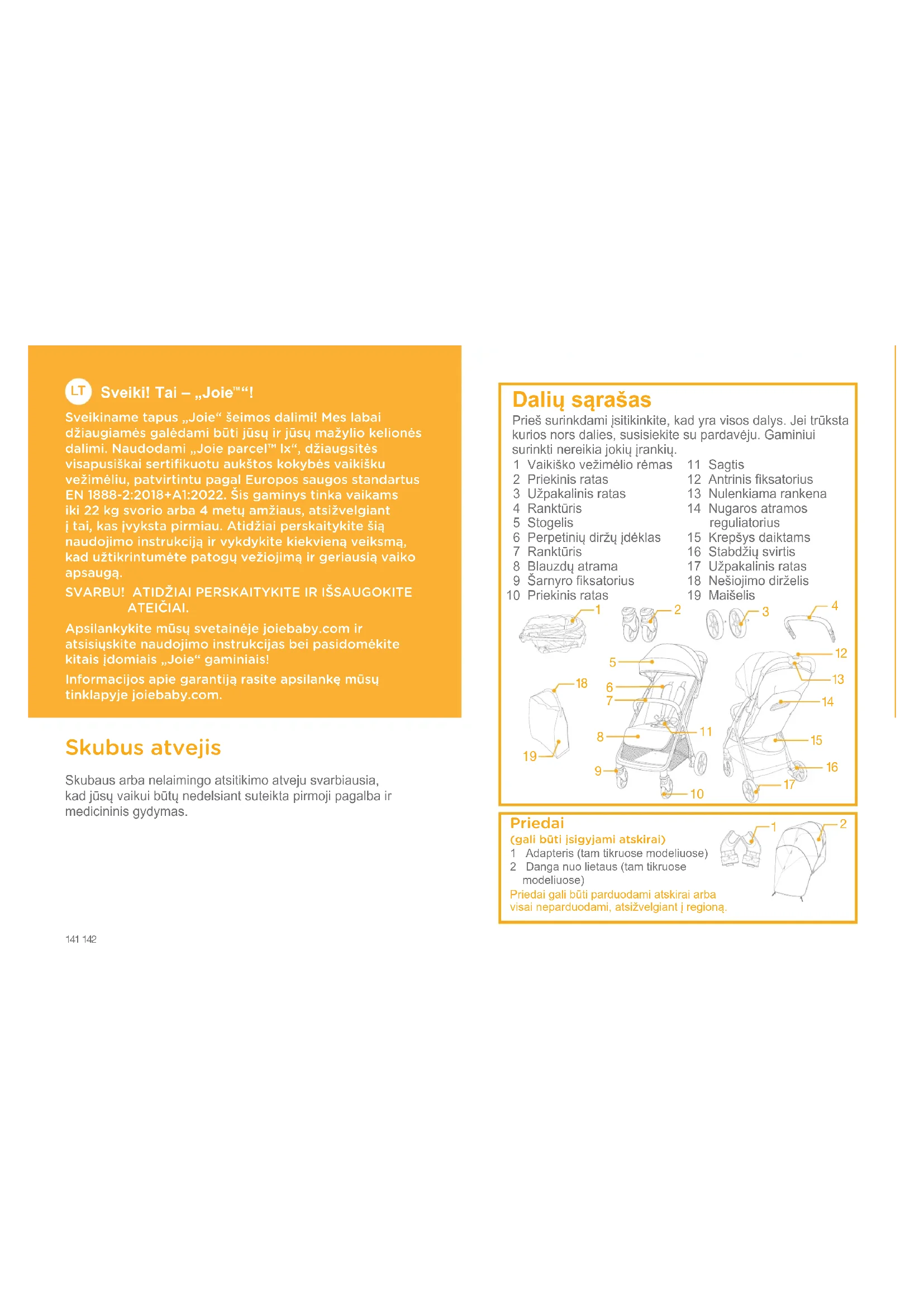 Sveikiname tapus „Joie“ šeimos dalimi! Mes labai džiaugiamės galėdami būti jūsų ir jūsų mažylio kelionės dalimi. Naudodami „Joie parcel™ lx“, džiaugsitės visapusiškai sertifikuotu aukštos kokybės vaikišku vežimėliu, patvirtintu pagal Europos saugos standartus EN 1888-2:2018+A1:2022. Šis gaminys tinka vaikams iki 22 kg svorio arba 4 metų amžiaus, atsižvelgiant į tai, kas įvyksta pirmiau. Atidžiai perskaitykite šią naudojimo instrukciją ir vykdykite kiekvieną veiksmą, kad užtikrintumėte patogų vežiojimą ir geriausią vaiko apsaugą.SVARBU! ATIDŽIAI PERSKAITYKITE IR IŠSAUGOKITE ATEIČIAI.Apsilankykite mūsų svetainėje joiebaby.com ir atsisiųskite naudojimo instrukcijas bei pasidomėkite kitais įdomiais „Joie“ gaminiais!Informacijos apie garantiją rasite apsilankę mūsų tinklapyje joiebaby.com. 1 Vaikiško vežimėlio rėmas 2 Priekinis ratas 3 Užpakalinis ratas 4 Ranktūris 5 Stogelis 6 Perpetinių diržų įdėklas 7 Ranktūris 8 Blauzdų atrama 9 Šarnyro fiksatorius10 Priekinis ratas11 Sagtis12 Antrinis fiksatorius13 Nulenkiama rankena14 Nugaros atramos reguliatorius15 Krepšys daiktams16 Stabdžių svirtis17 Užpakalinis ratas18 Nešiojimo dirželis19 Maišelis Priedai (gali būti įsigyjami atskirai)1 Adapteris (tam tikruose modeliuose)2 Danga nuo lietaus (tam tikruose modeliuose)Priedai gali būti parduodami atskirai arba visai neparduodami, atsižvelgiant į regioną. Dalių sąrašas Prieš surinkdami įsitikinkite, kad yra visos dalys. Jei trūksta kurios nors dalies, susisiekite su pardavėju. Gaminiui surinkti nereikia jokių įrankių.